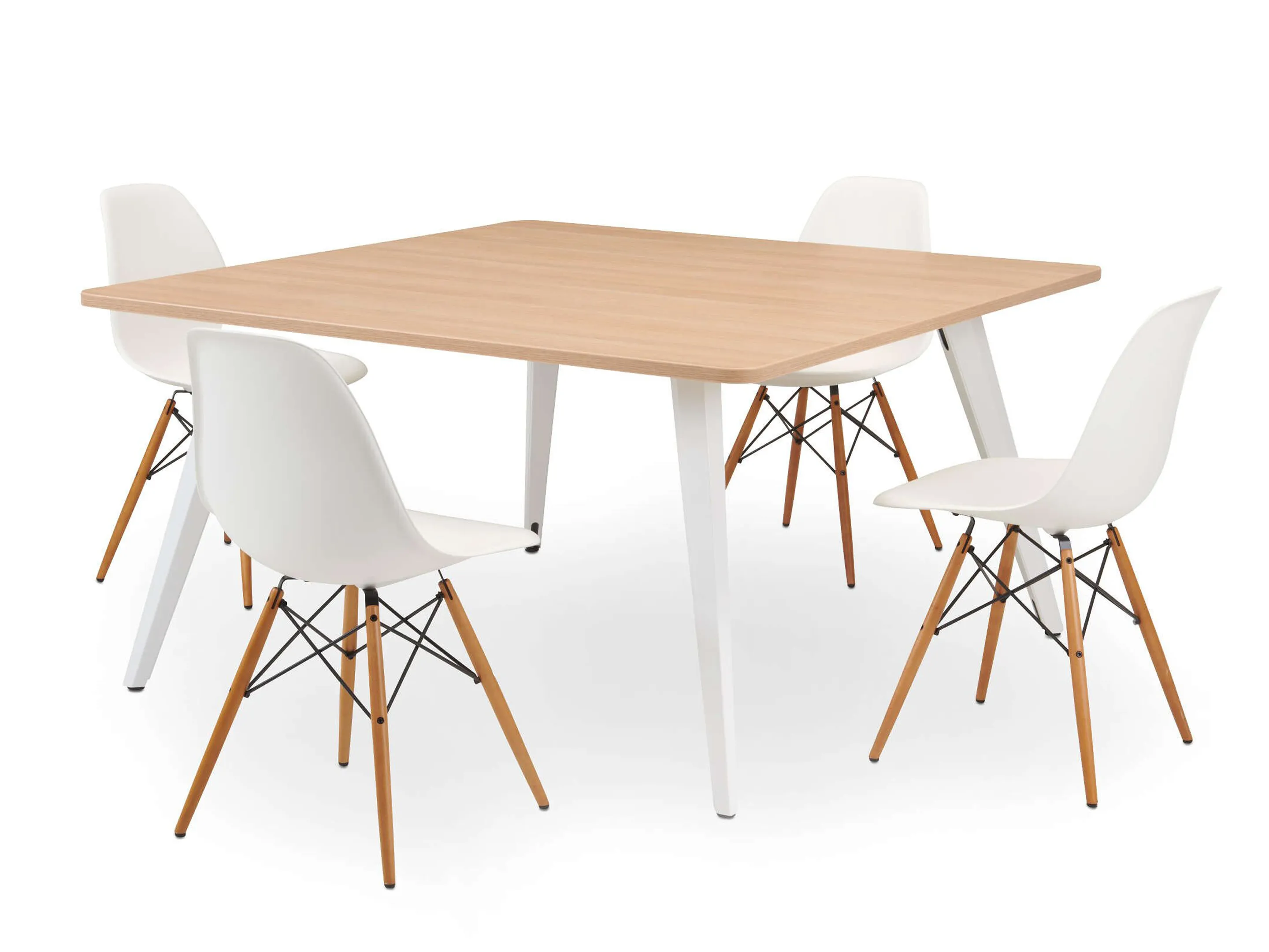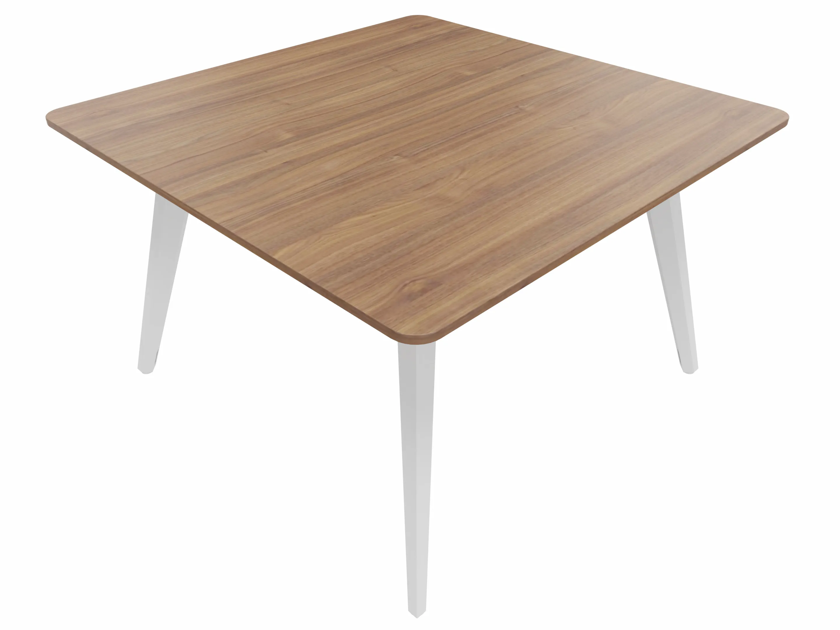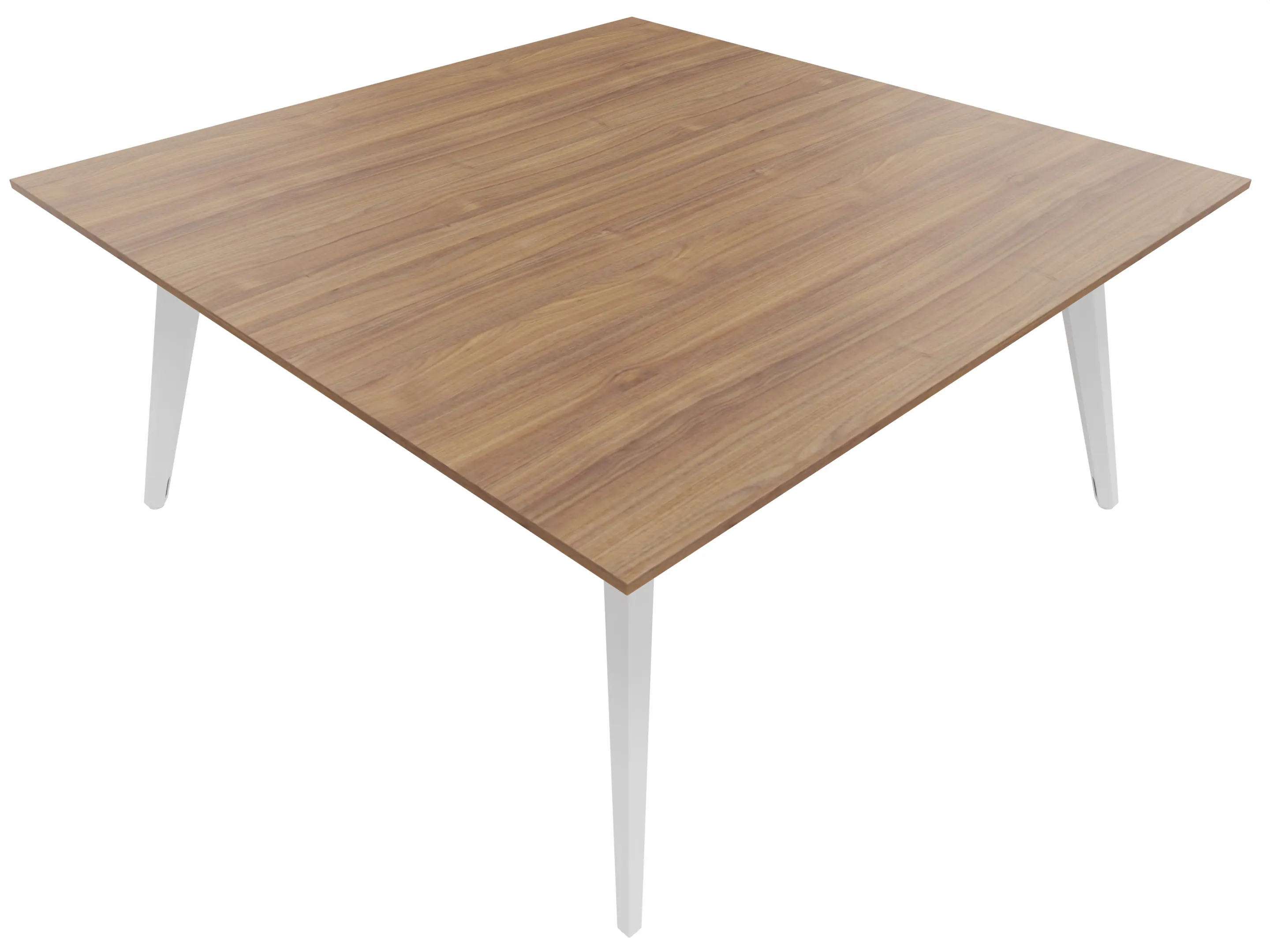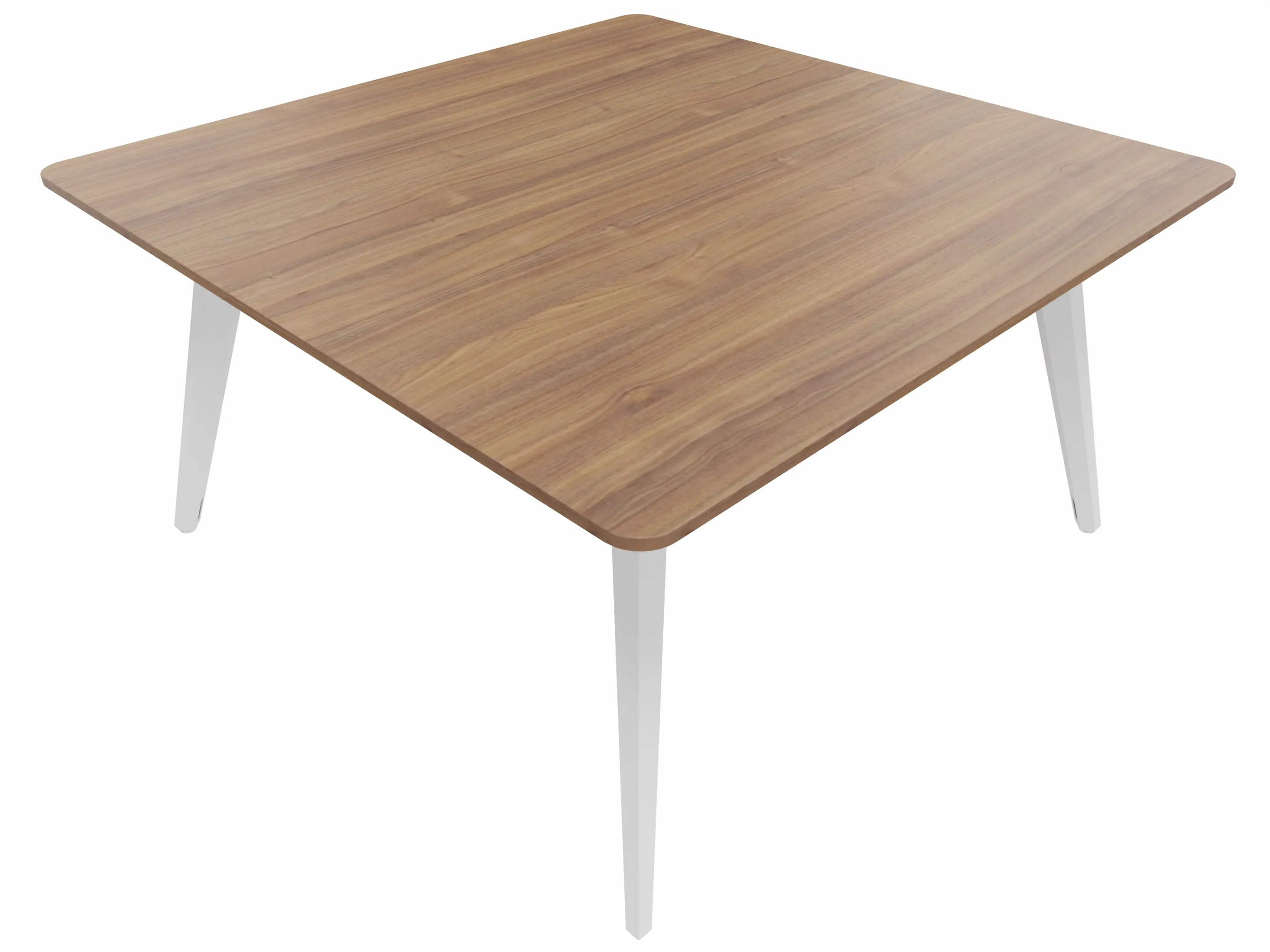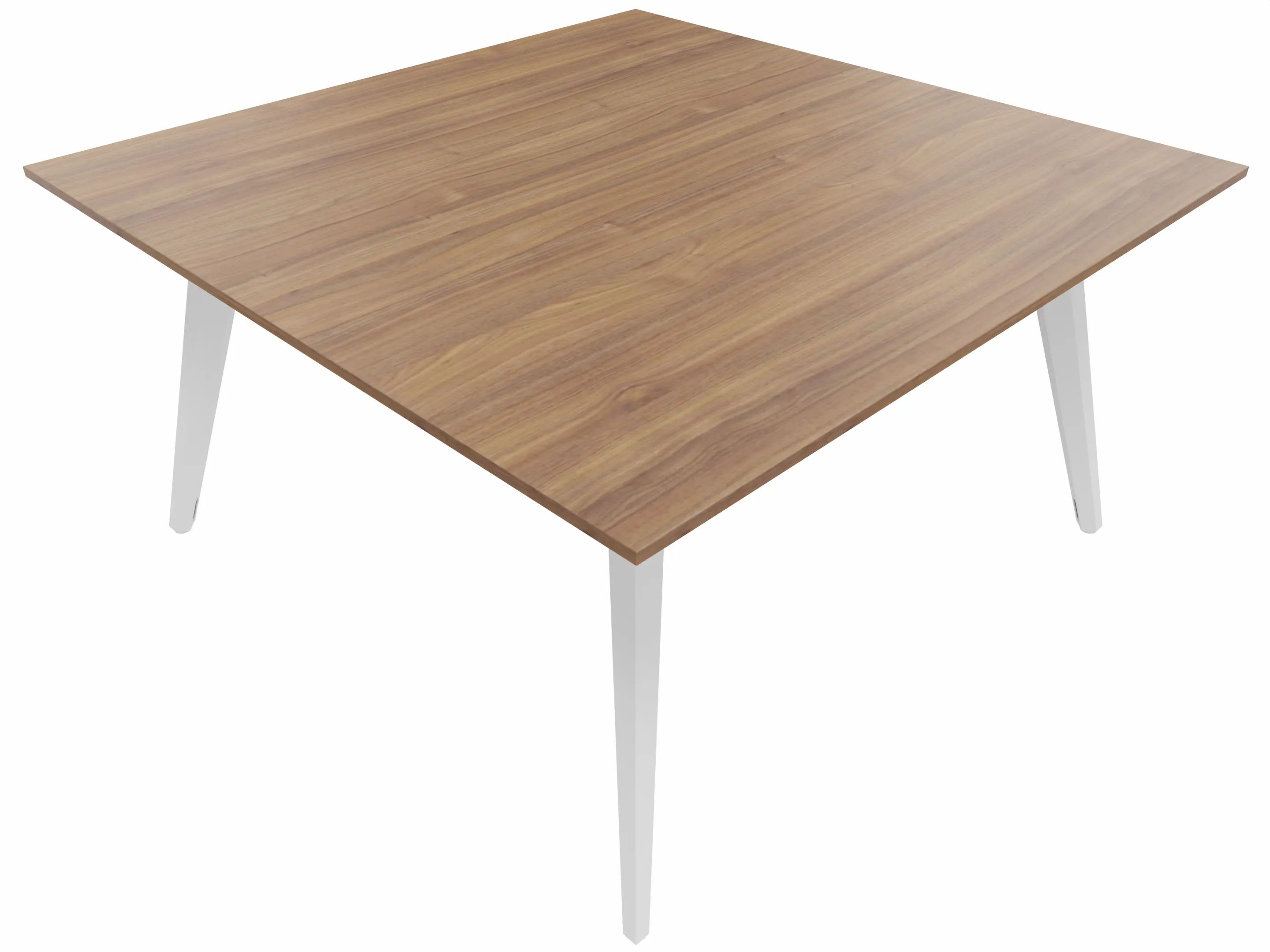 Vergadertafel met 4 schuine poten met kabelvoorziening en een vierkant blad. Afmeting: 1600 x 1600 x 740mm (BxHxD)