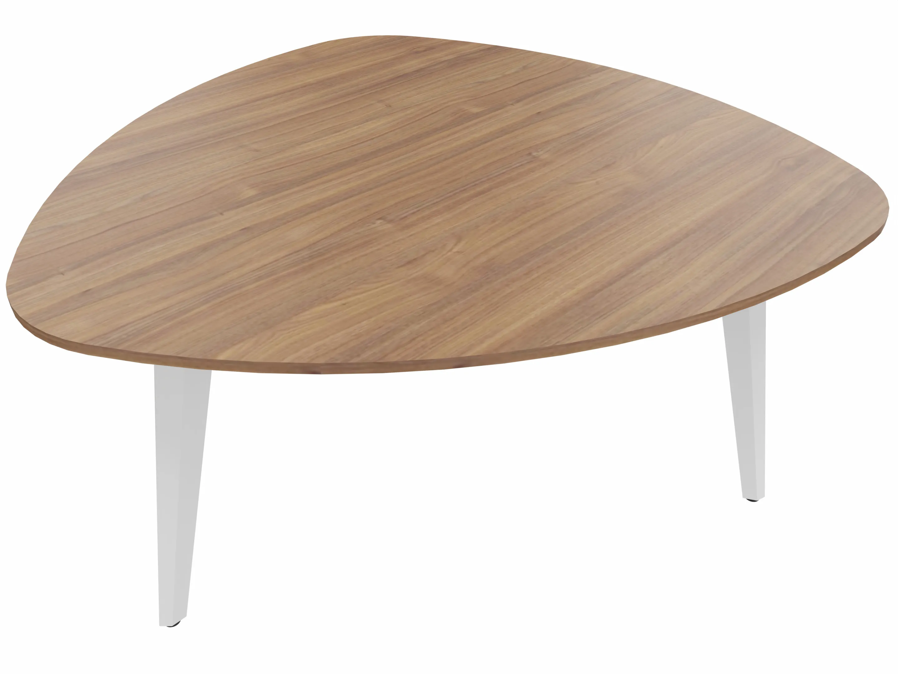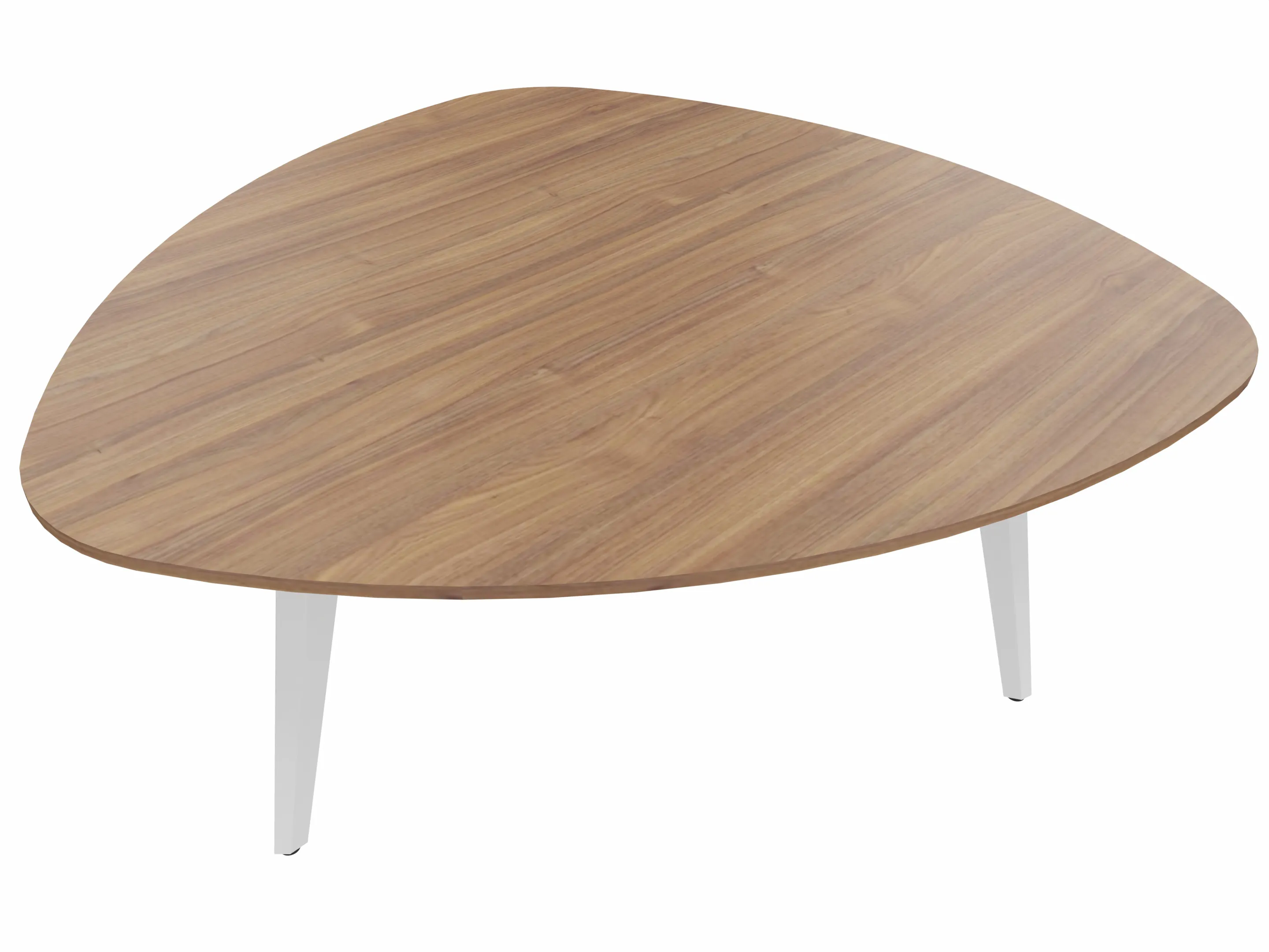 Vergadertafel met 3 schuine poten met kabelvoorziening en een trigoon blad. Afmeting: 1450 x 1450 x 740mm (BxHxD)