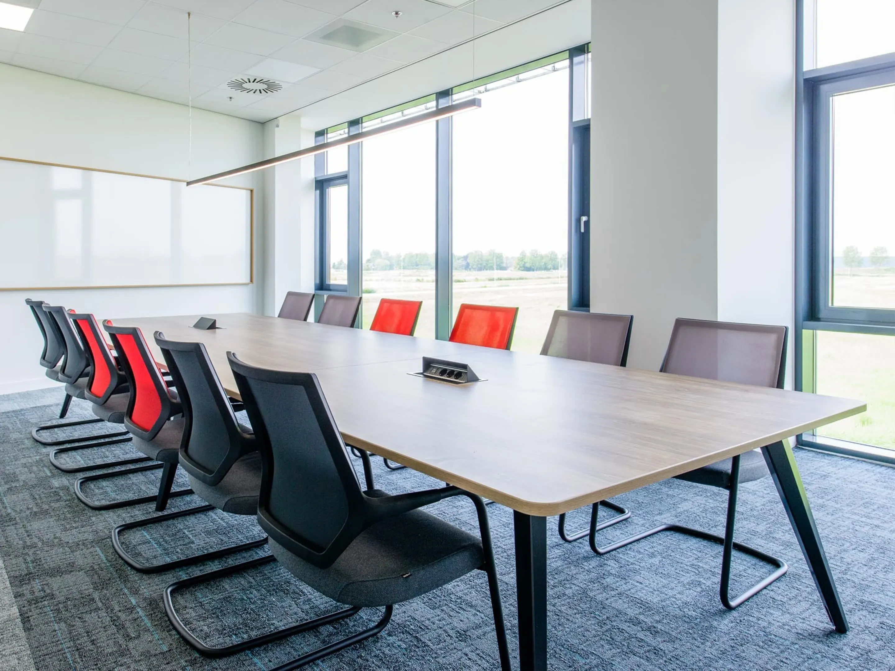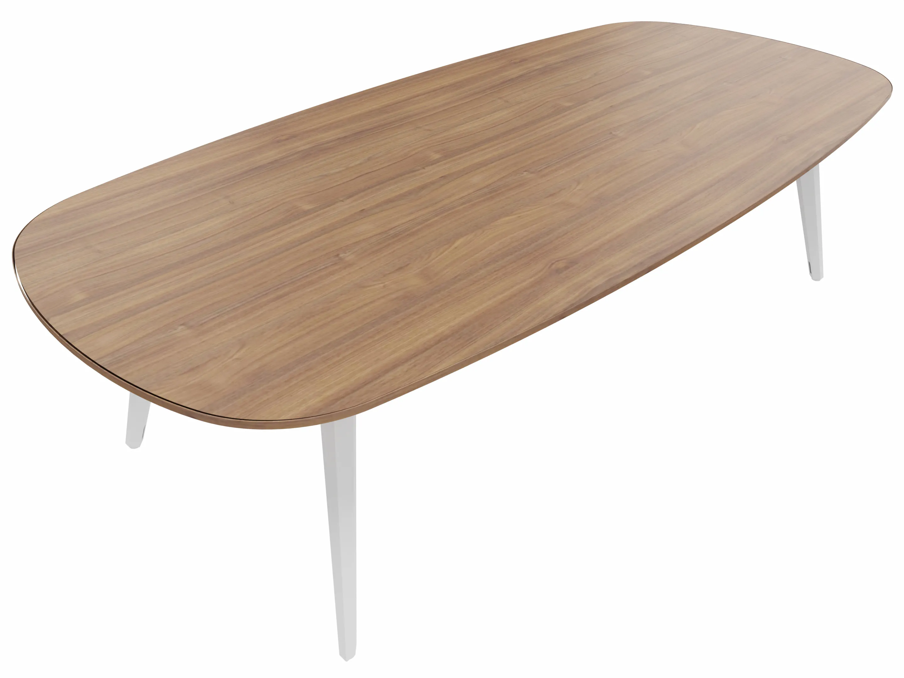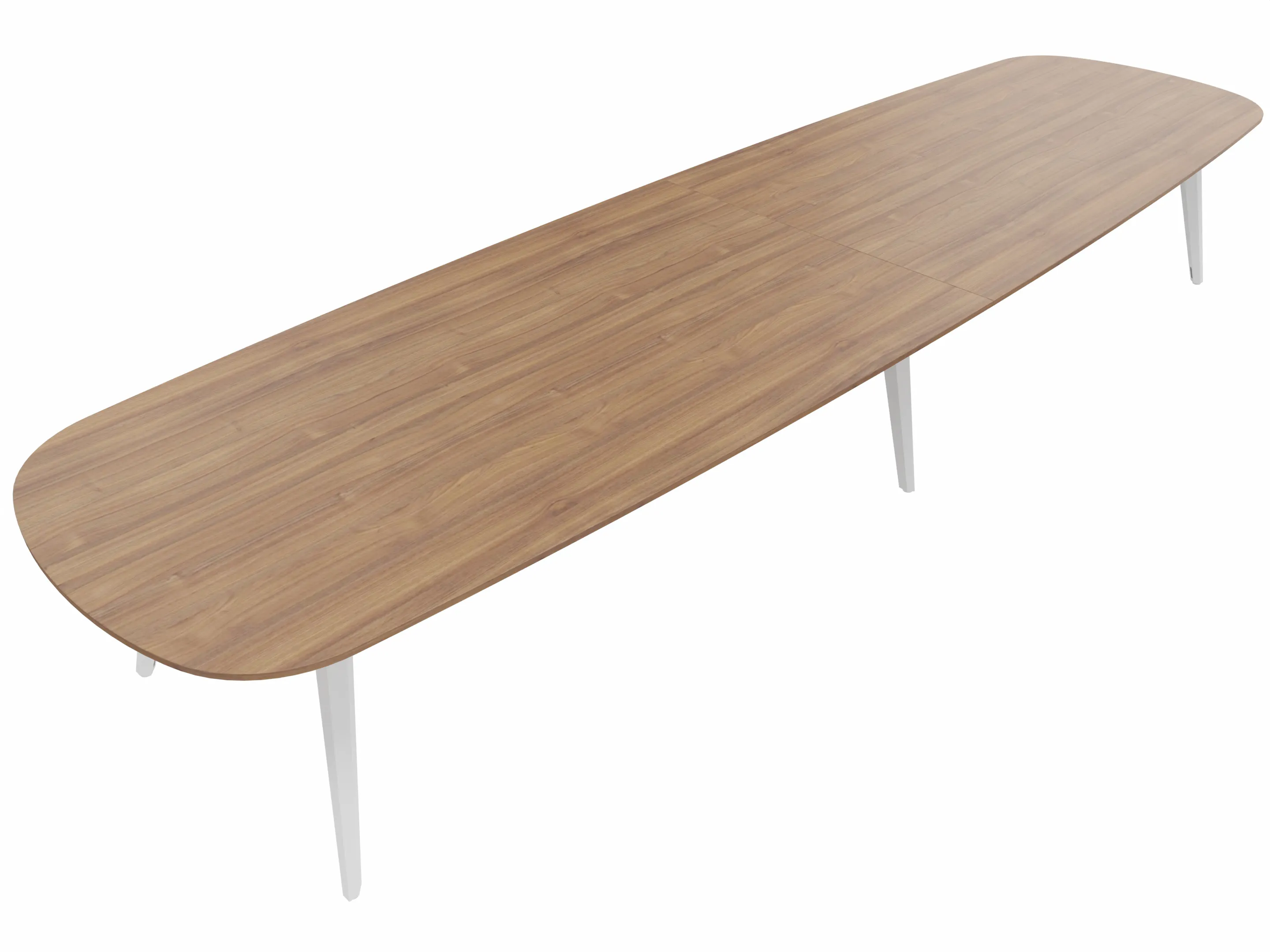Vergadertafel met 4 schuine poten met kabelvoorziening en een tonvormig blad. Afmeting: 3340 x 1290 x 740mm (BxHxD)