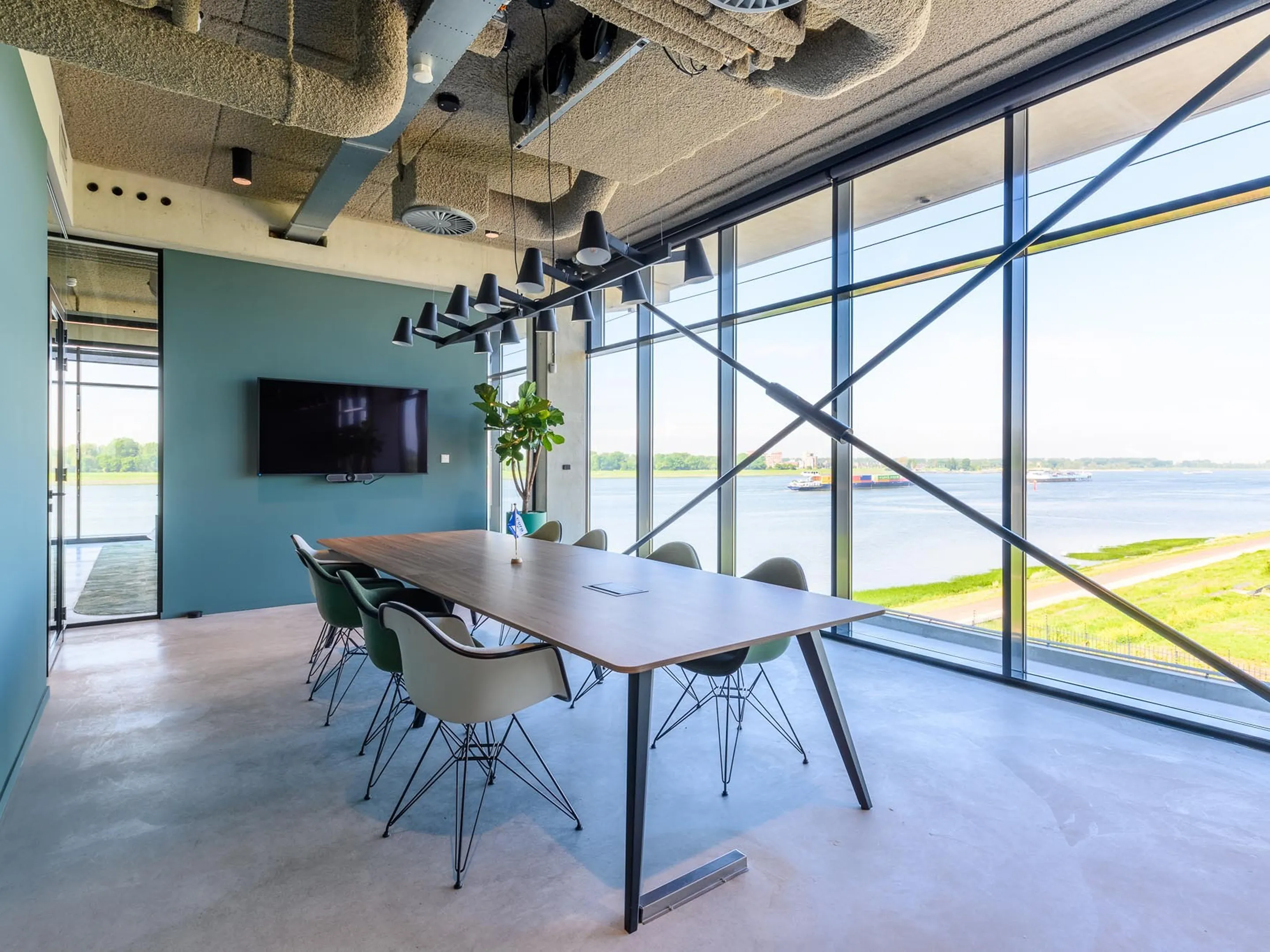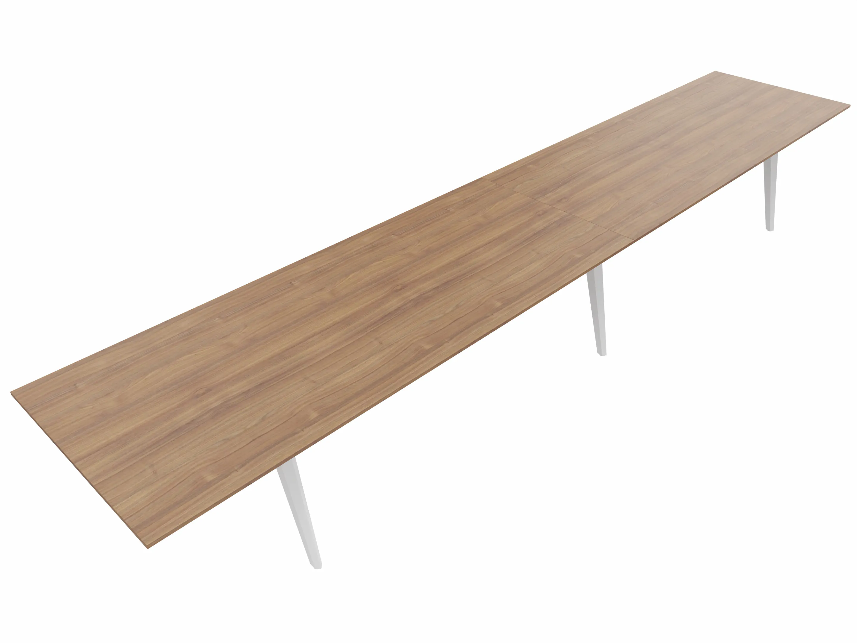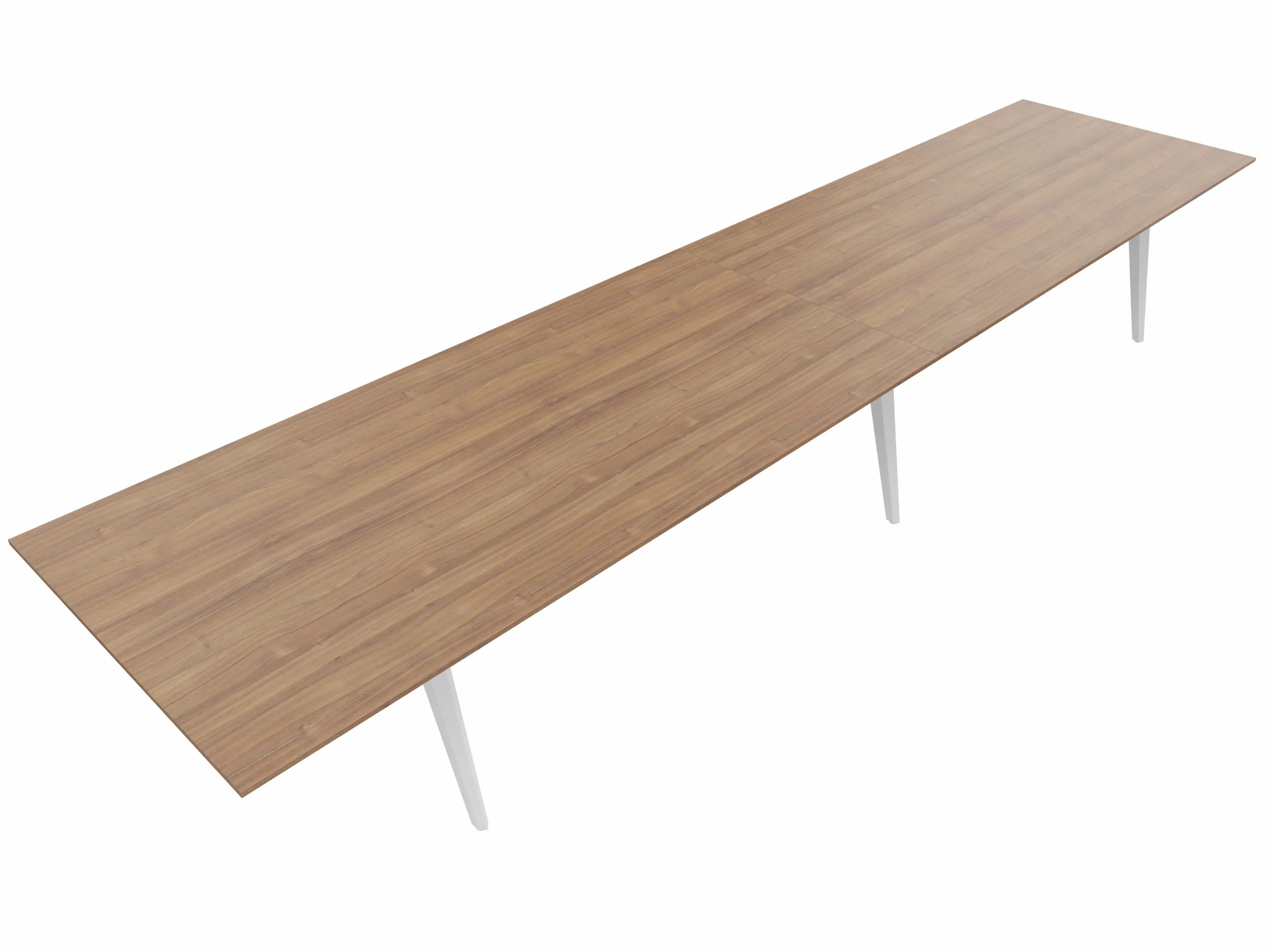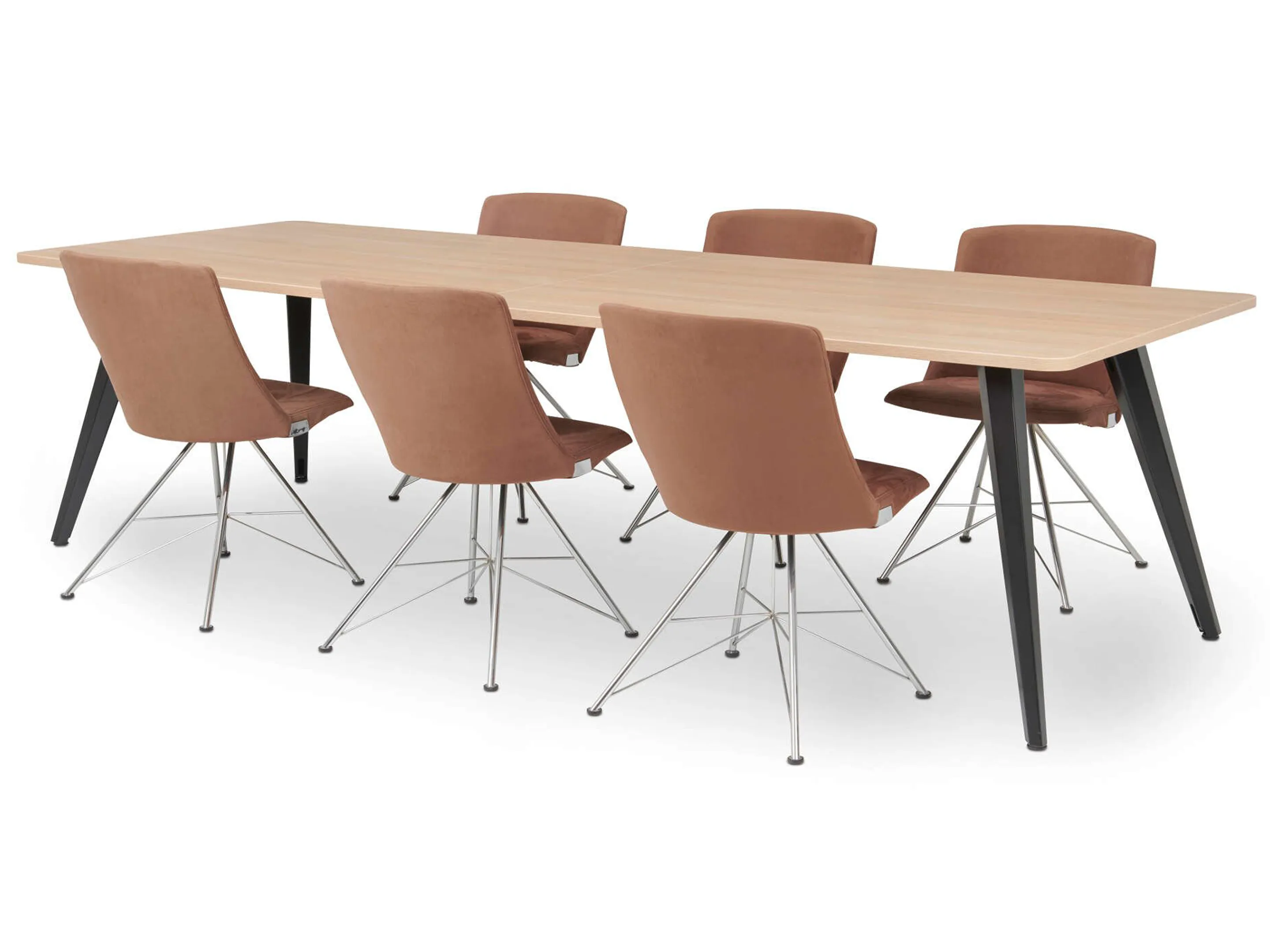 Vergadertafel met 6 schuine poten met kabelvoorziening en een rechthoekig blad. Afmeting: 4700 x 1600 x 740mm (BxHxD)