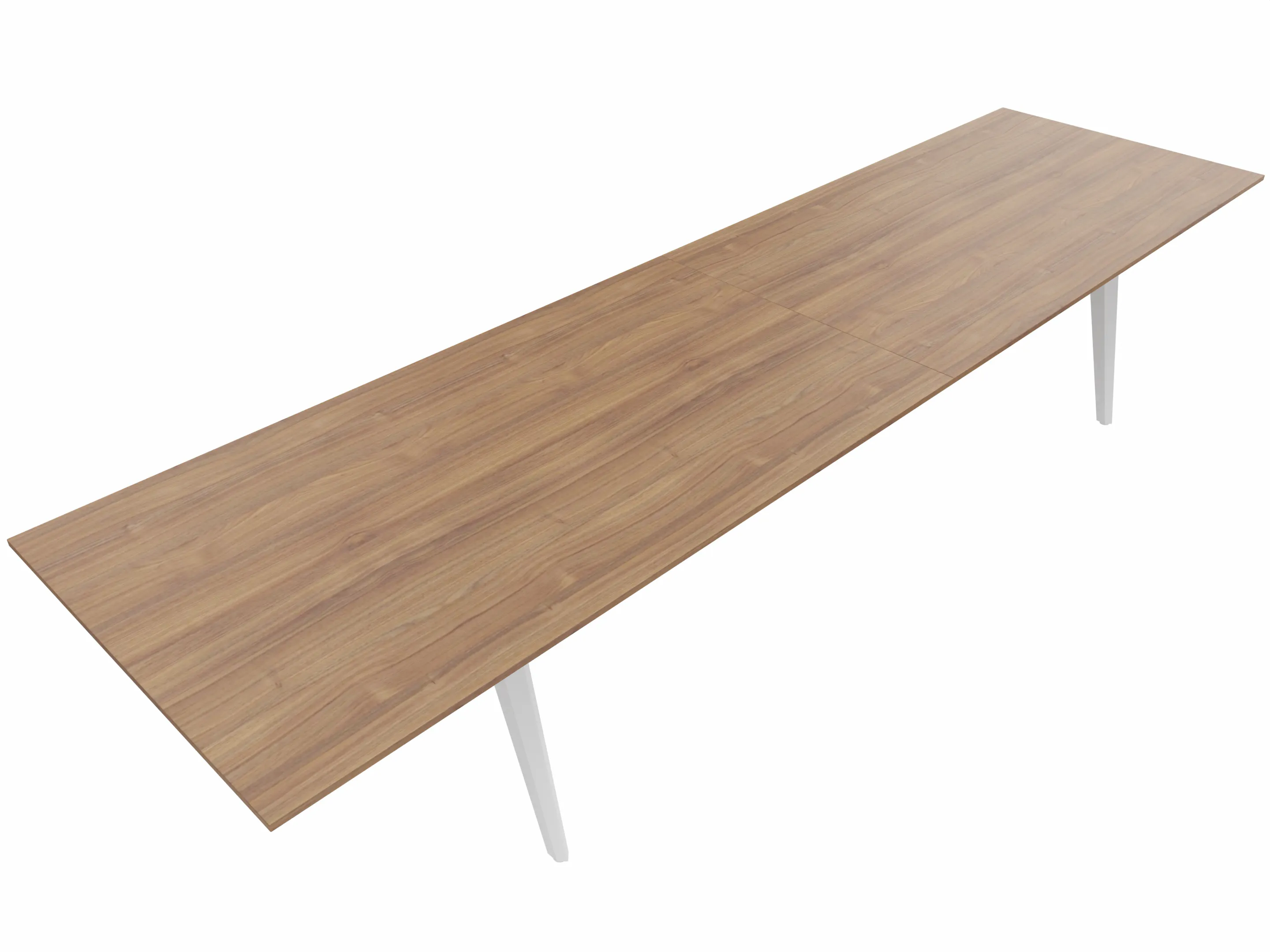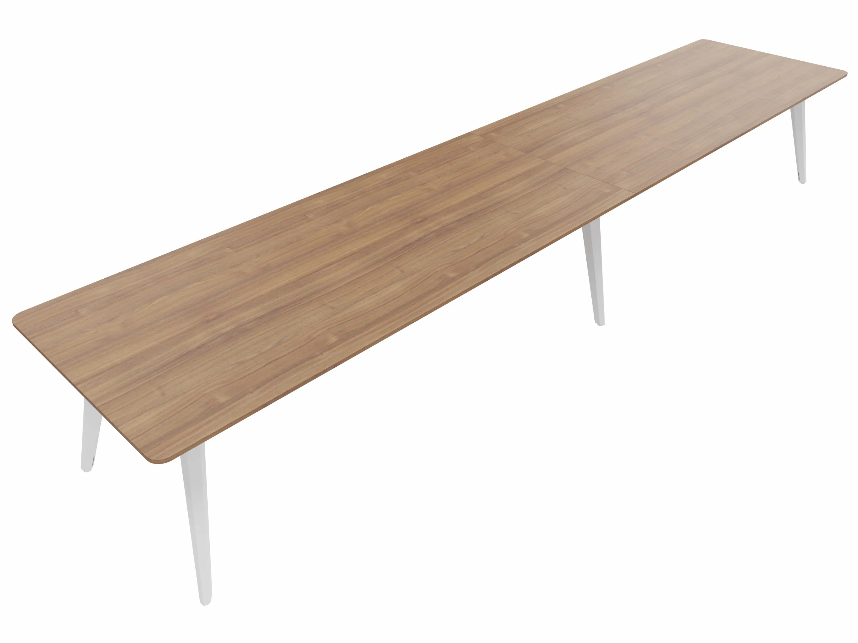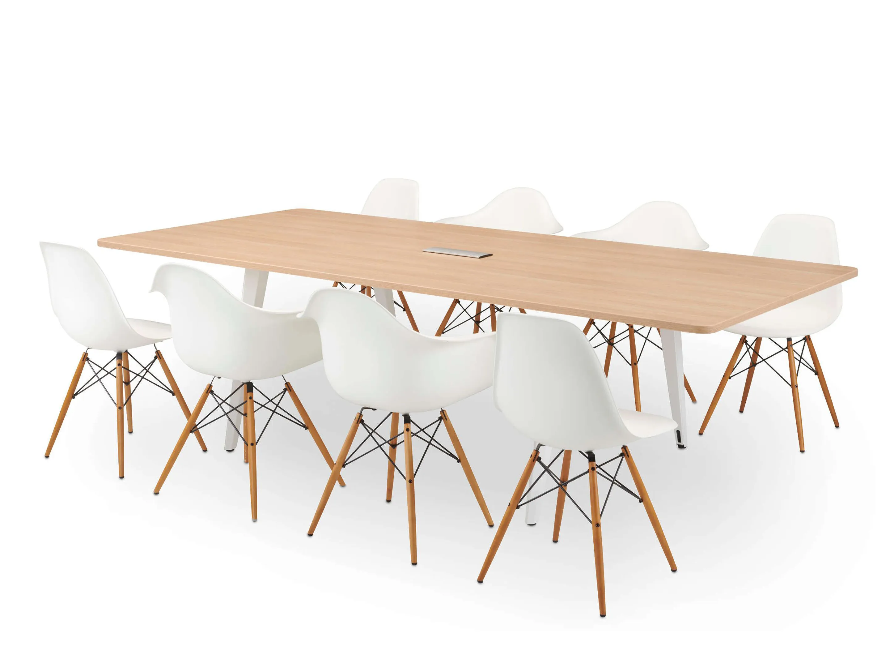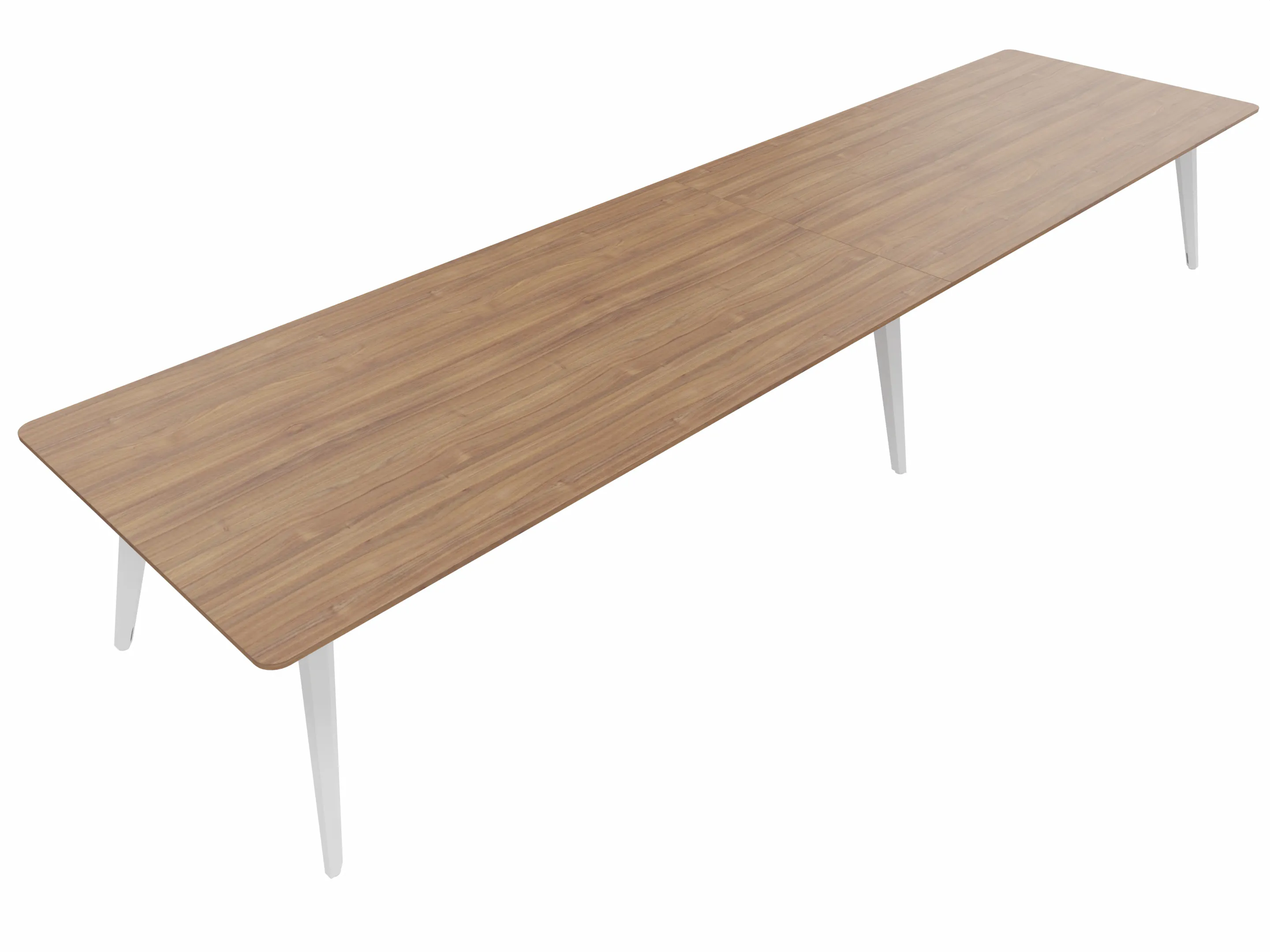 Vergadertafel met 6 schuine poten met kabelvoorziening en een rechthoekig blad. Afmeting: 3600 x 1000 x 740mm (BxHxD)