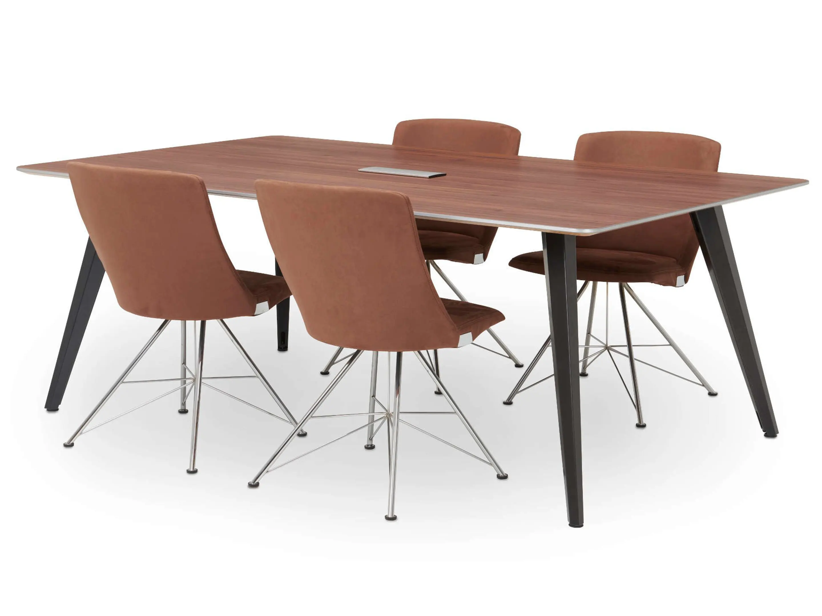 Vergadertafel met 4 schuine poten met kabelvoorziening en een rechthoekig blad. Afmeting: 3800 x 1000 x 740mm (BxHxD)