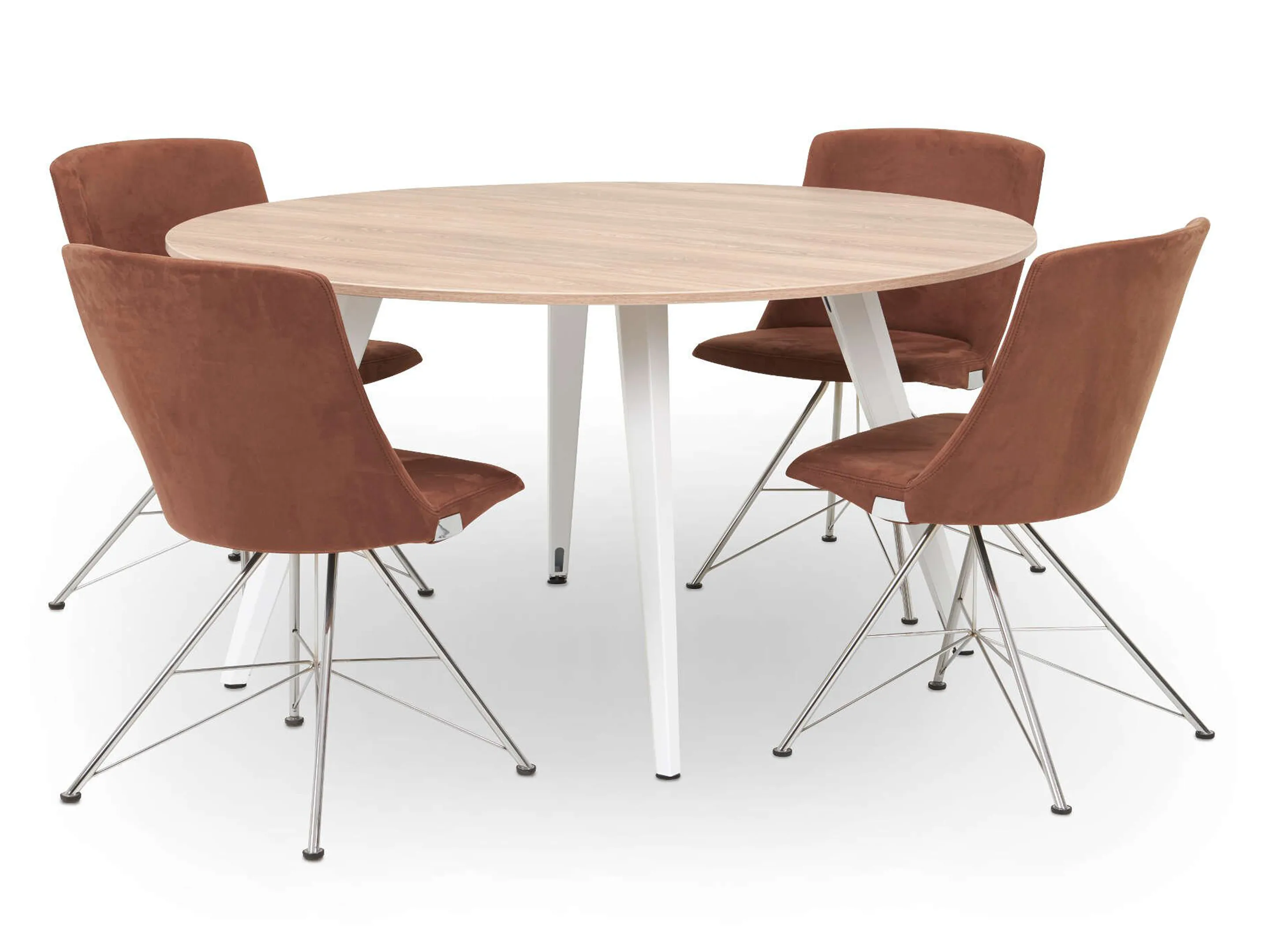 Vergadertafel met 4 schuine poten met kabelvoorziening en een rond blad. Afmeting: 1600 x 1600 x 740mm (BxHxD)