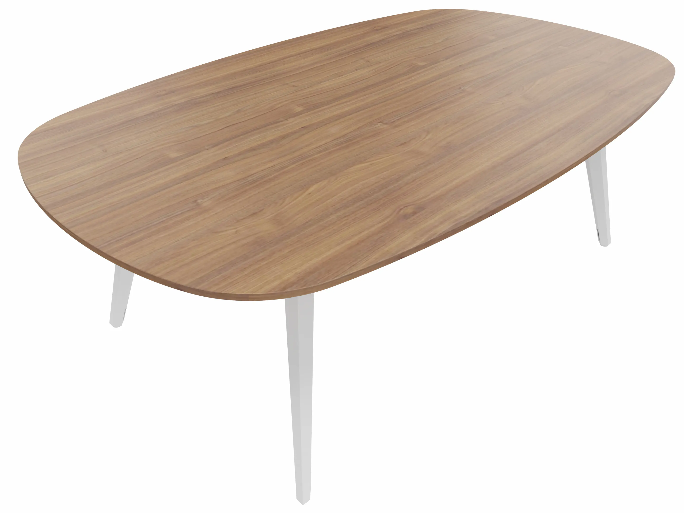 Vergadertafel met 4 schuine poten met kabelvoorziening en een tonvormig blad. Afmeting: 2140 x 1290 x 740mm (BxHxD)