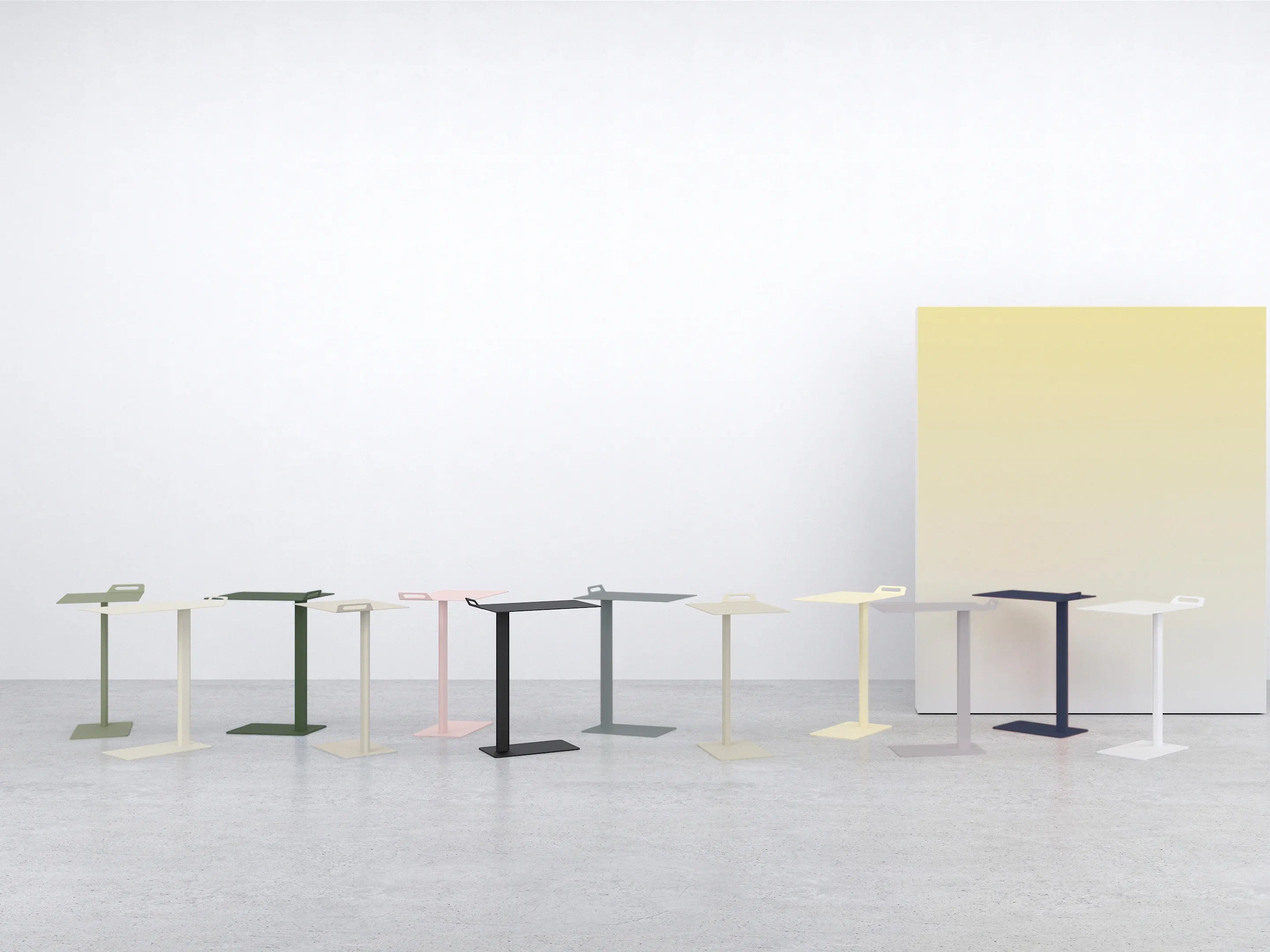 Stalen bijzettafel met handgreep om aan een bank of fauteuil te schuiven.