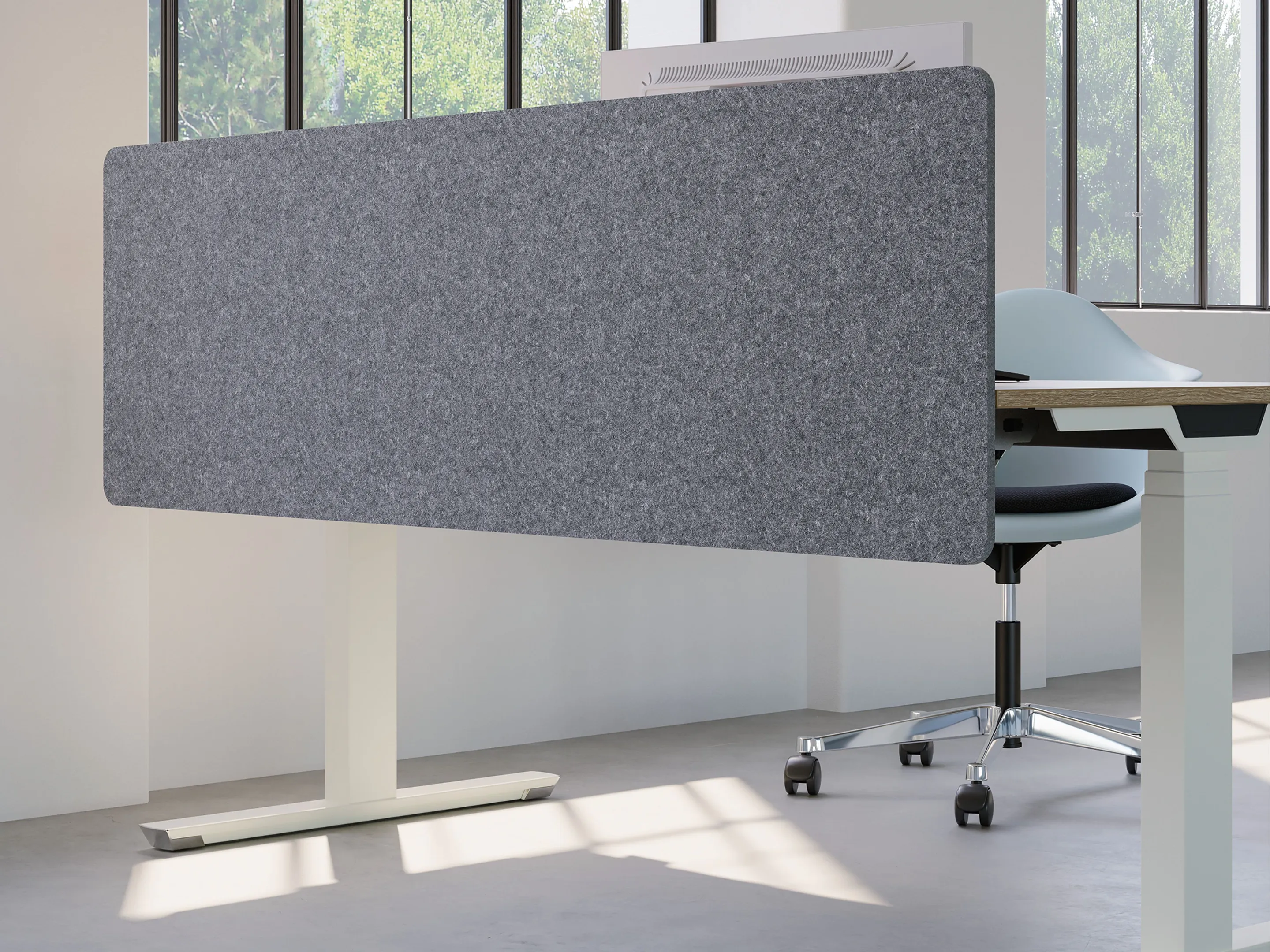 Complete screen inclusief bureaublad bevestiging. De wanden hebben overstek ten opzichte van de bladen (fly-over gemonteerd) van 117mm. Afmeting: 1000 x 400 x 12mm (BxDxH)