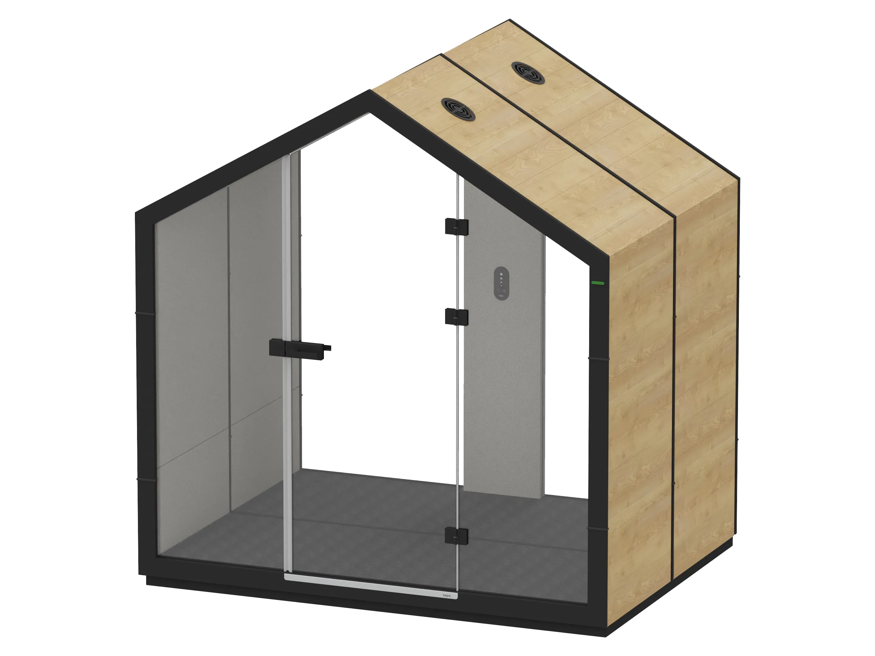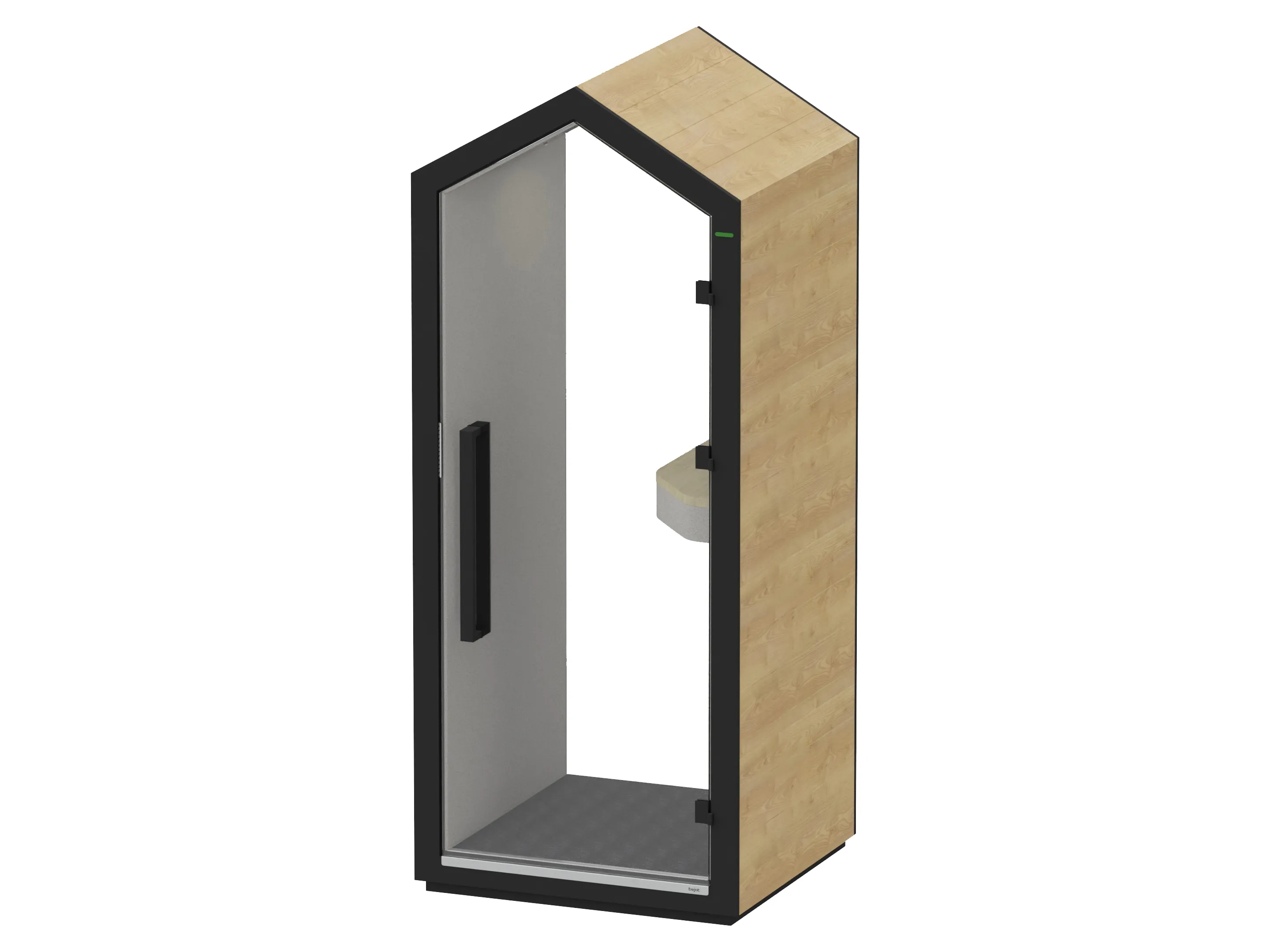 Half gesloten element voor 1 persoon, zonder zitplek met glazen deur, werkblad en 1 LED lamp. De ombouw is de vorm van een huis, binnenzijde gestoffeerd, buitenzijde zijn houten panelen en staat op transportwielen. Afmeting: 1000 x 2425 x 1000mm (BxHxD).