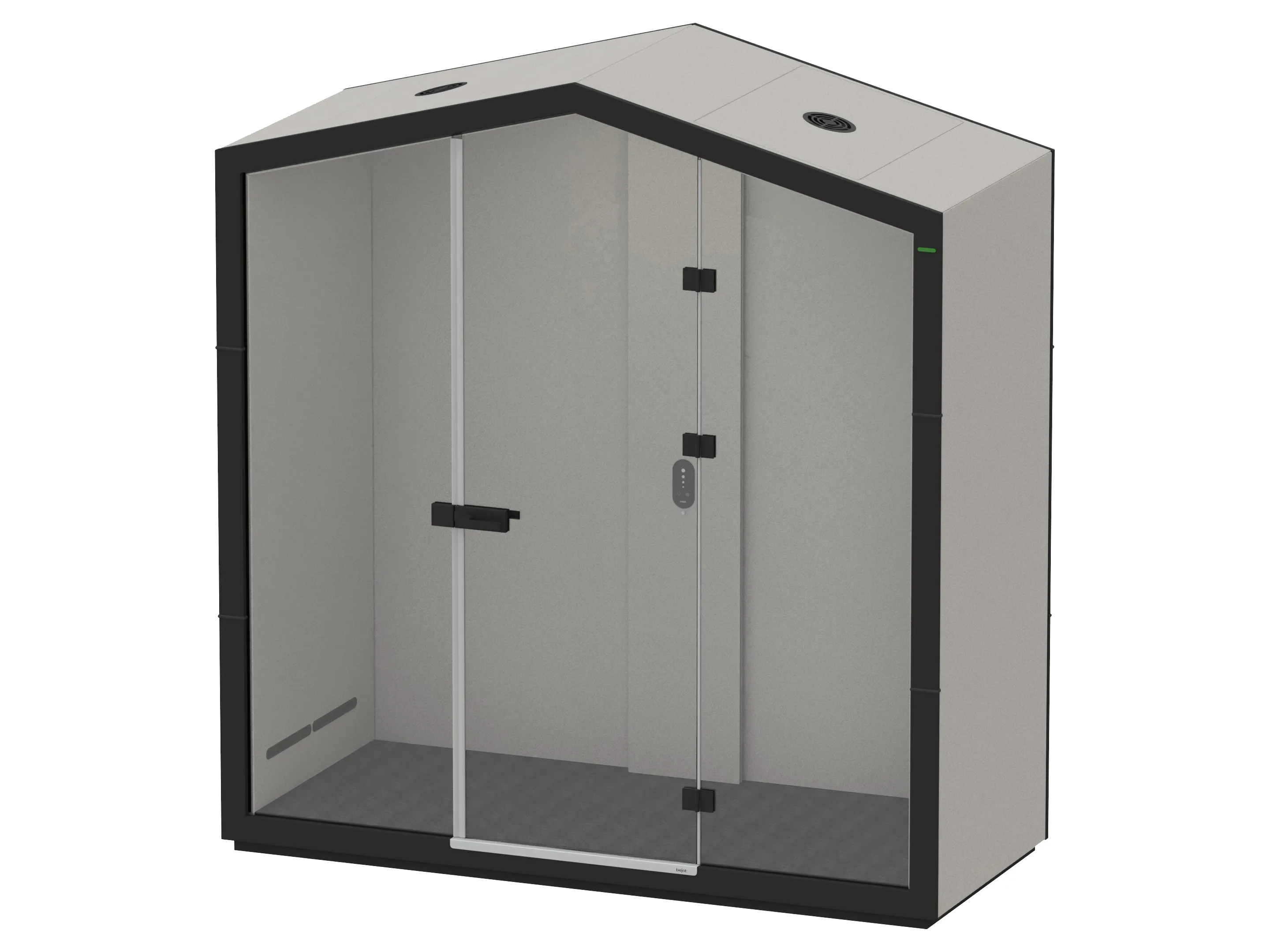 Half gesloten zitelement voor 2 personen met glazen deur met multimedia paneel, zonder inrichting. De ombouw is in de vorm van een huis en is volledig gestoffeerd en staat op glijders. Afmeting: 2260 x 2425 x 1000mm (B x H x D).