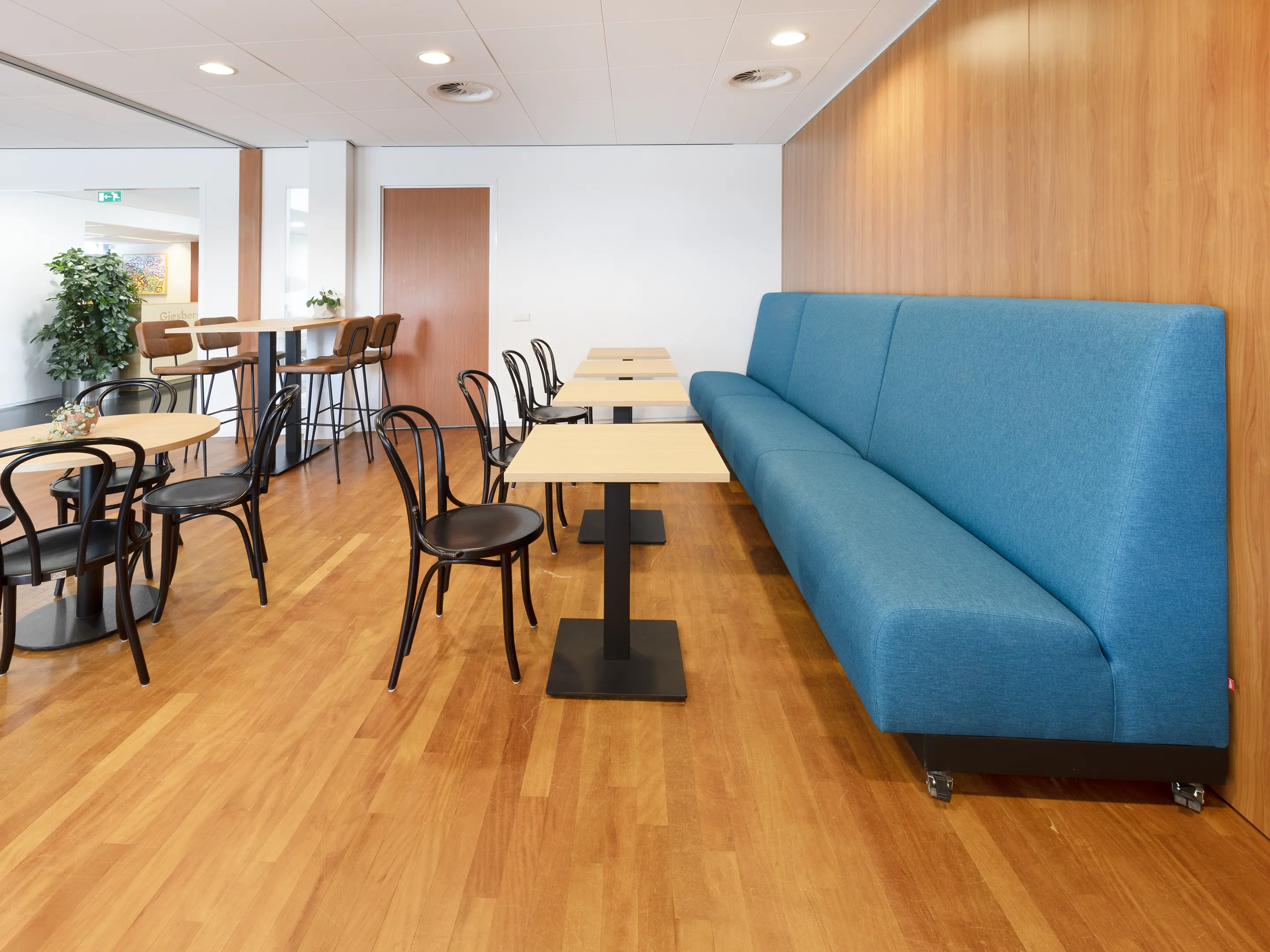 Treinbank in dubbele rug-aan-rug uitvoering met sokkel in afmeting : 1600 x 1400 x 1500mm (BxHxD). Standaard zithoogte is 460mm.