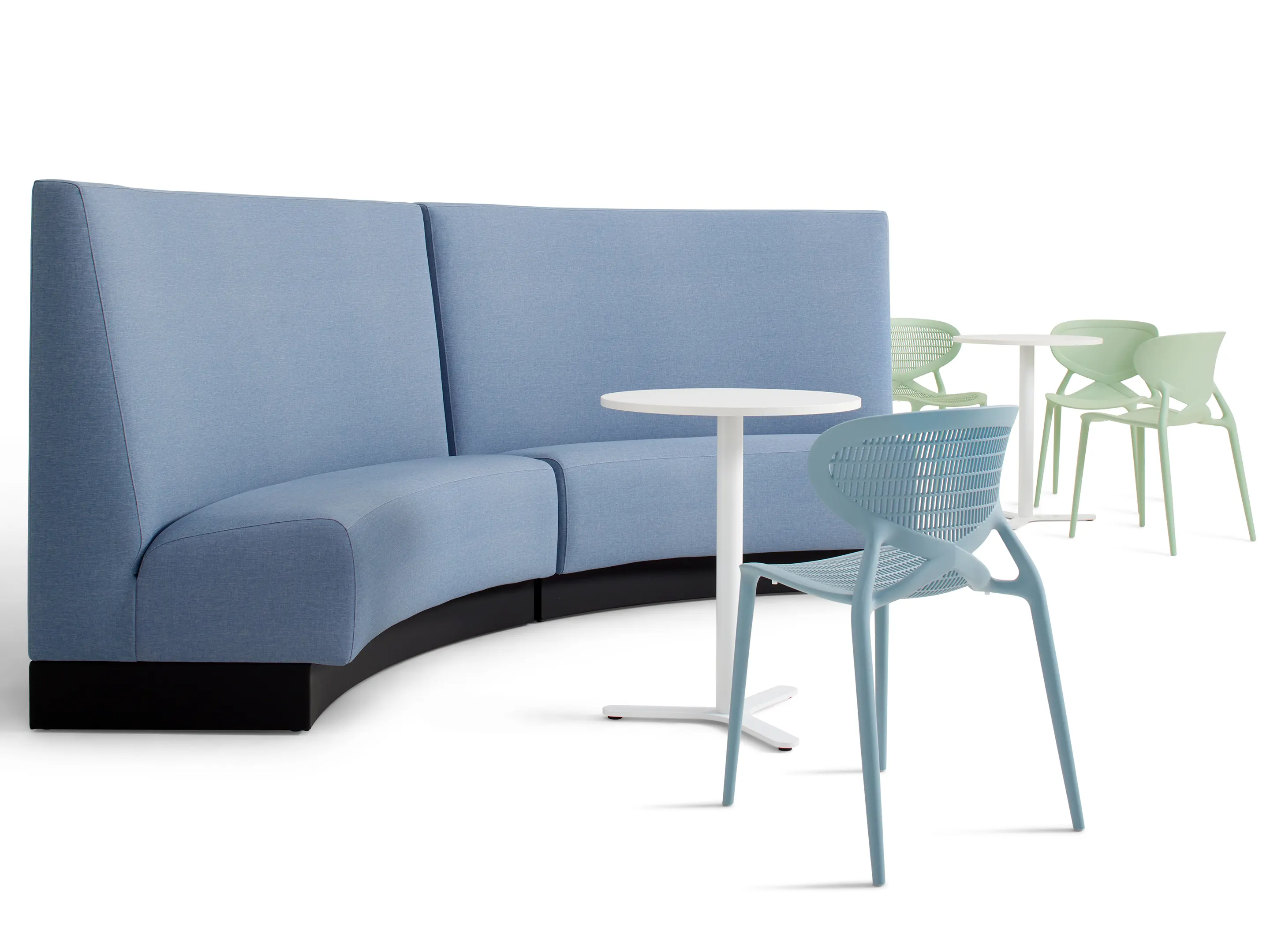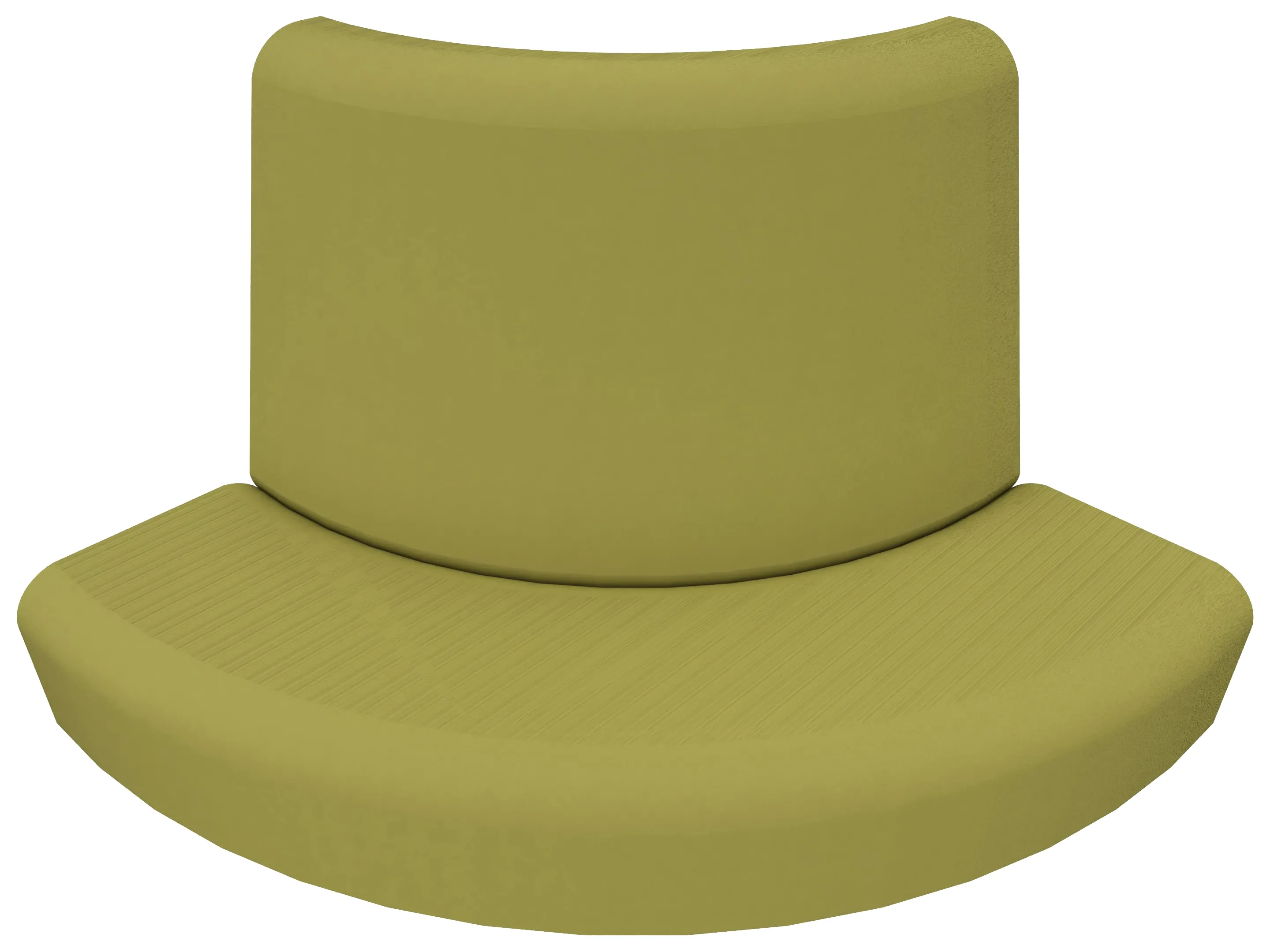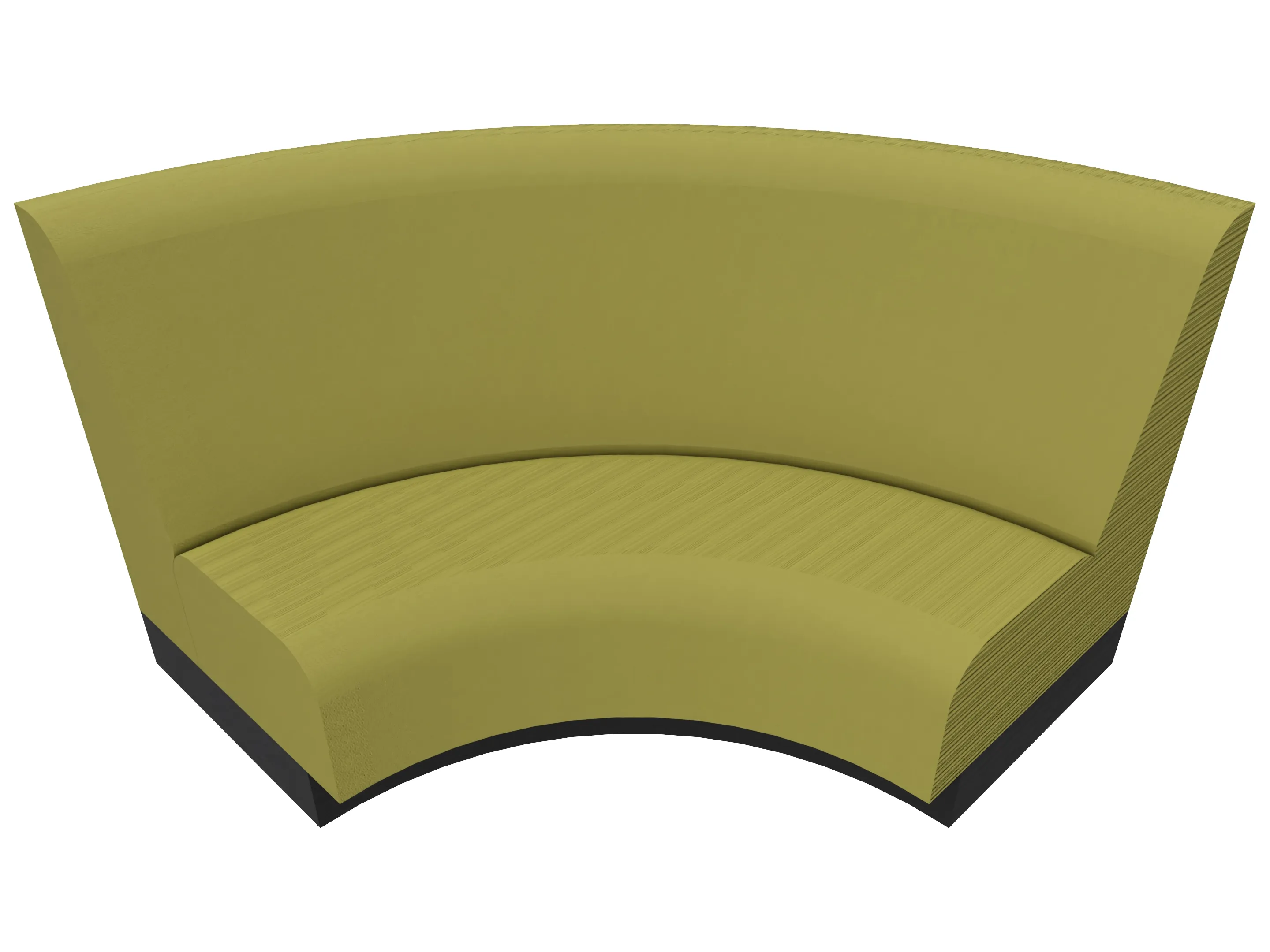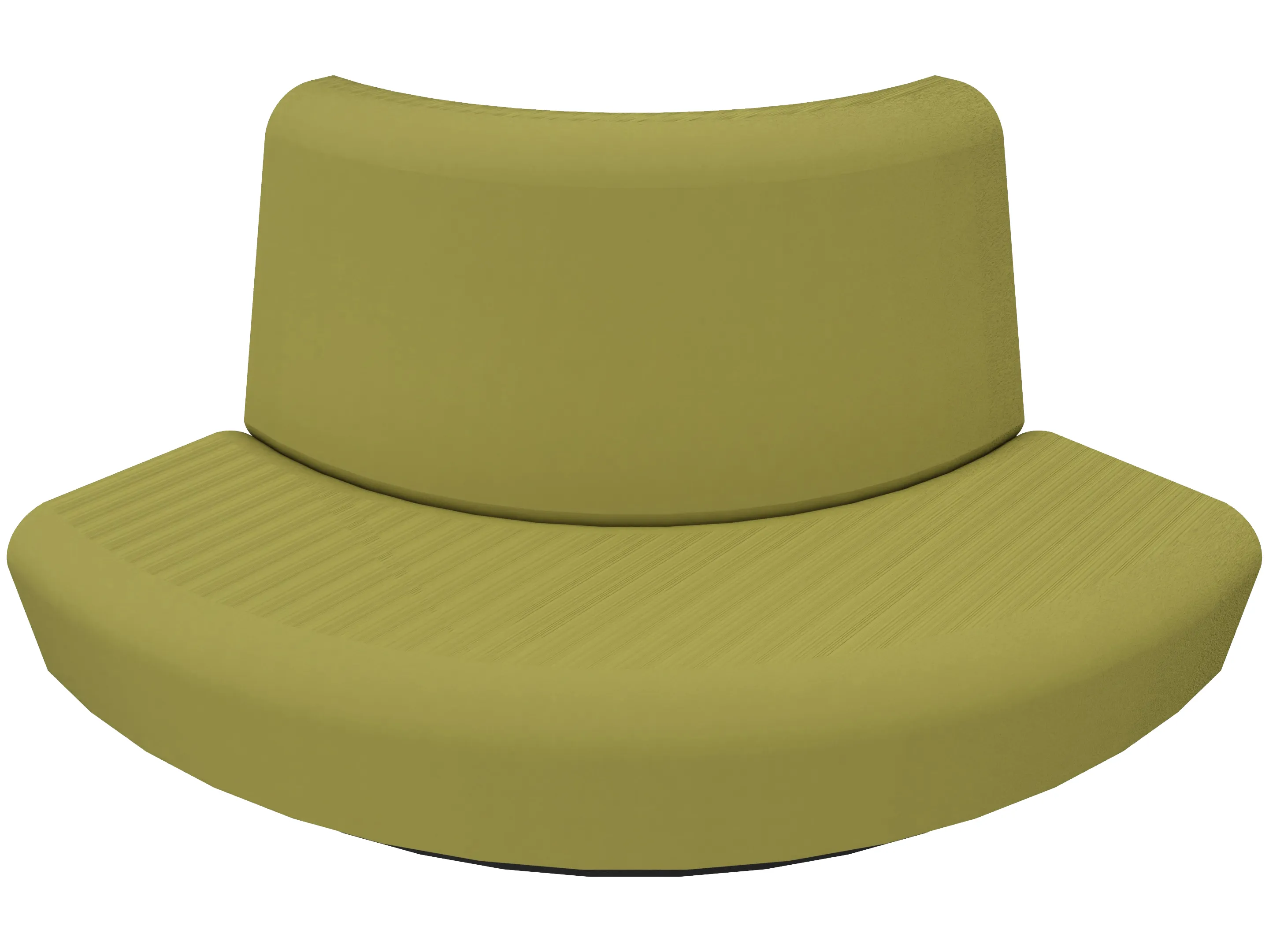 Treinbank met sokkel in een kwartronde vorm voor het maken van binnenbochten (rugleuning aan de lange zijde). Buitendiameter is 2840mm, binnendiameter is 1400mm. Rughoogte: 1000mm, diepte: 720mm. Standaard is de zithoogte 460mm.