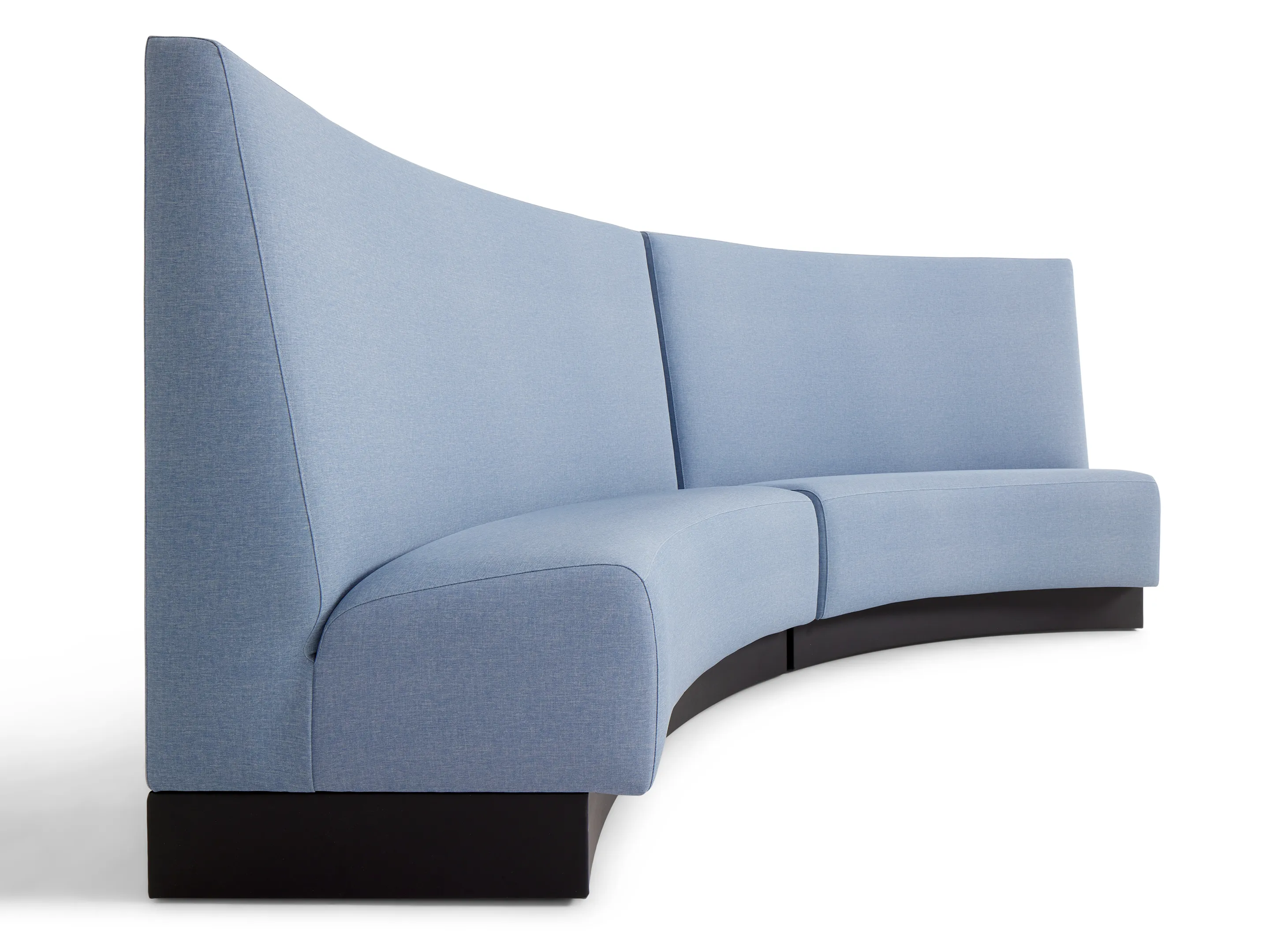 Treinbank met sokkel in een kwartronde vorm voor het maken van binnenbochten (rugleuning aan de lange zijde). Buitendiameter is 2840mm, binnendiameter is 1400mm. Rughoogte: 1200mm, diepte: 720mm. Standaard is de zithoogte 460mm.