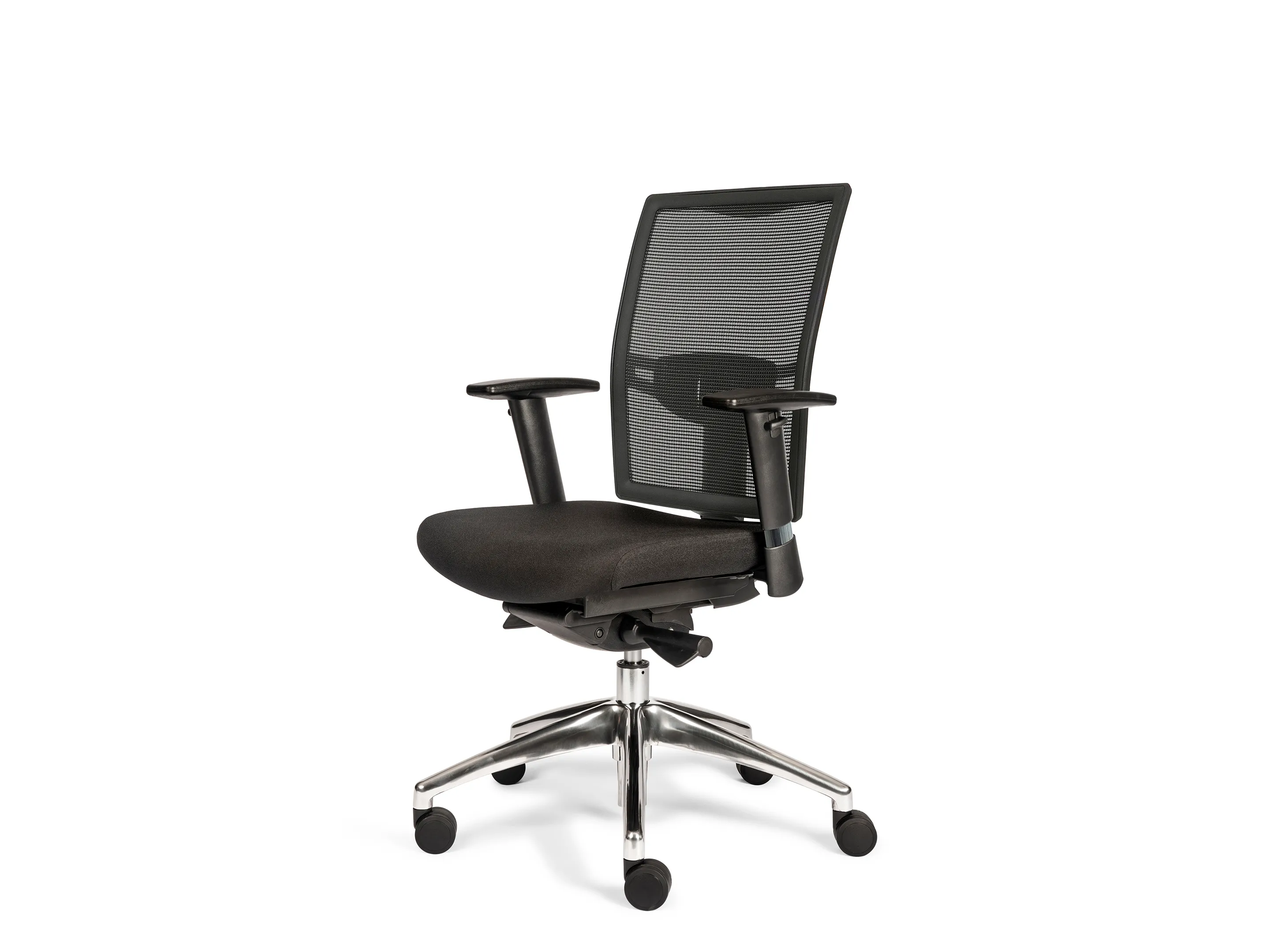 In hoogte verstelbare lendensteun, Zitting 7cm verstelbaar, Gestoffeerde comfort zitting, In hoogte-, breedte- en diepte verstelbare schuine armleggers, Multifunctionele wielen 60mm, Automatische gewichtsregeling.