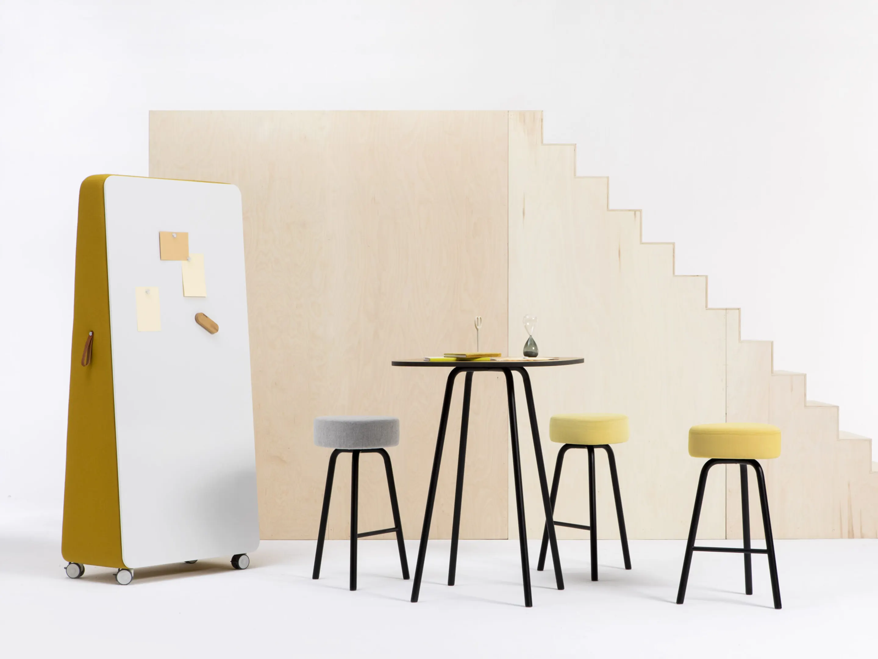 Verrijdbare akoestische ruimteverdeler met aan twee zijdes een whiteboad, voor zien van wielen. Uitgevoerd als "standaard akoestisch". Afmeting: 900 x 450 x 1930mm (BxDxH).