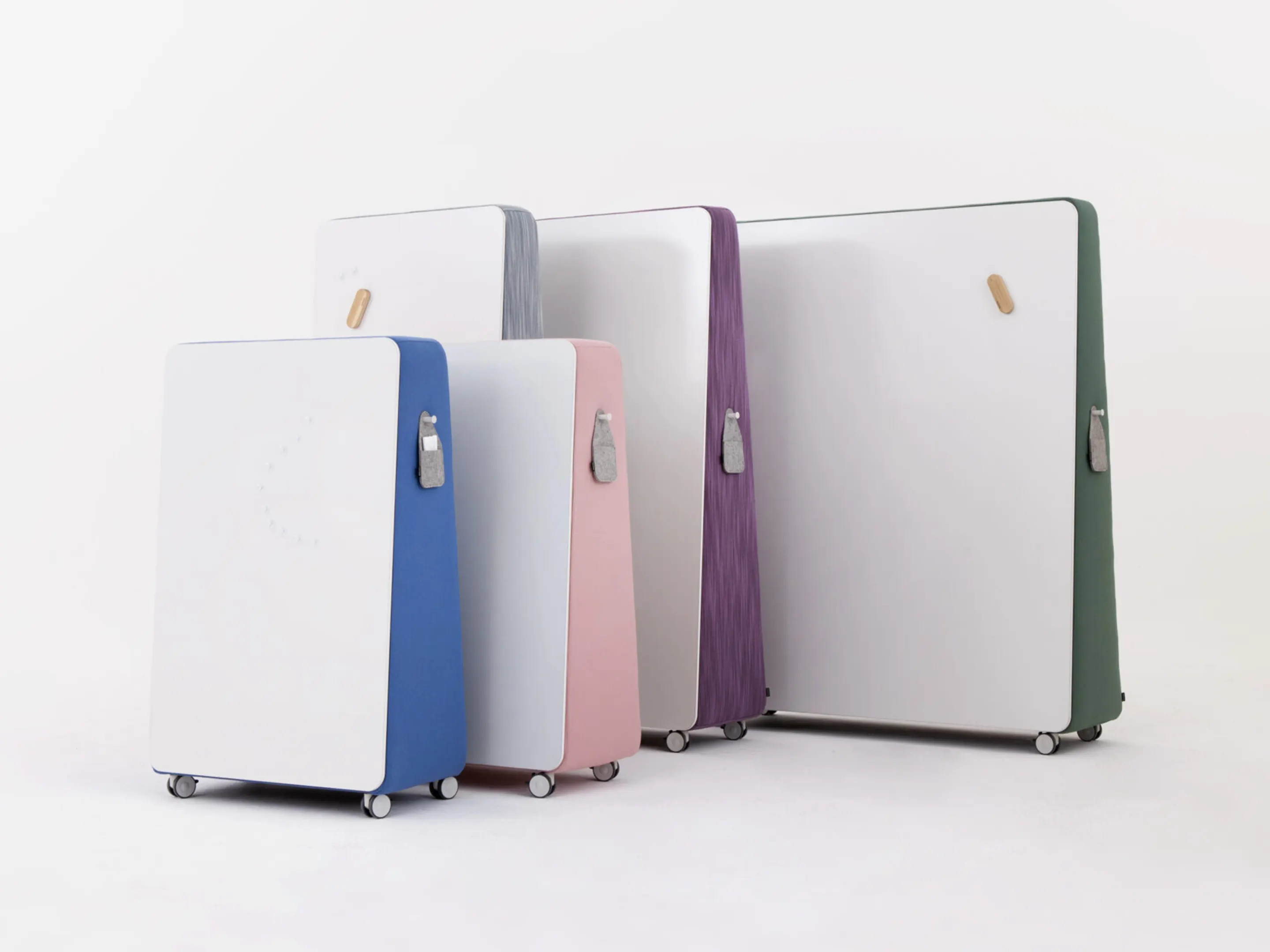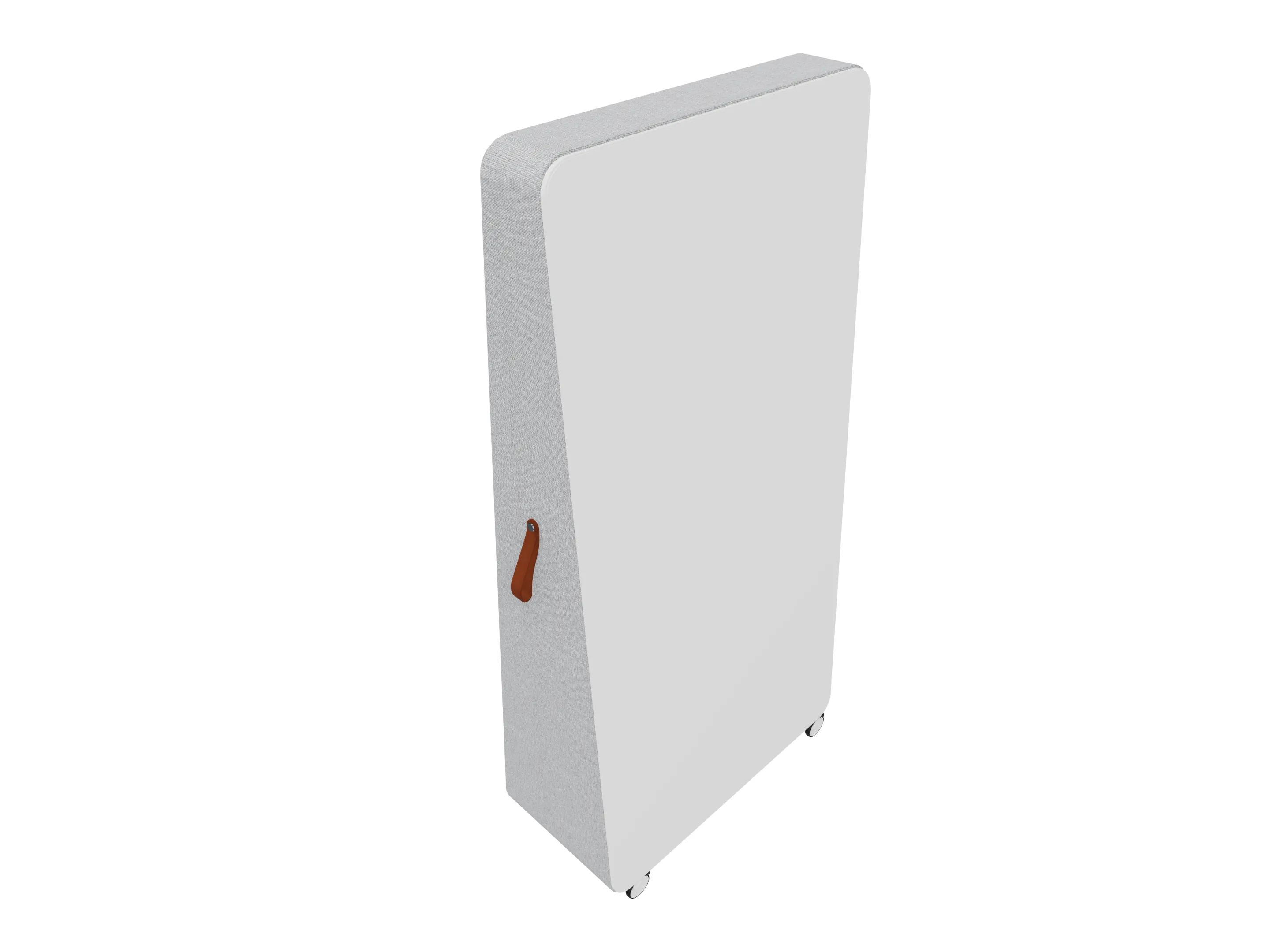 Verrijdbare akoestische ruimteverdeler met aan twee zijdes een whiteboad, voor zien van wielen. Uitgevoerd als "standaard akoestisch". Afmeting: 900 x 450 x 1430mm (BxDxH).