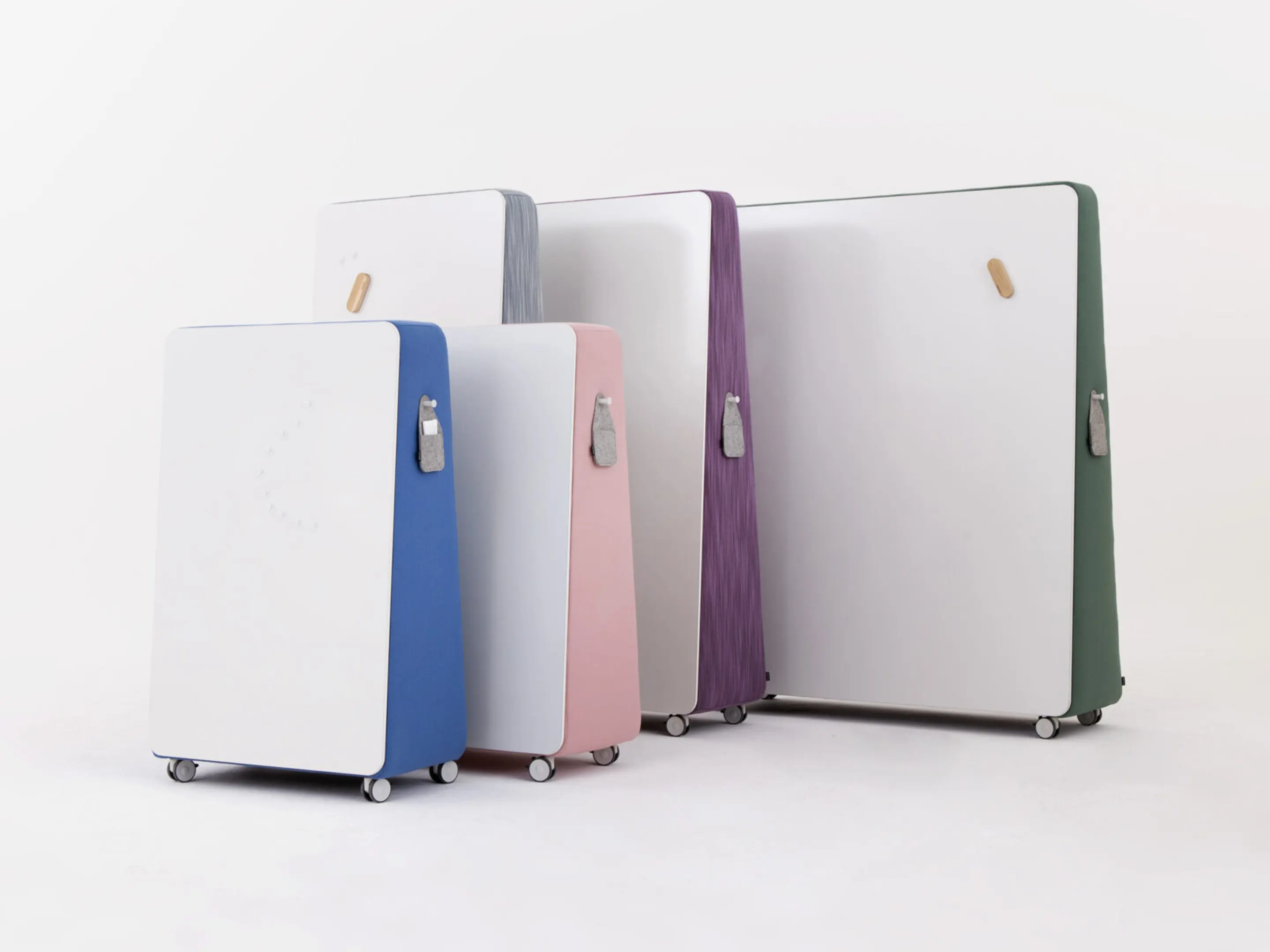 Verrijdbare akoestische ruimteverdeler, voor zien van wielen. Uitgevoerd als "standaard akoestisch". Afmeting: 900 x 450 x 1430mm (BxDxH).