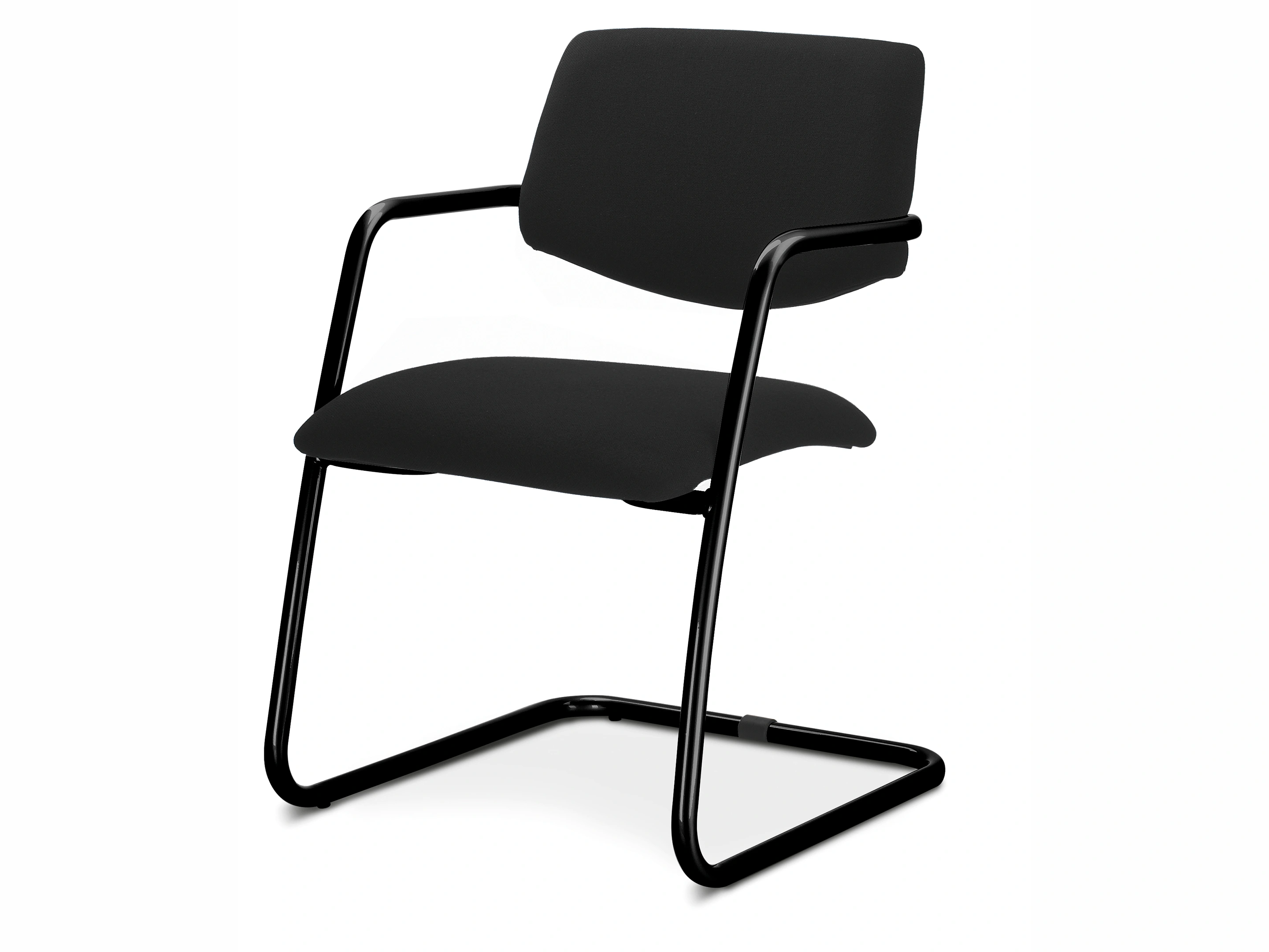 Vergaderstoel Uni met een volledig gestoffeerde zitting en medium hoge rug, op matzwart sledeframe voorzien van armleggers. Gestoffeerd in stofgroep BN01 (zwart).