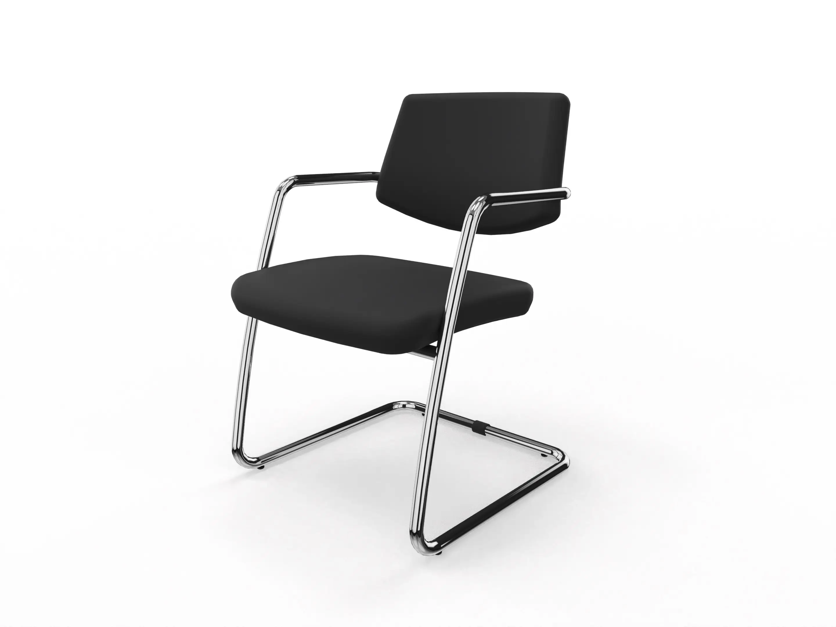 Vergaderstoel Uni met een volledig gestoffeerde zitting en hoge rug, op chrome sledeframe voorzien van armleggers. Gestoffeerd in stofgroep BN01 (zwart).