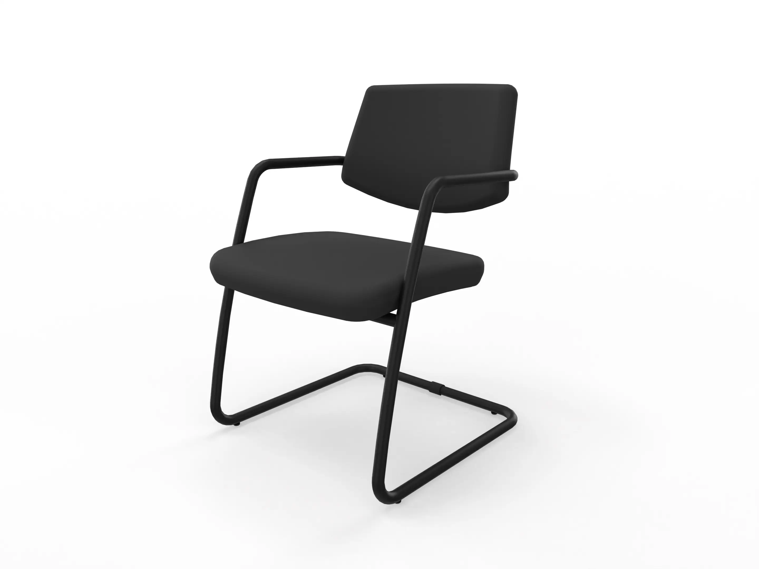 Vergaderstoel Uni met een volledig gestoffeerde zitting en medium rug, op een matzwarte sledeframe voorzien van armleggers.