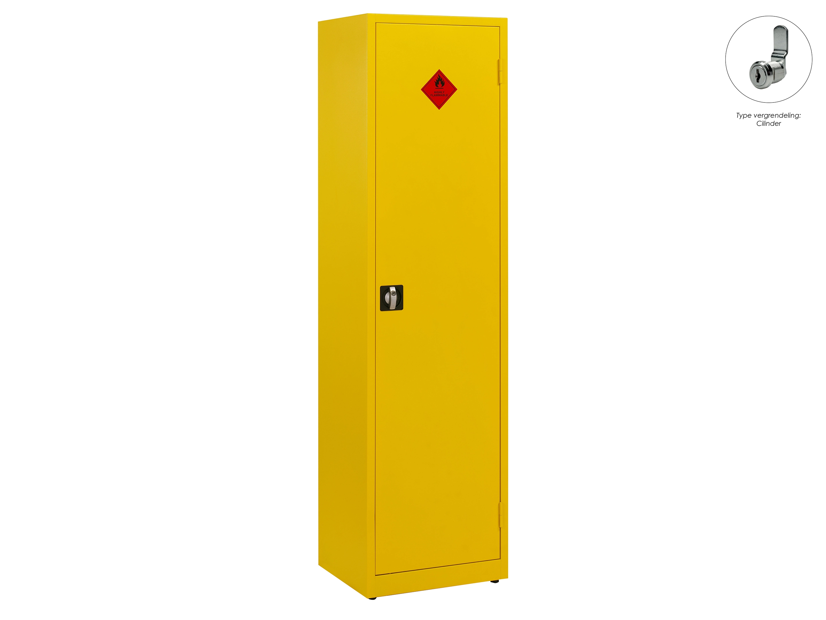 Veiligheidskast met 1 gelakt geperforeerd legbord en lekbak. Conform PGS1: opslag van milieubelastende stoffen ADR klassen 8 en 9 in verpakkingsgroepen II en III tot 250 kilo. Bijv. bestrijdingsmiddelen, smeermiddelen, olie, vetten, kleurstoffen.