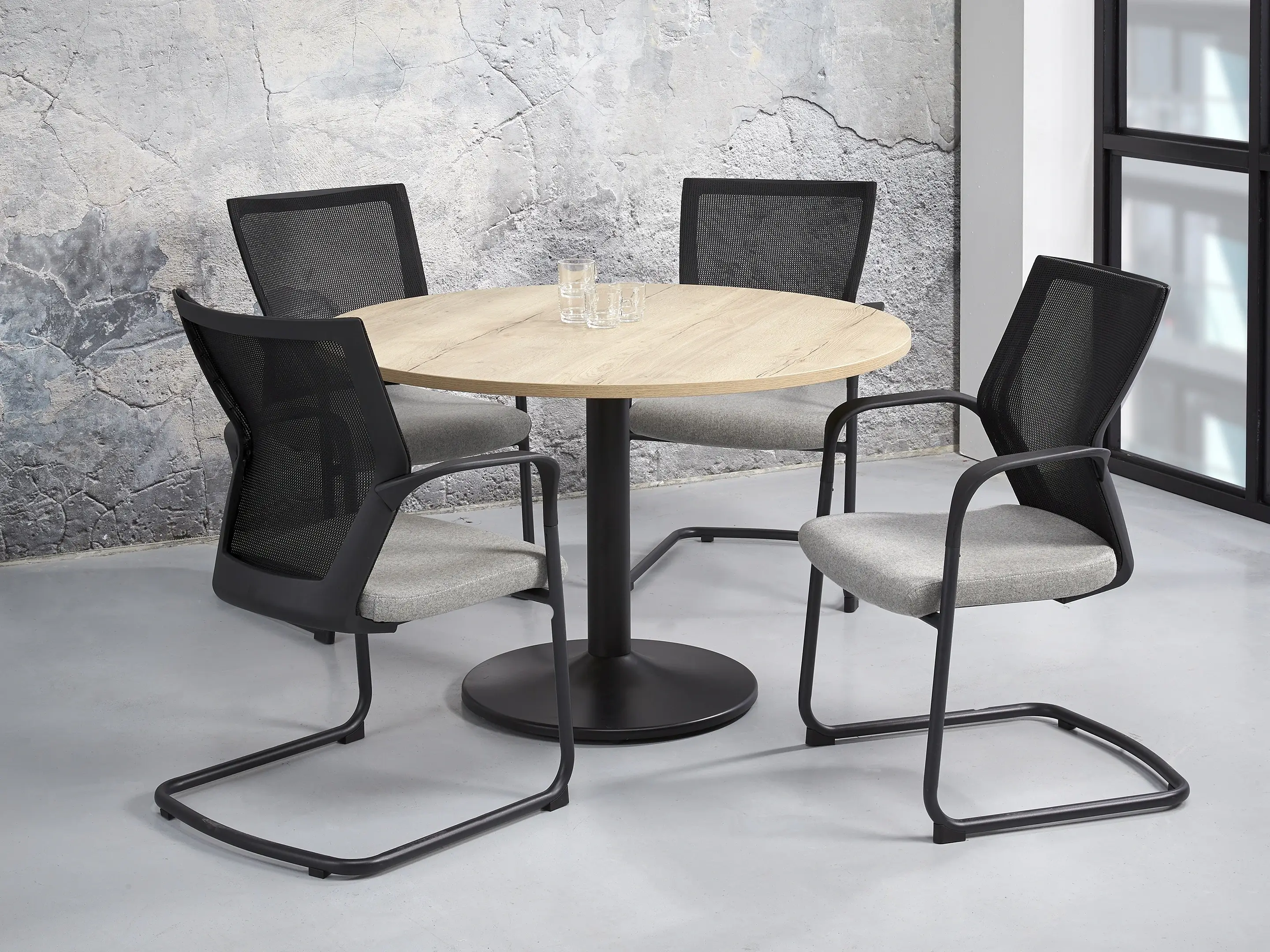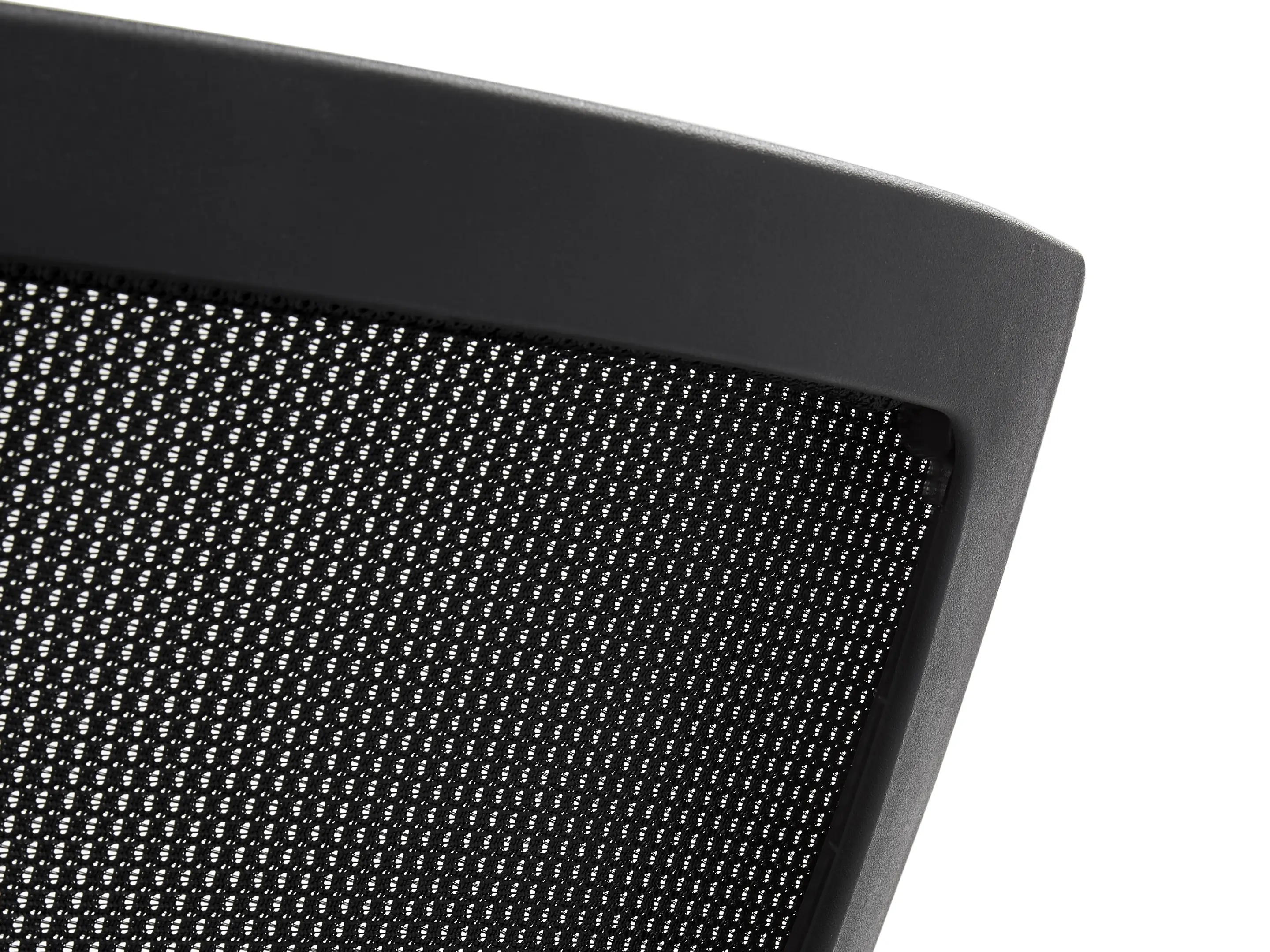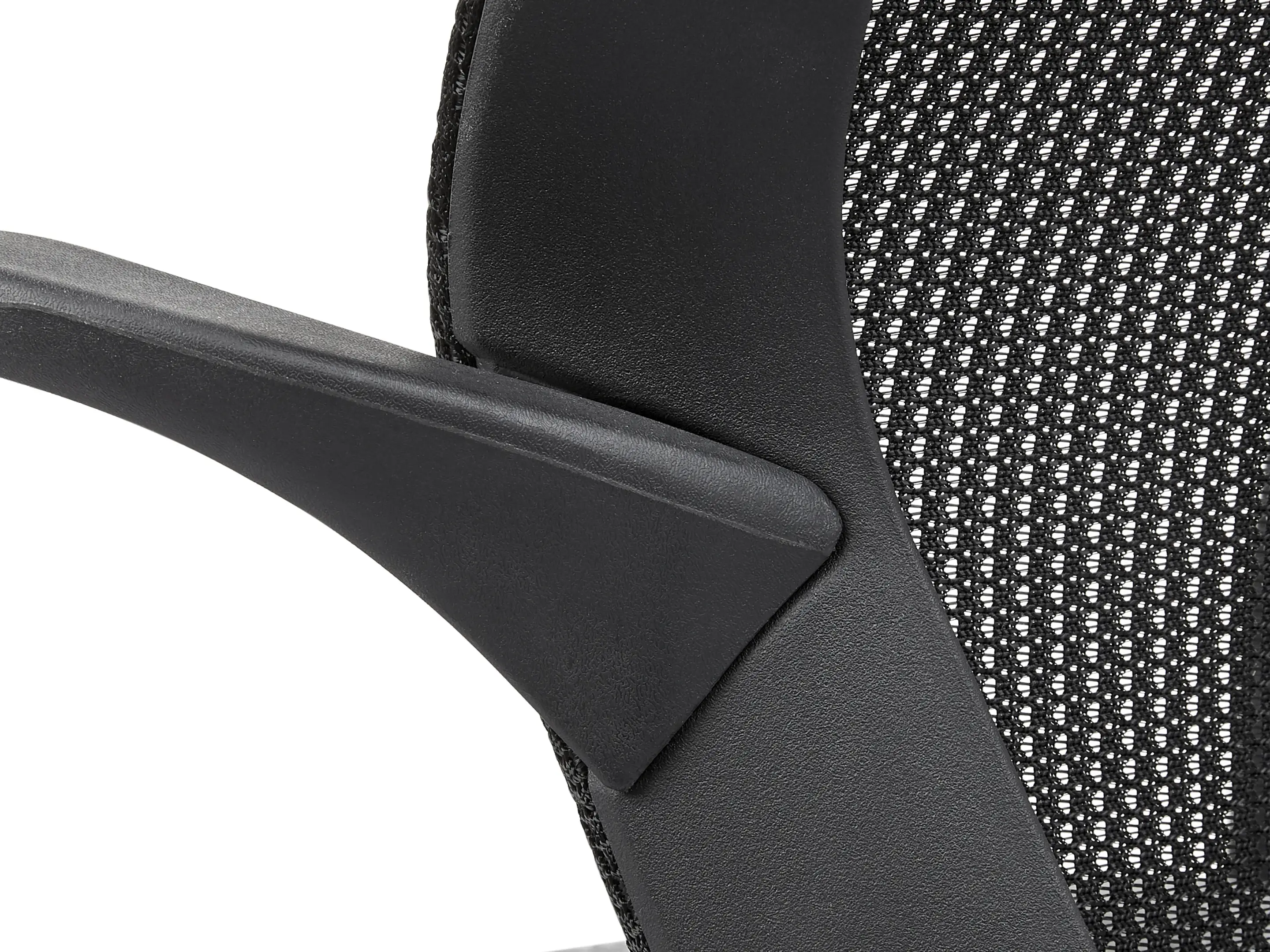 Vergaderstoel met armleuningen, zwart gestoffeerde polyester zitting en zwart mesh rug, zwart gepoedercoat frame.