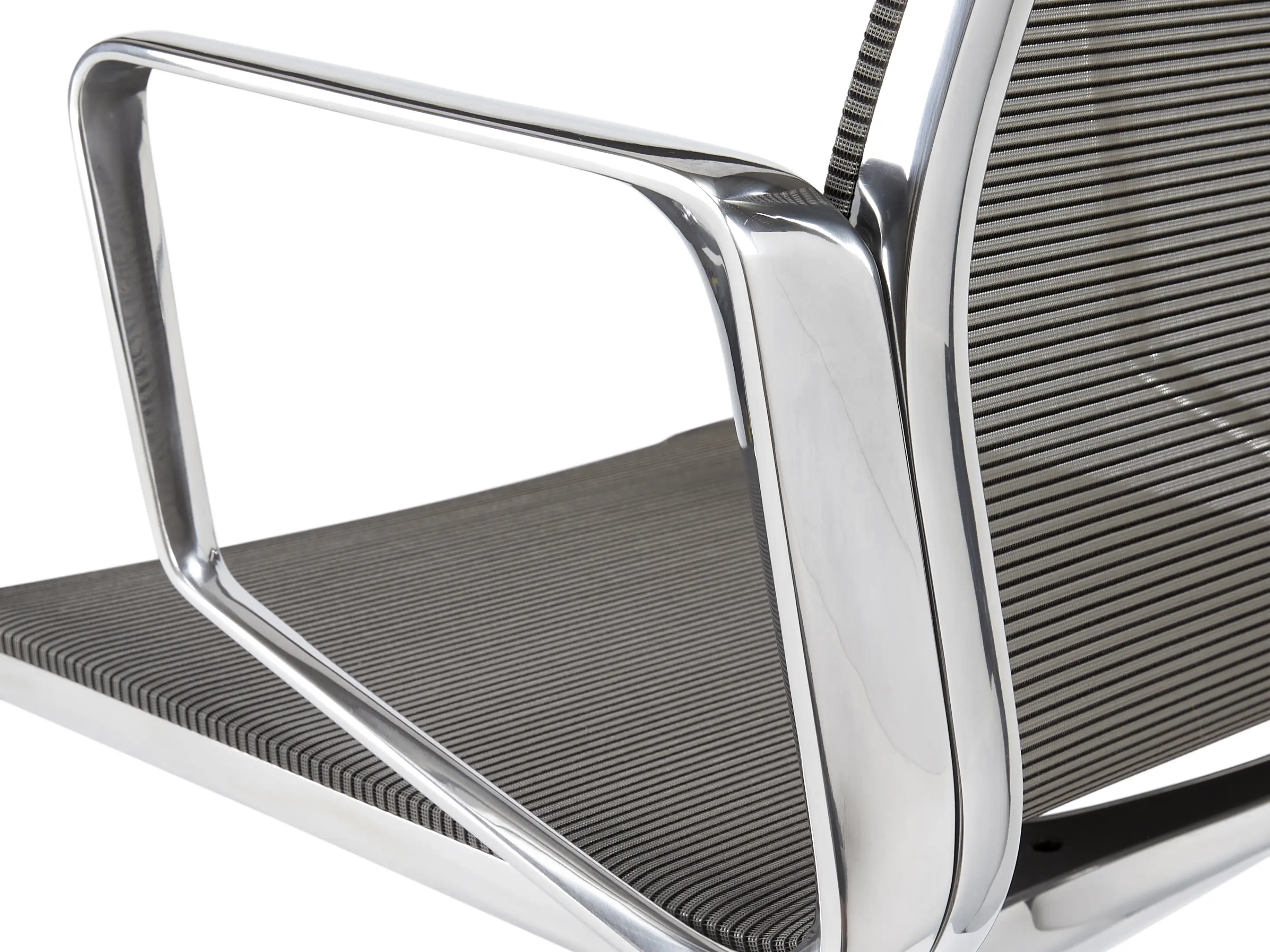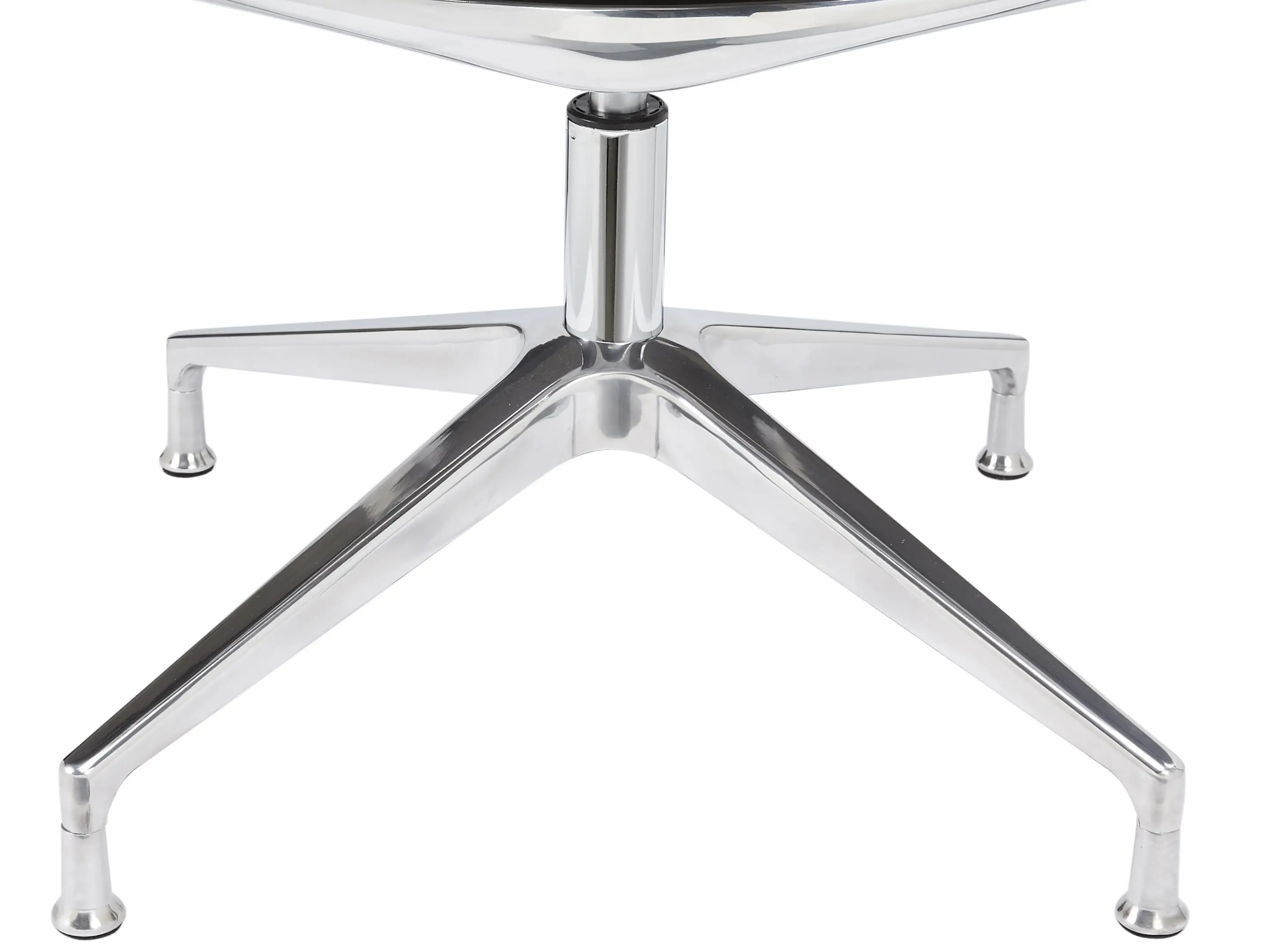 Draaibare vergaderstoel op 4-poots spinpoot voorzien van glijdoppen, met armleuningen, gepolijst aluminium onderstel, frame en armleuningen.