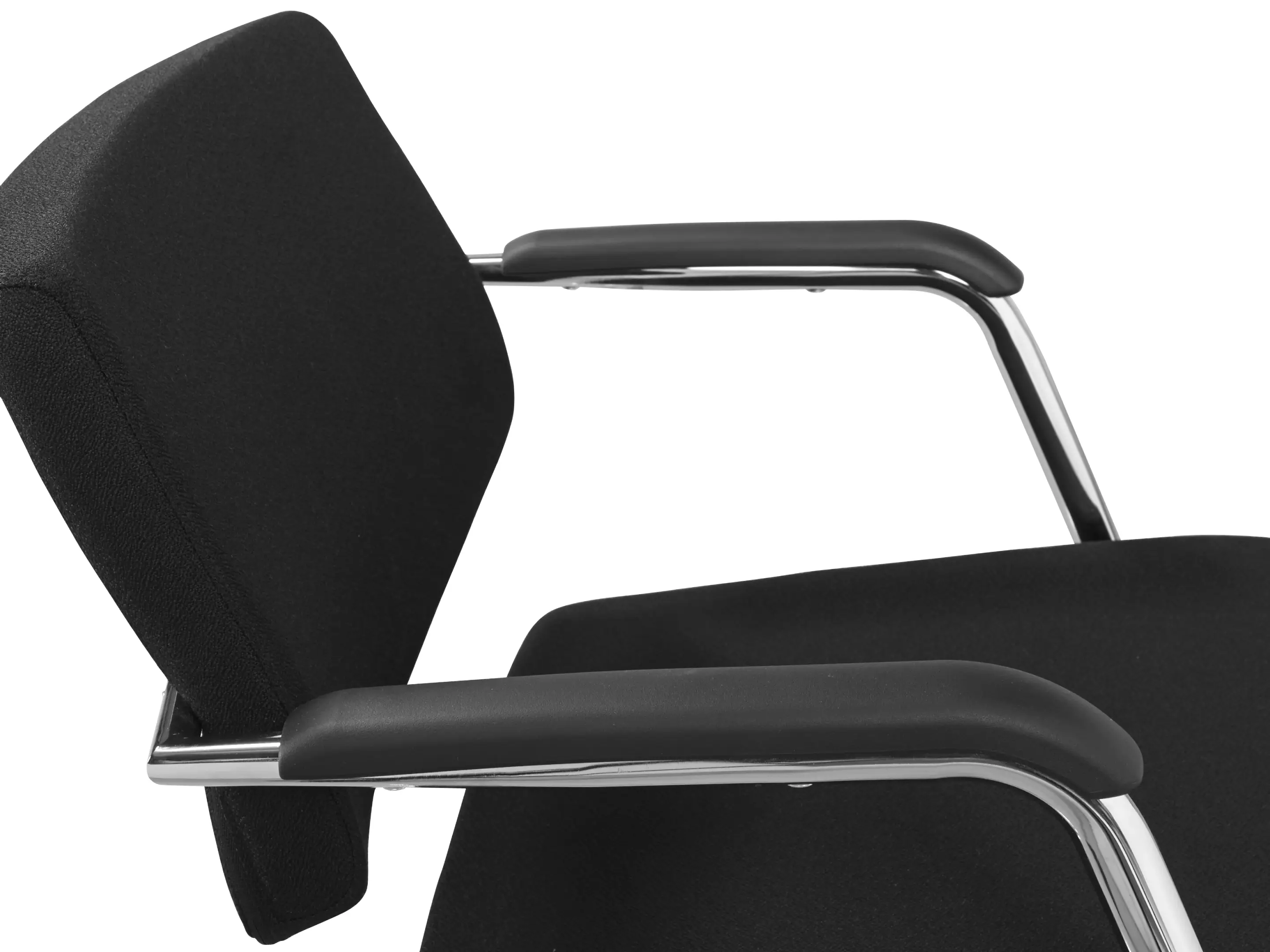 Stapelbare vergaderstoel met armleuningen voorzien van PU opdekjes, gestoffeerde rug en zitting in zwart polyester.