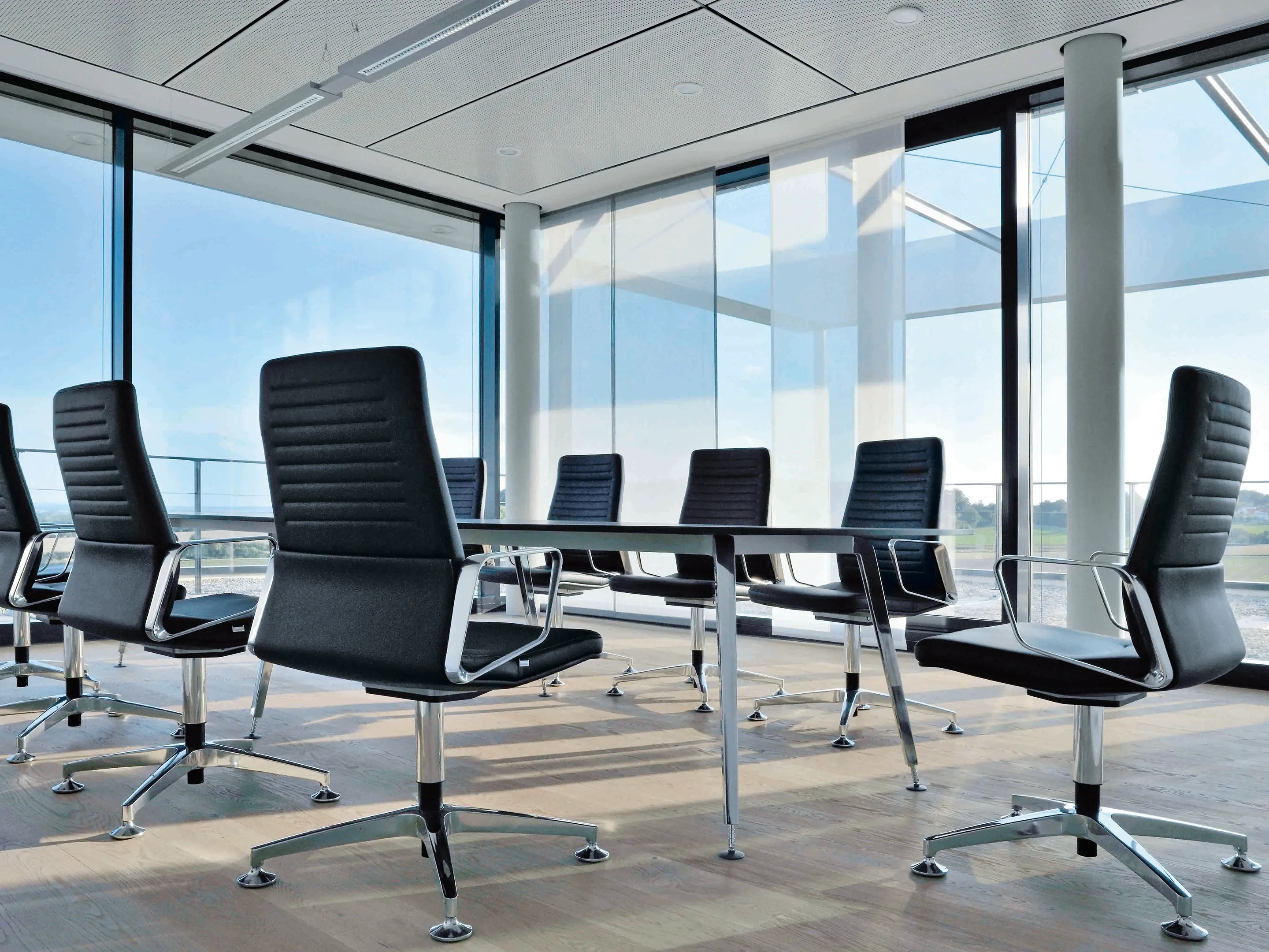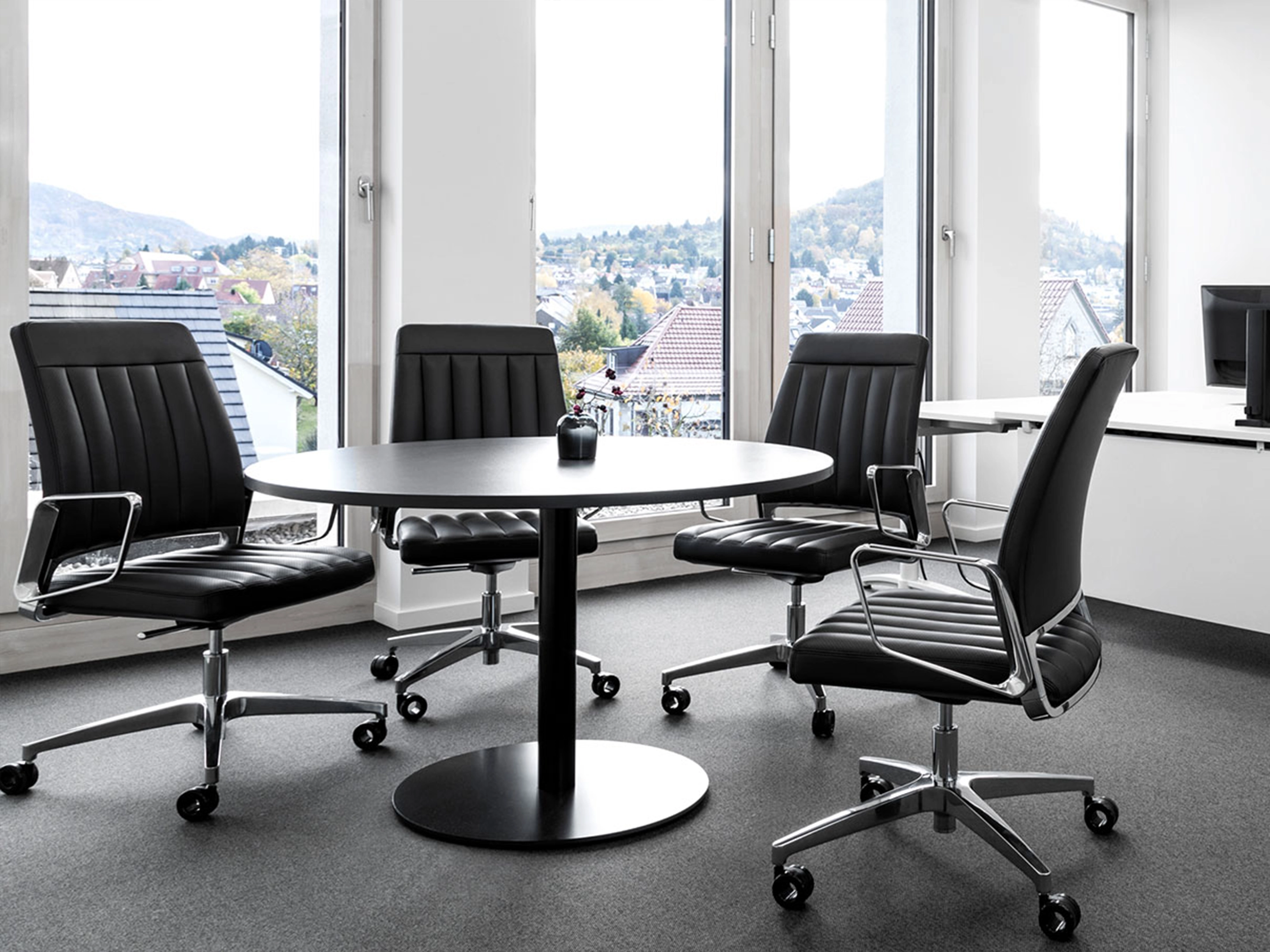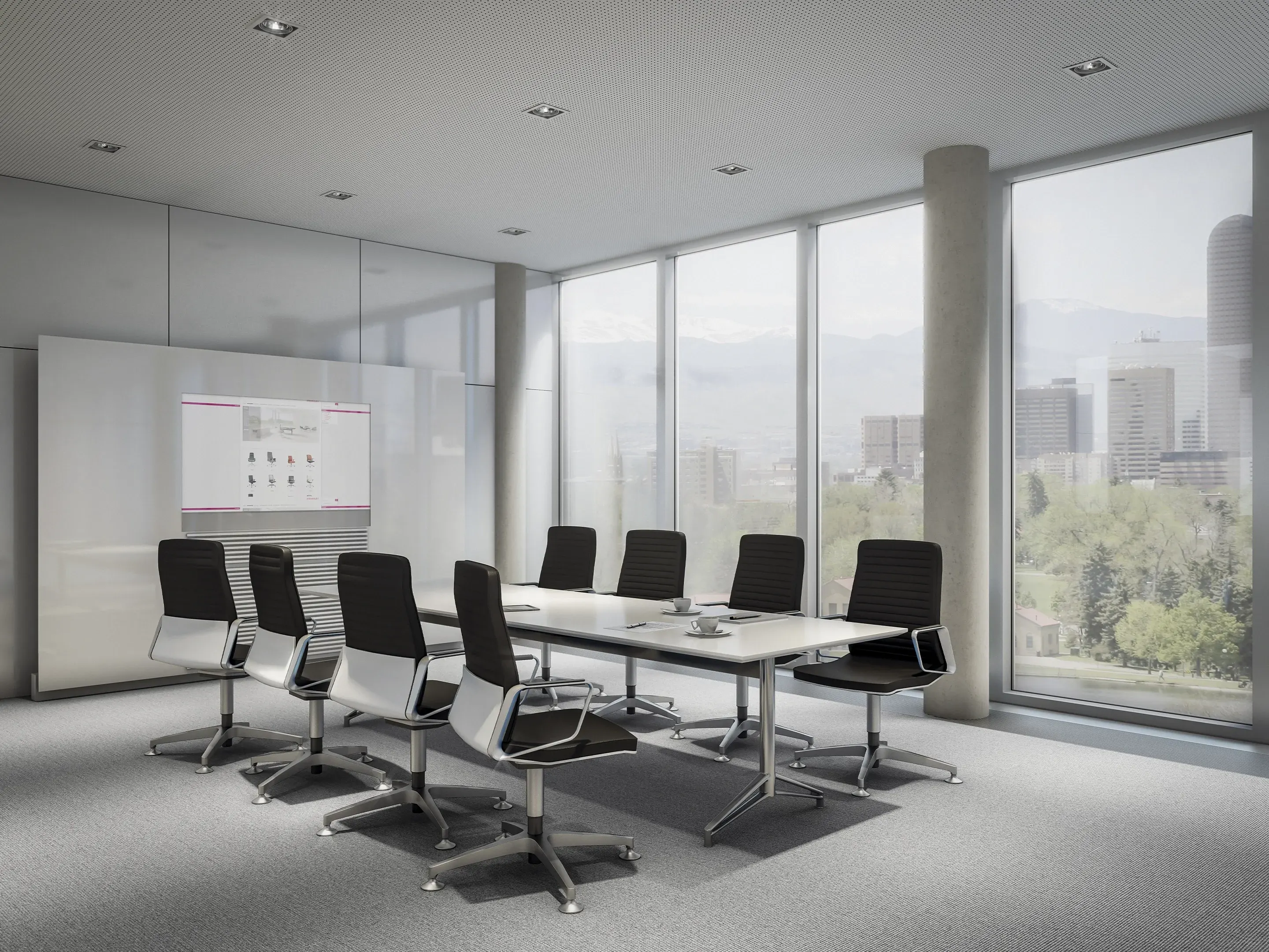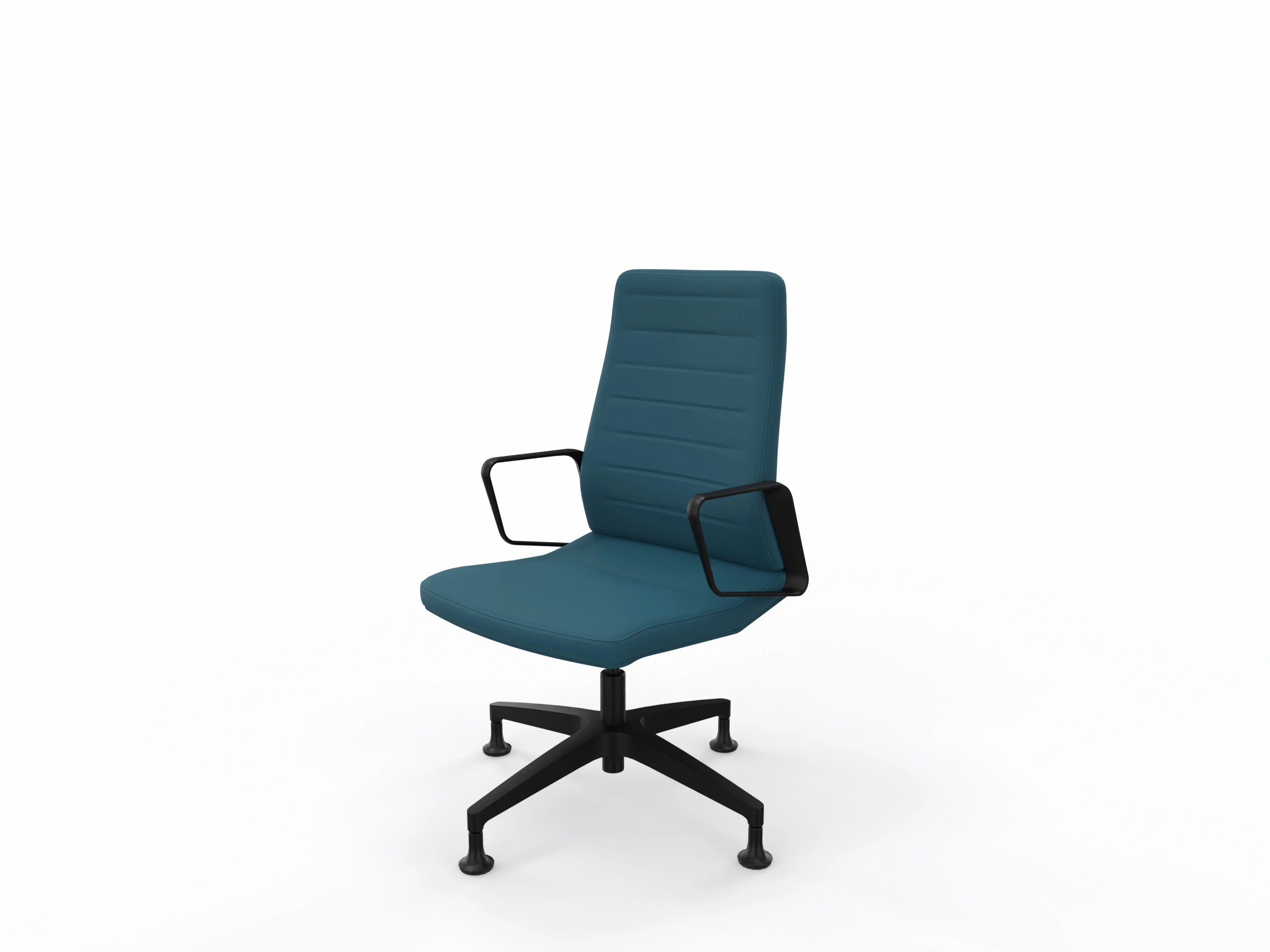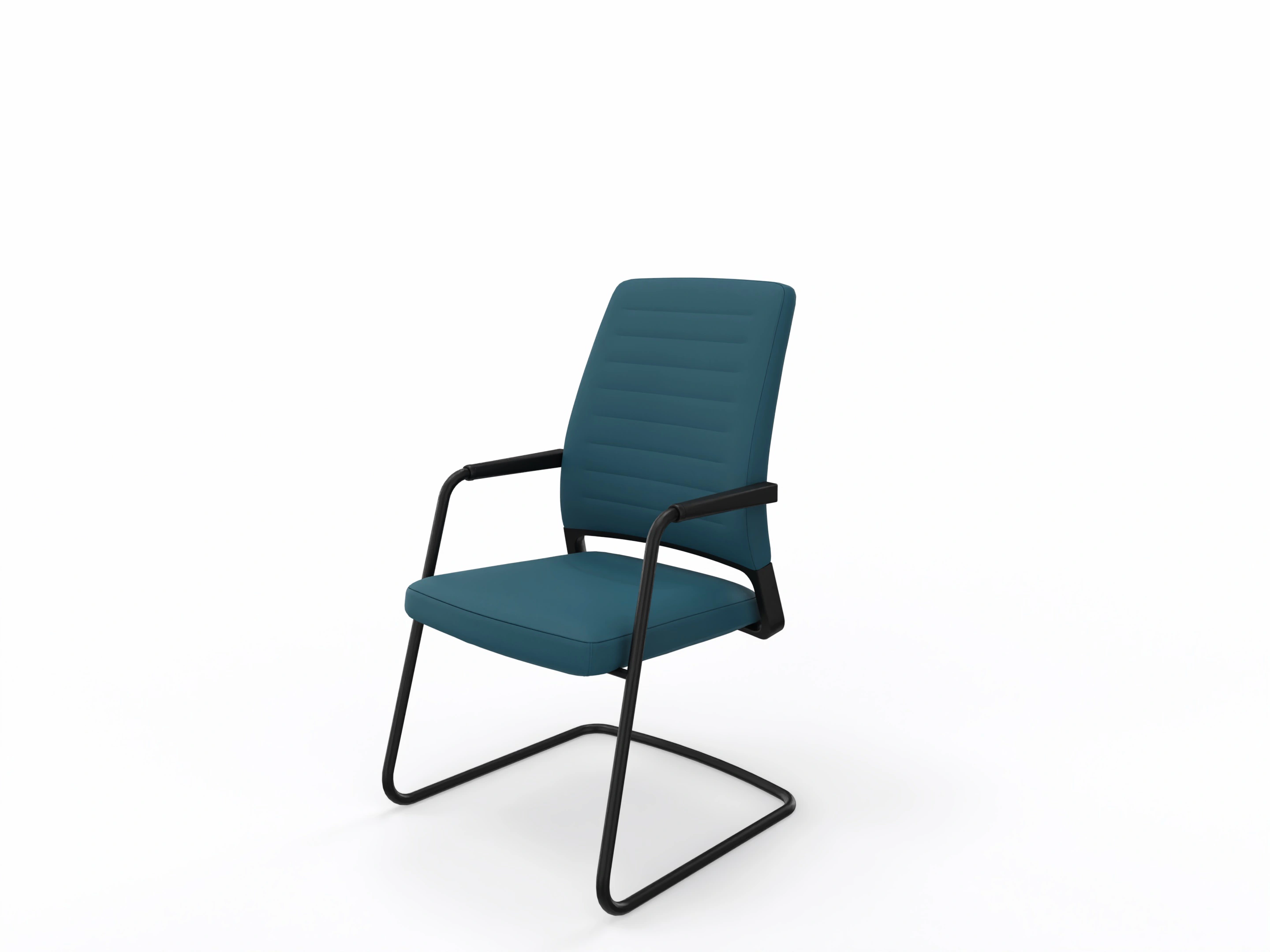 Conferentiestoel op 4-teens kruis en glijders. Standaard gepoedercoat voetkruis, zitting en rugleuning zijn volledig gestoffeerd (rondom, rug is dicht). Kantelmechaniek vergrendelbaar. Incl. ringarmleggers in poedercoating.