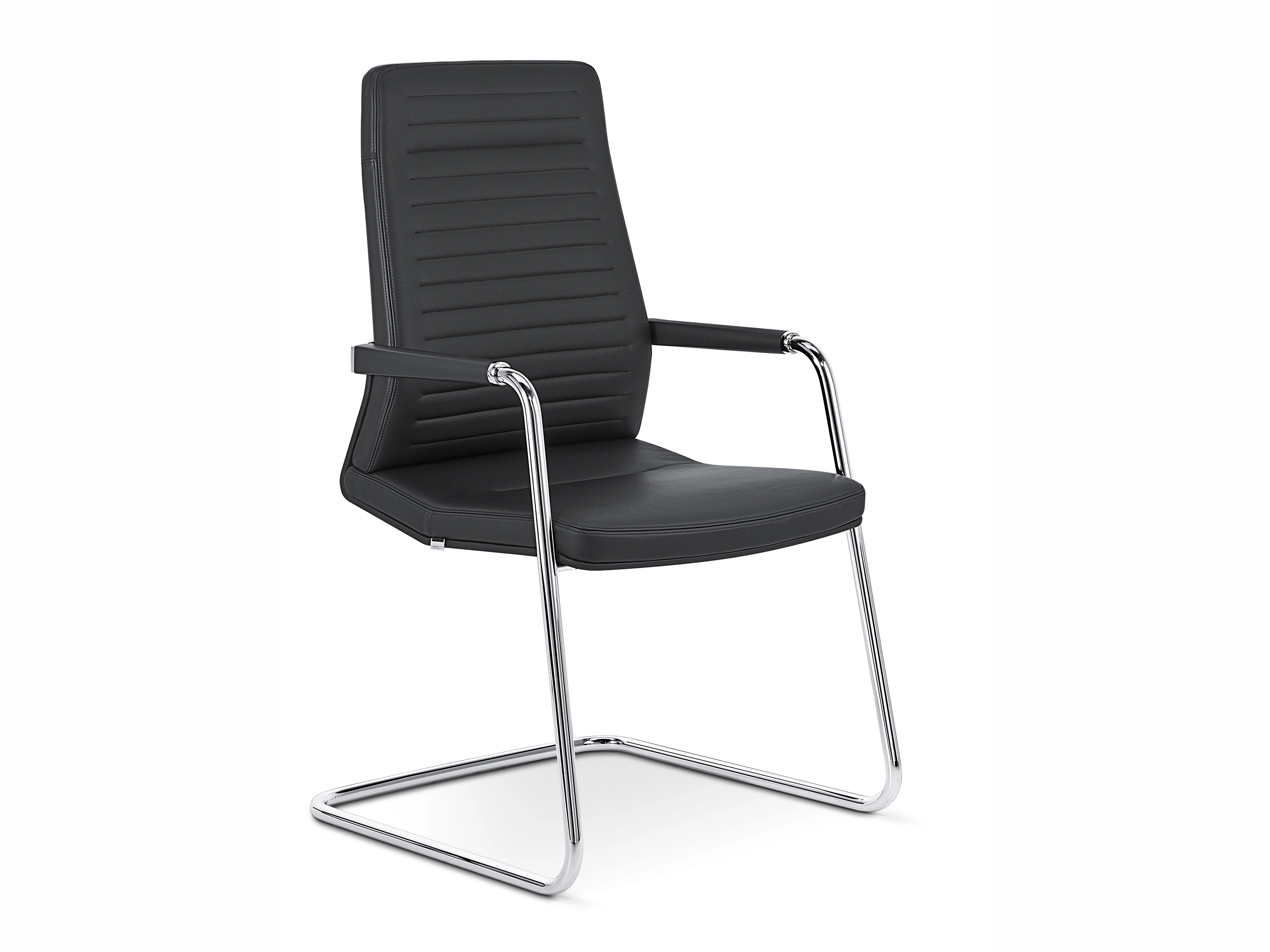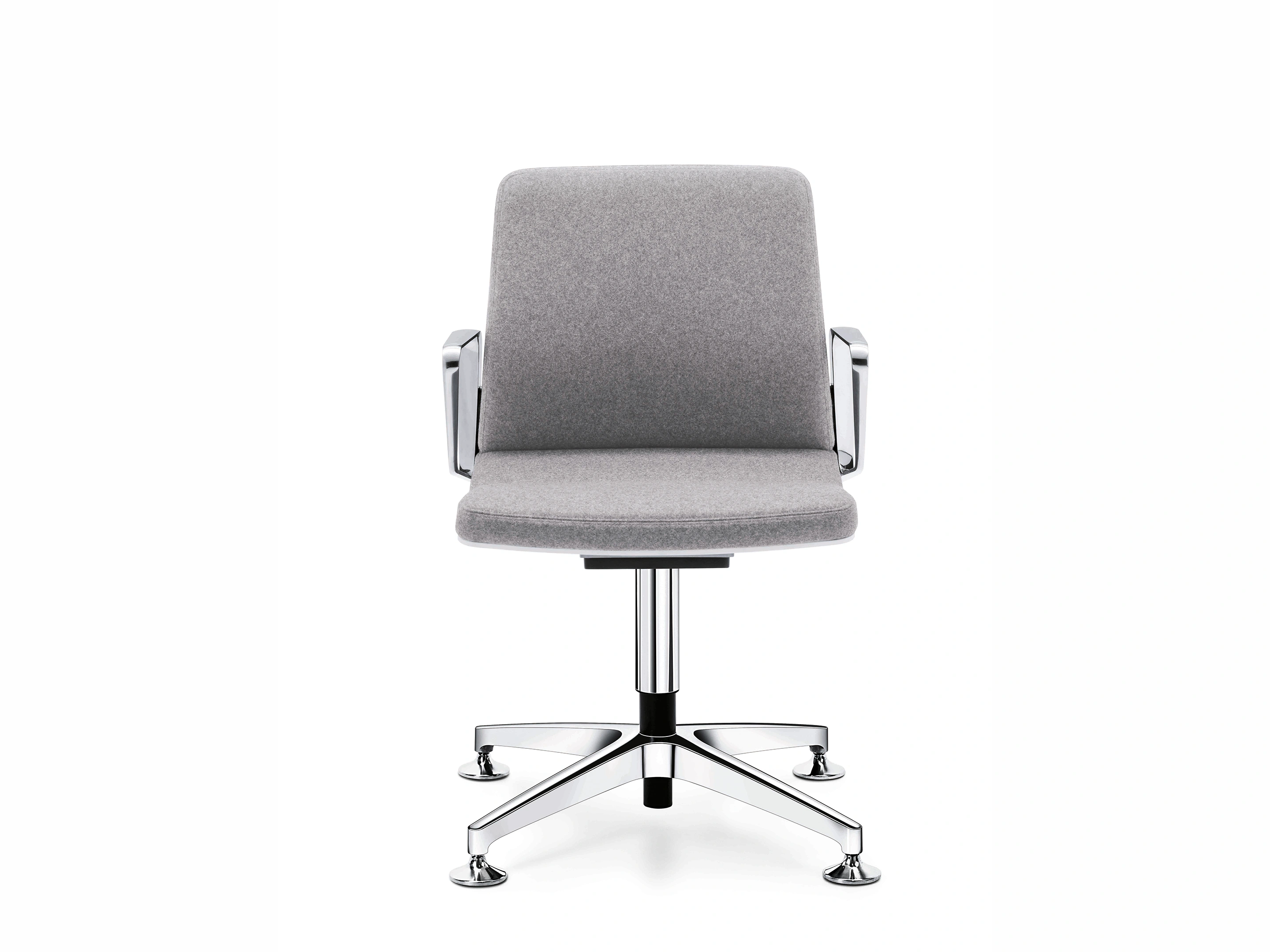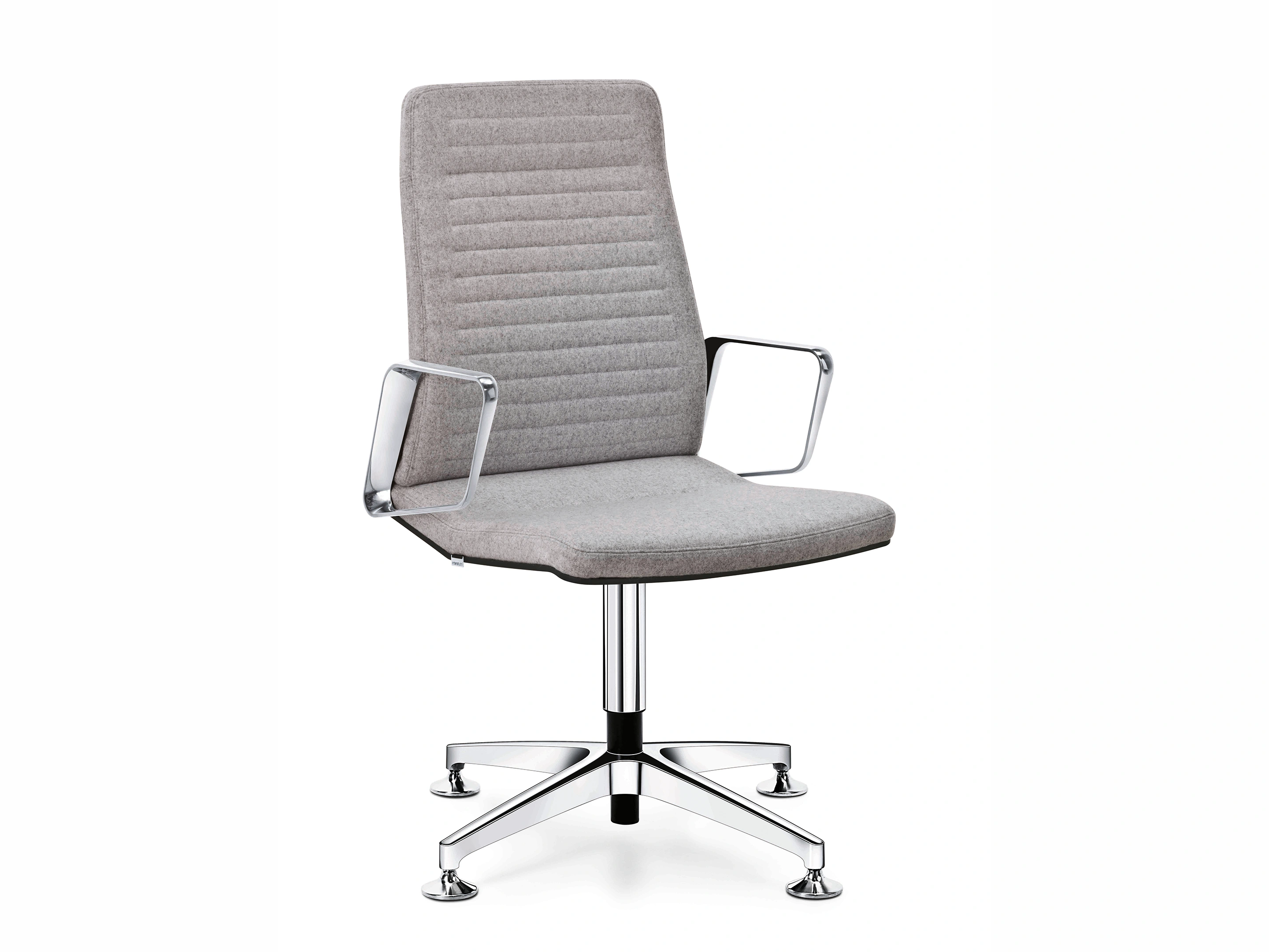 Conferentiestoel op 4-teens kruis en glijders. Standaard gepolijst voetkruis, zitting en rugleuning zijn volledig gestoffeerd met luxe "padding" stoffering. Kantelmechaniek vergrendelbaar.Incl. ringarmleggers in poedercoating en gepolijste rugbeugel.