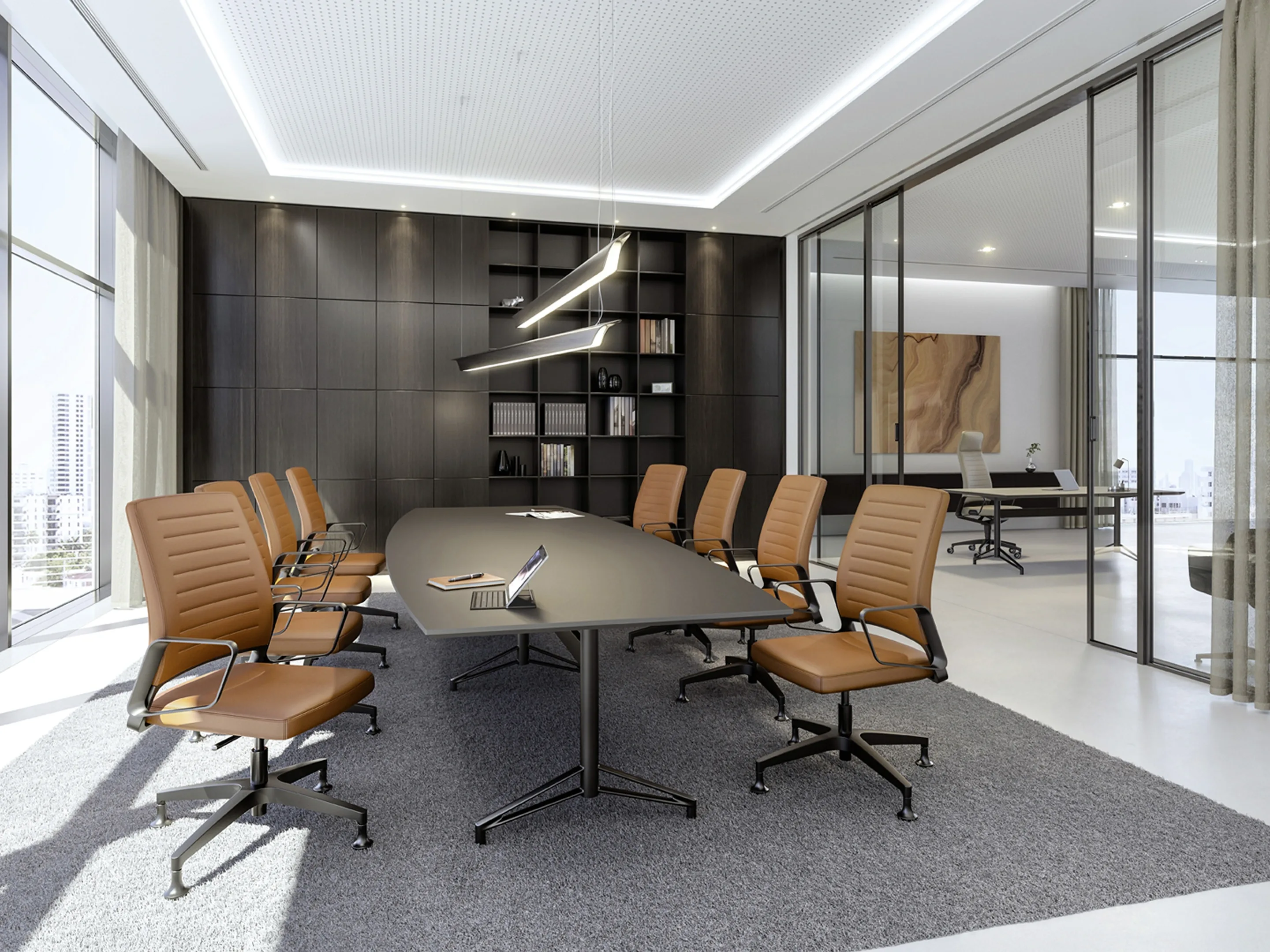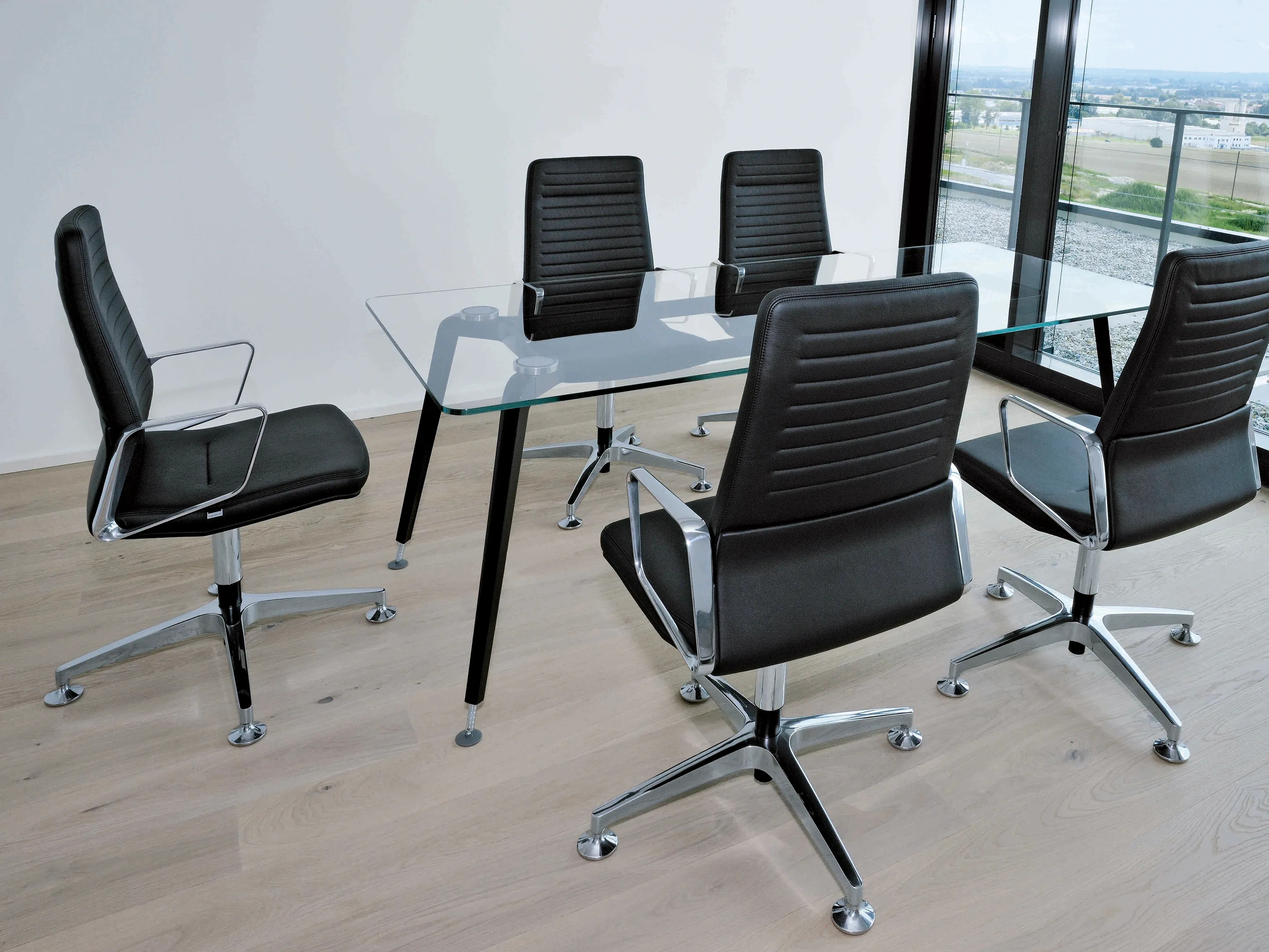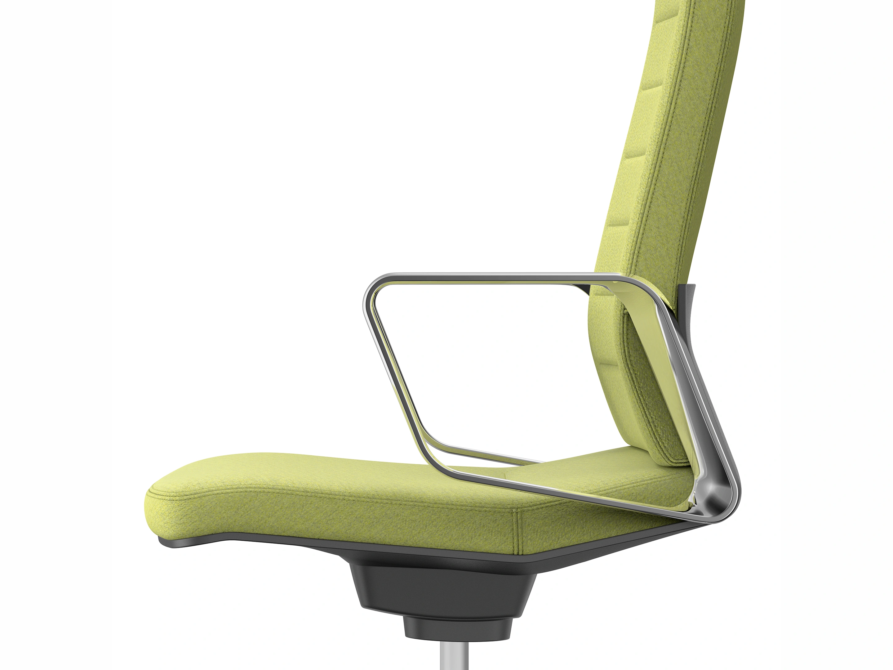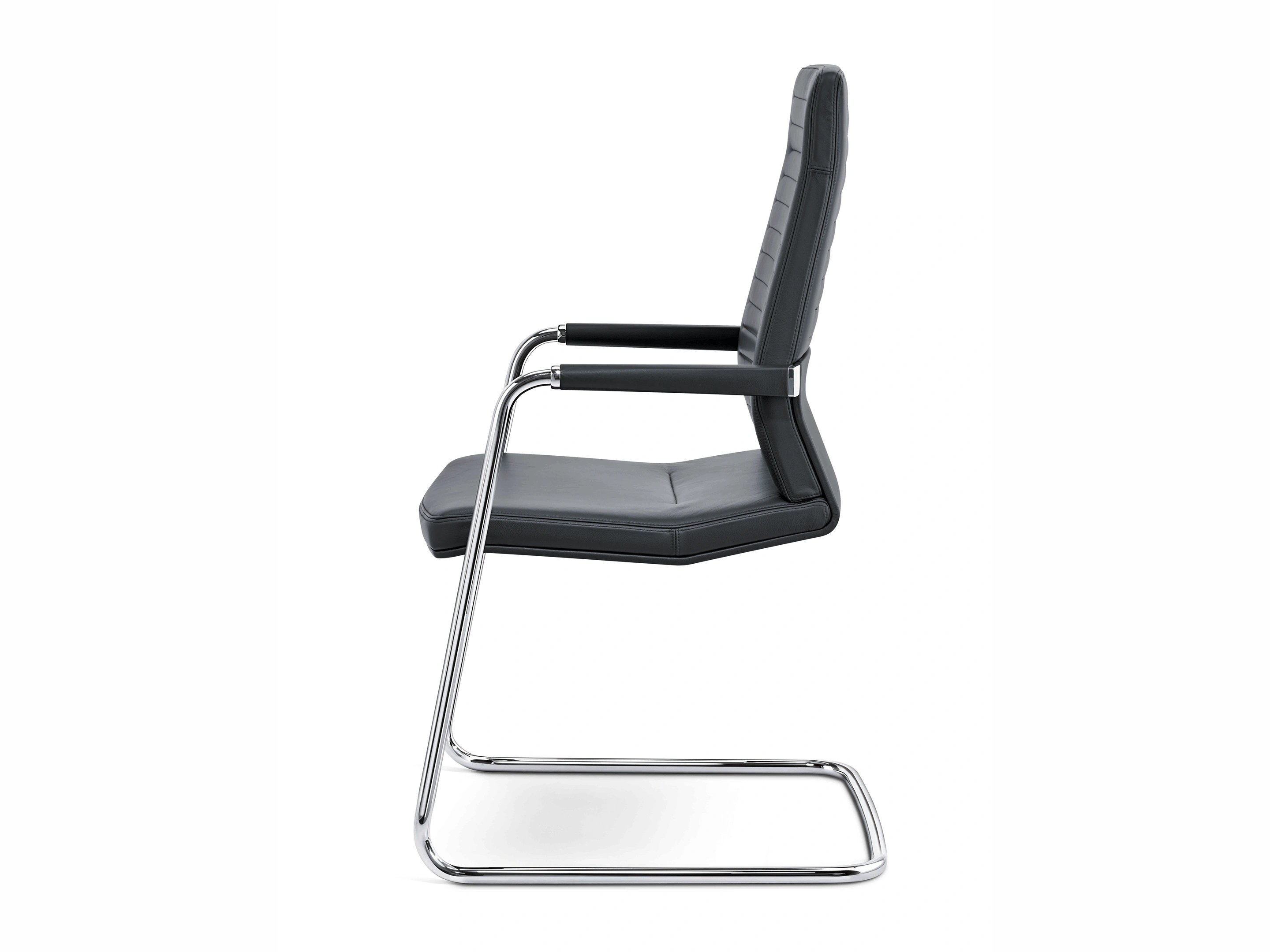 Conferentiestoel op 4-teens kruis en glijders. Standaard gepolijst voetkruis, zitting en rugleuning zijn volledig gestoffeerd met luxe "padding" stoffering. Kantelmechaniek vergrendelbaar.Incl. ringarmleggers in poedercoating en gepolijste rugbeugel.