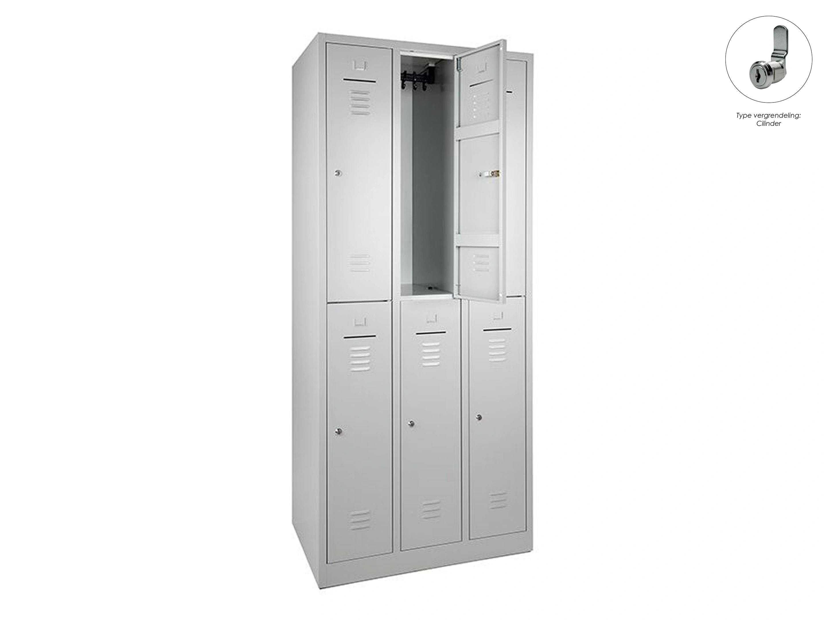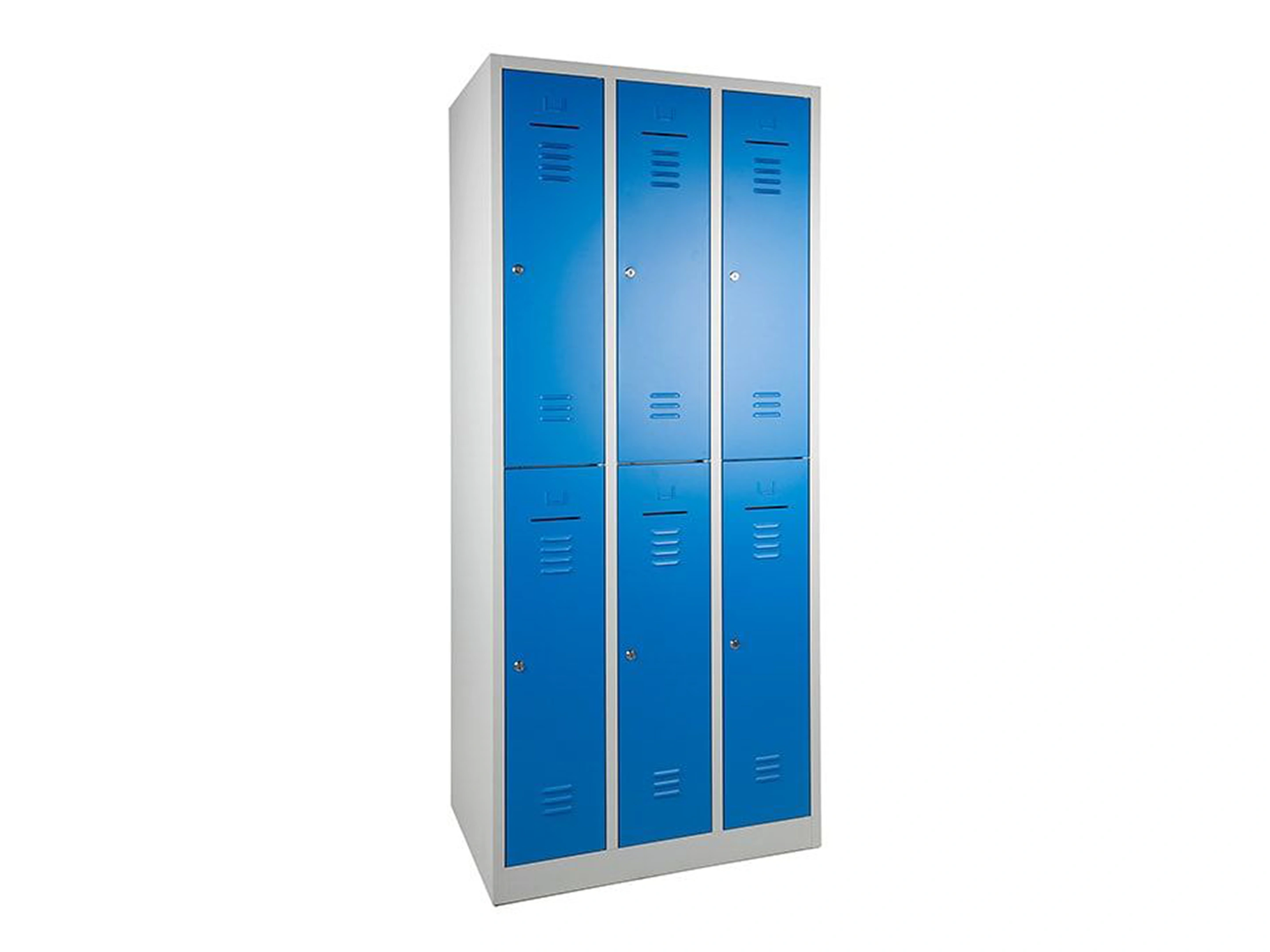 Lockerkast met 3 kolommen, en 6 deuren, elke locker is voorzien van een kledingstang met kledinghaken, afsluitbaar met een cilindersluiting incl sleutels.