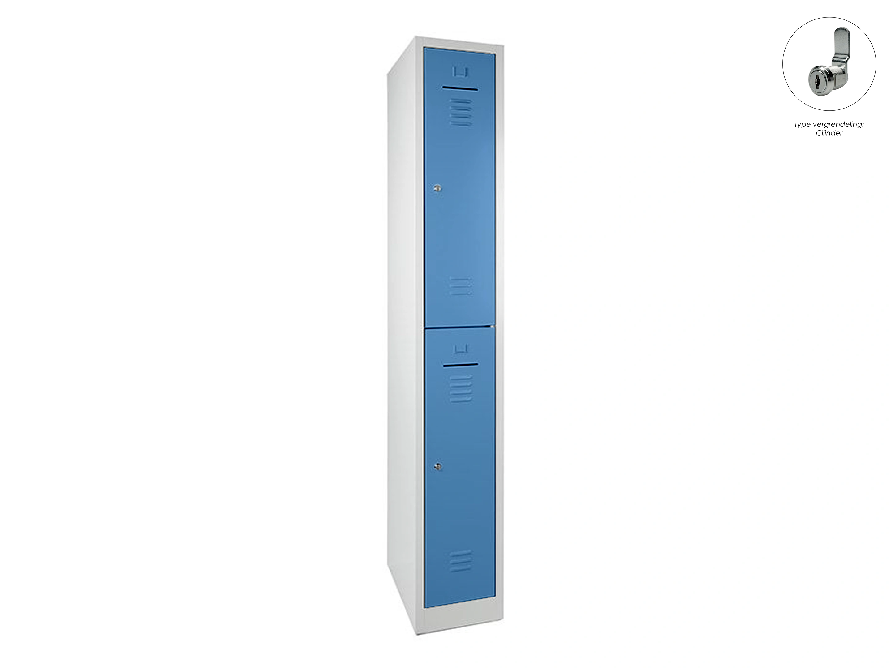 Lockerkast met 1 kolom, en 2 deuren, elke locker is voorzien van een kledingstang met kledinghaken, afsluitbaar met een cilindersluiting incl sleutels.