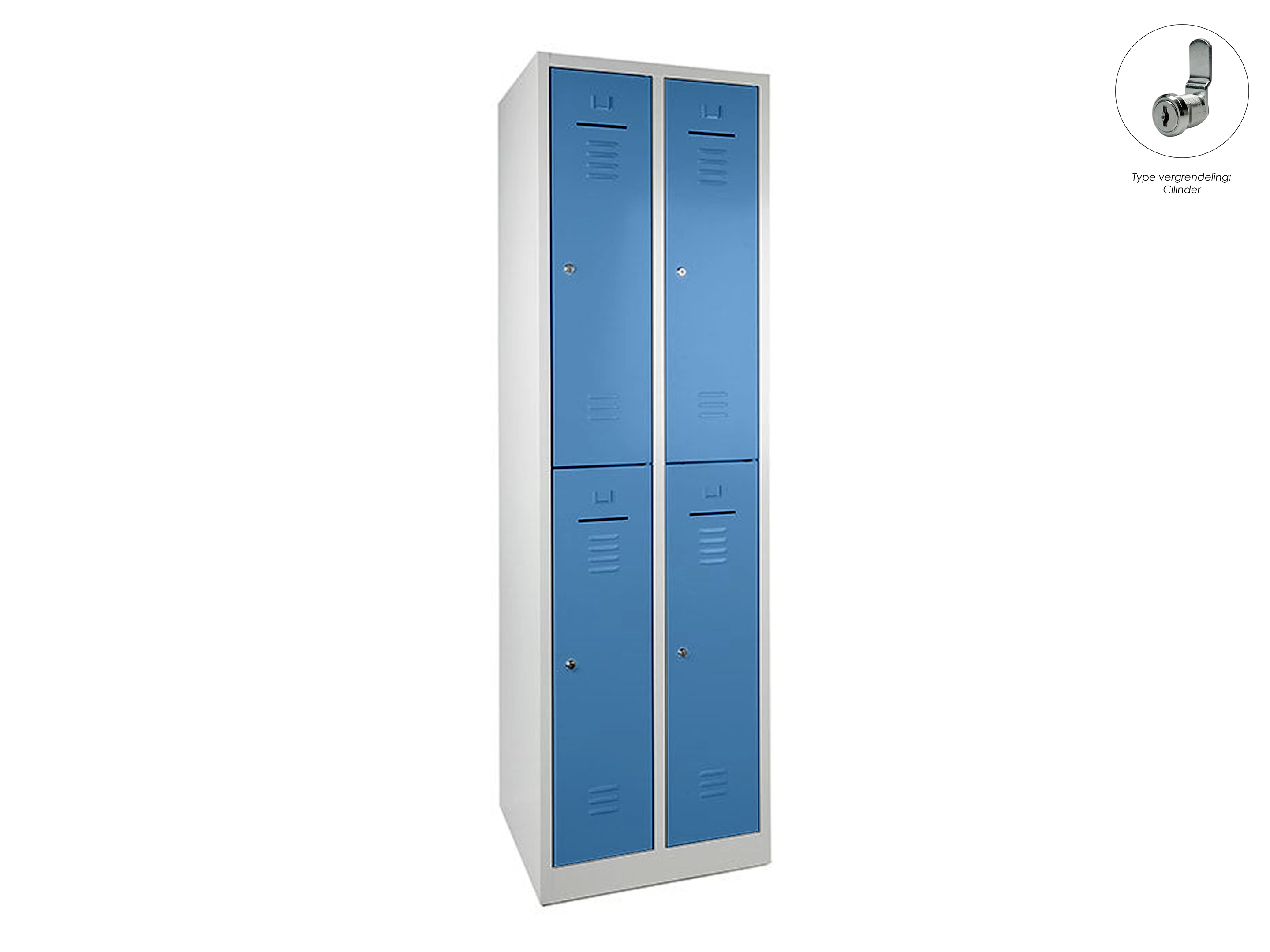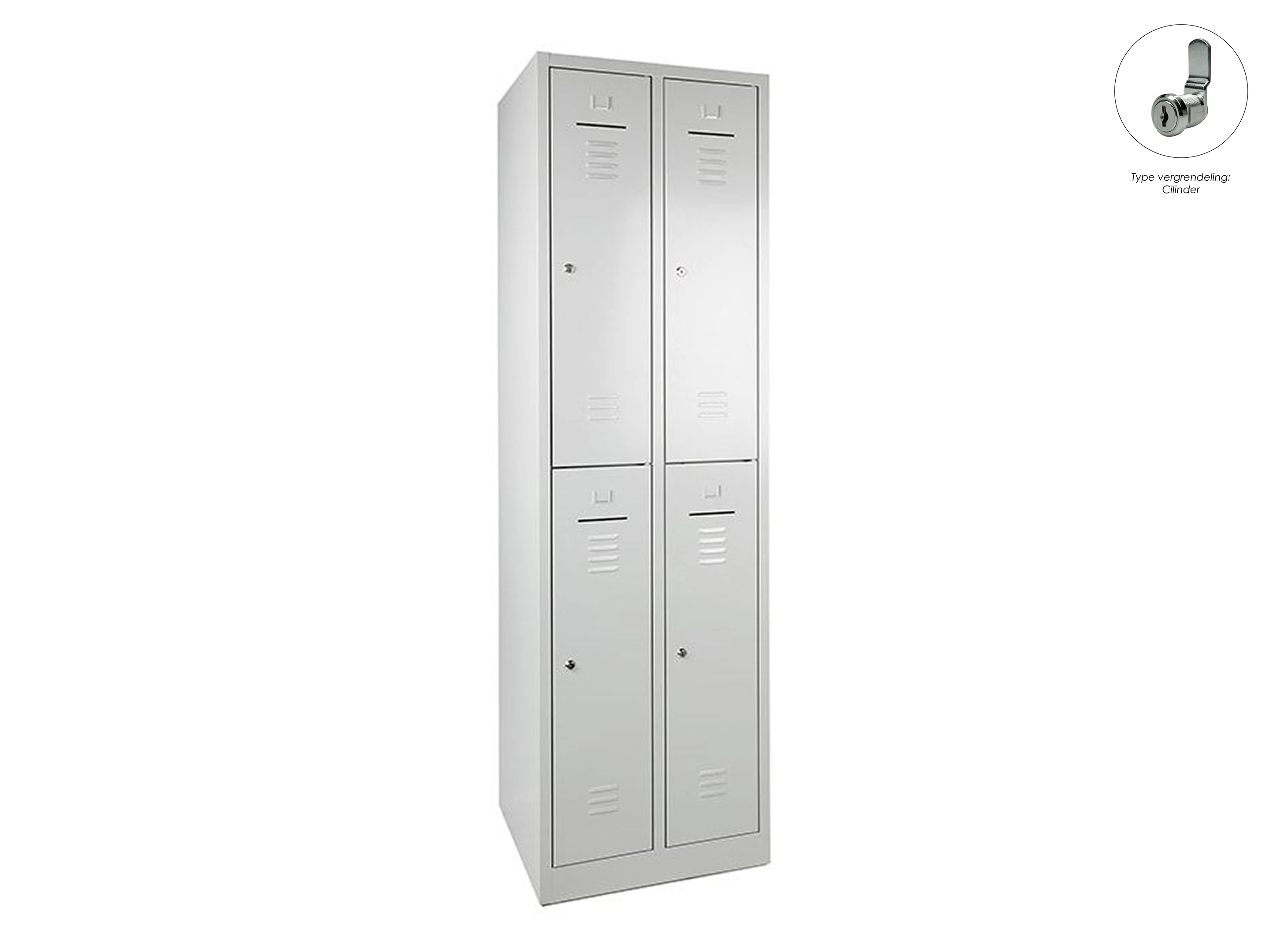 Lockerkast met 2 kolommen, en 4 deuren, elke locker is voorzien van een kledingstang met kledinghaken, afsluitbaar met een cilindersluiting incl sleutels.