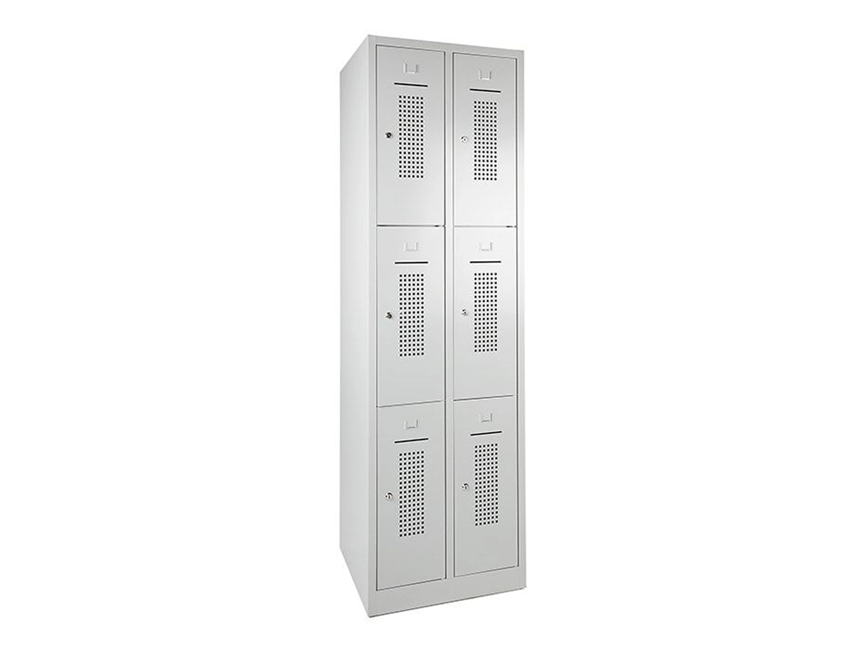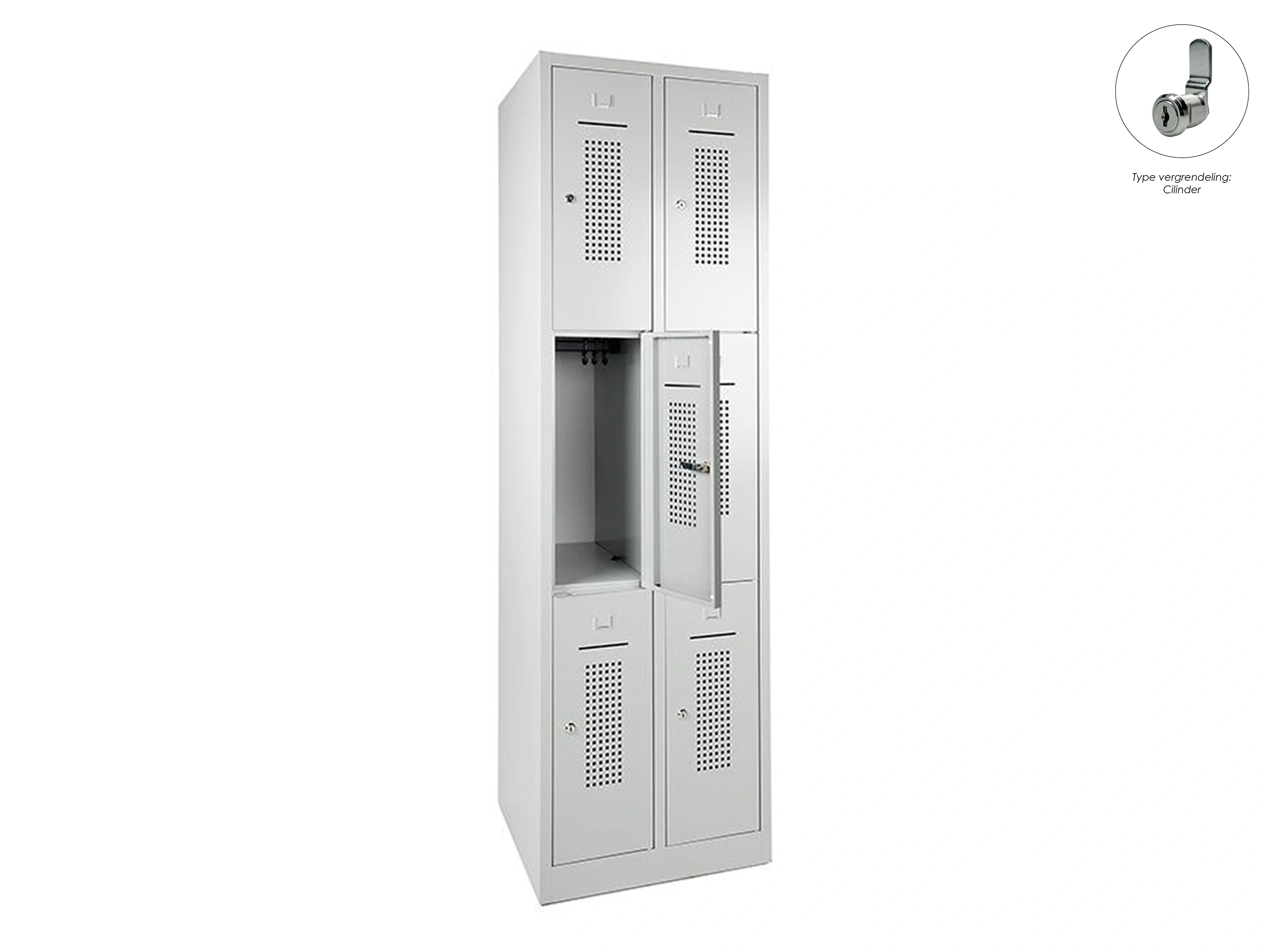 Lockerkast met 2 kolommen, en 6 deuren, elke locker is voorzien van een kledingstang met kledinghaken, afsluitbaar met een cilindersluiting incl sleutels.