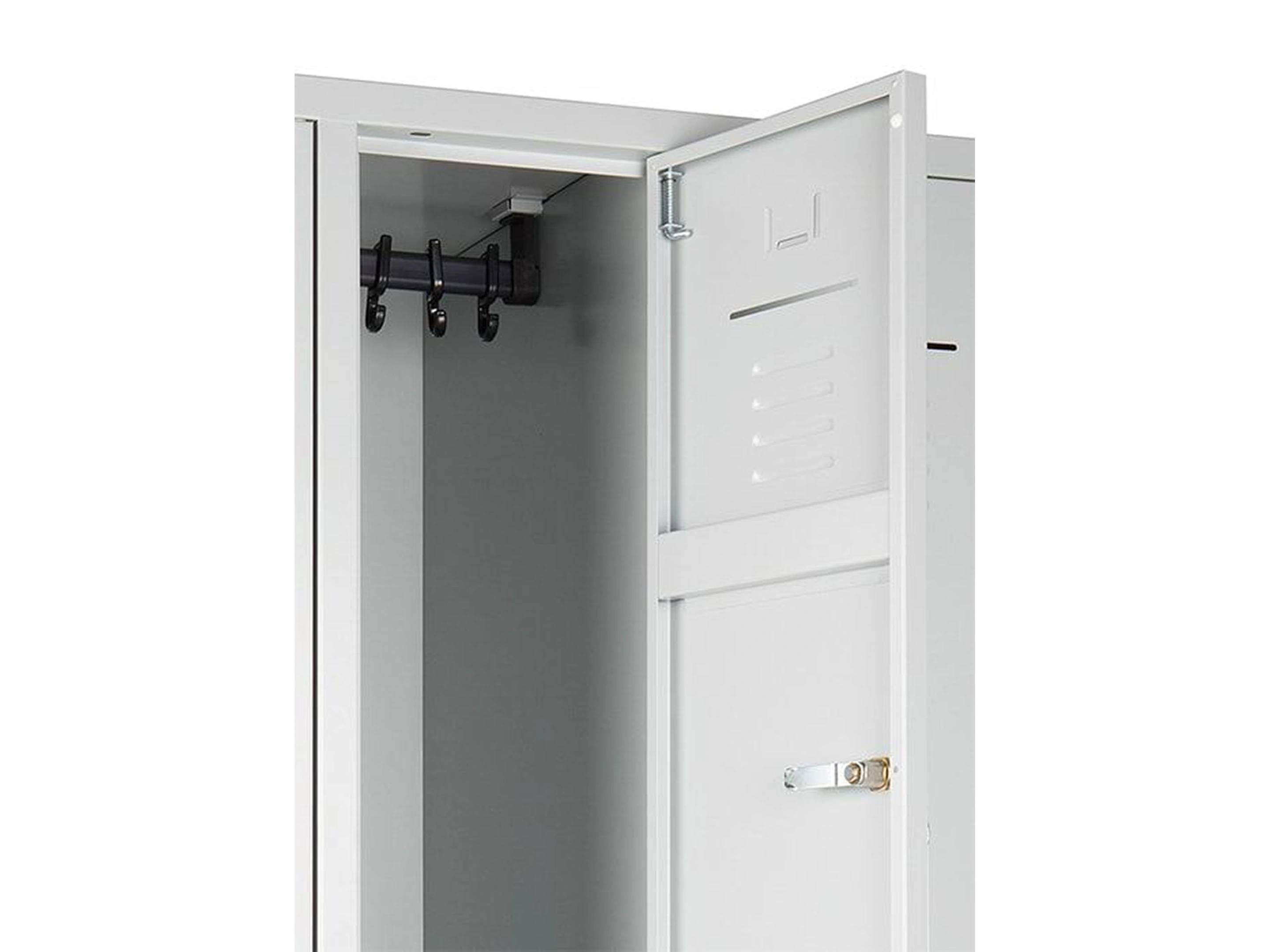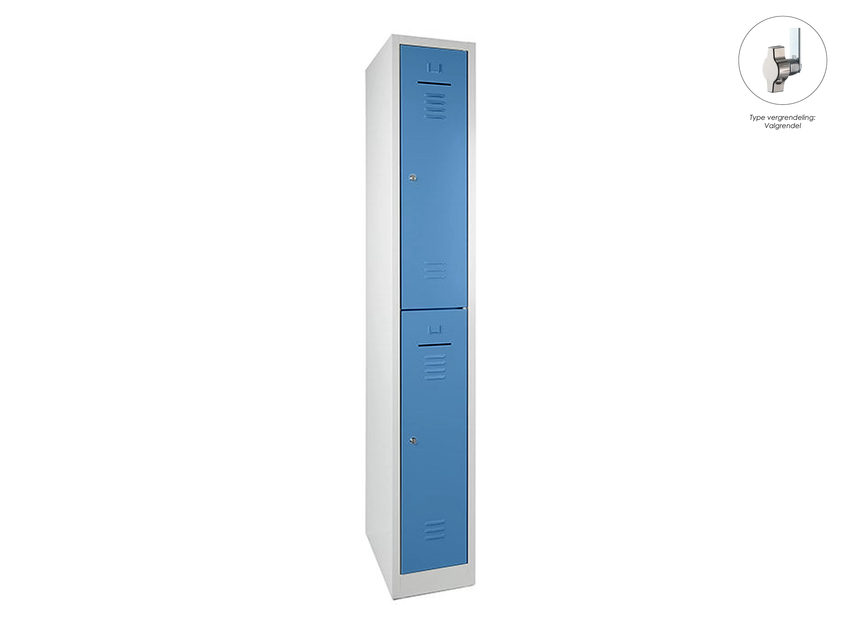 Lockerkast met 1 kolom, en 2 deuren, elke locker is voorzien van een kledingstang met kledinghaken, afsluitbaar met een valvergrendeling