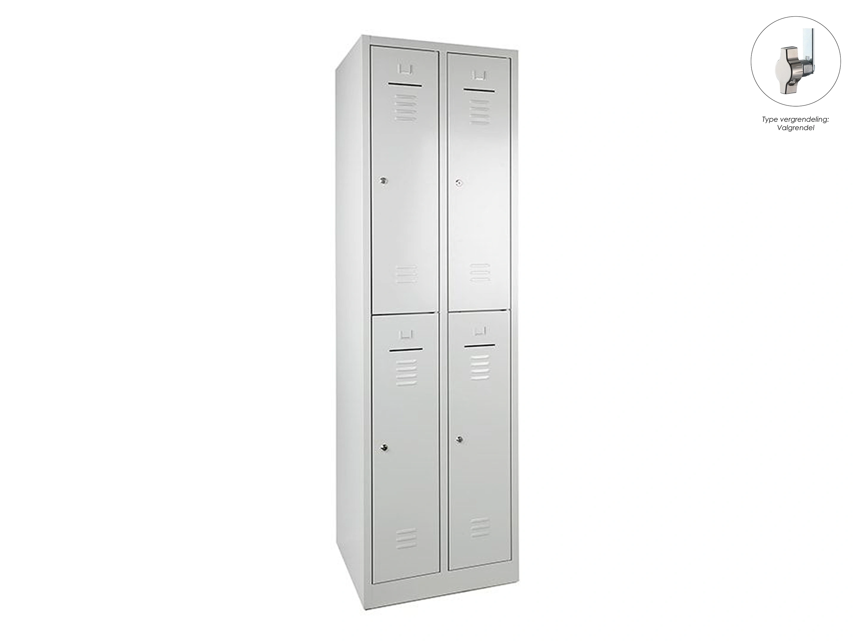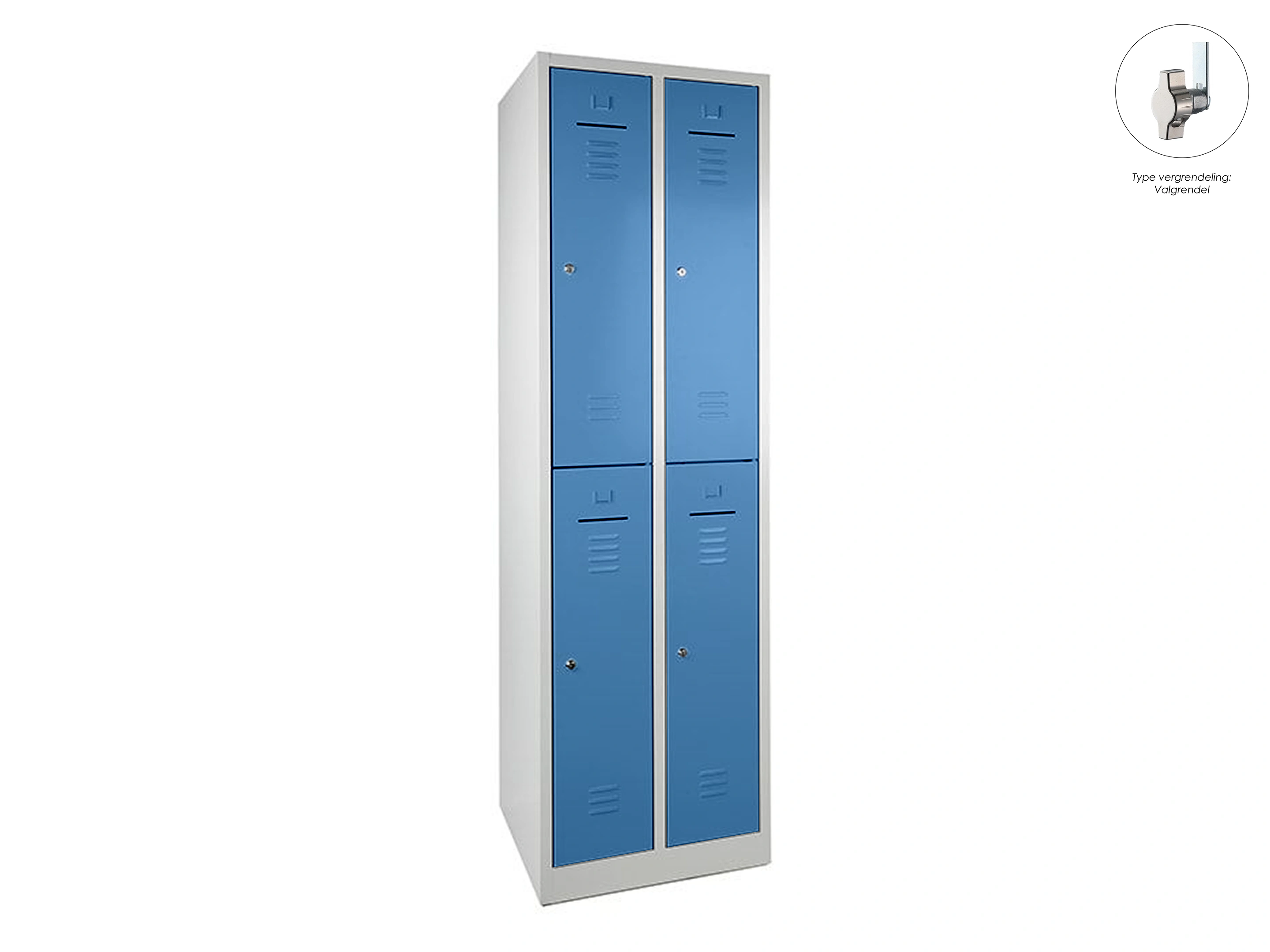 Lockerkast met 2 kolommen, en 4 deuren, elke locker is voorzien van een kledingstang met kledinghaken, afsluitbaar met een valvergrendeling