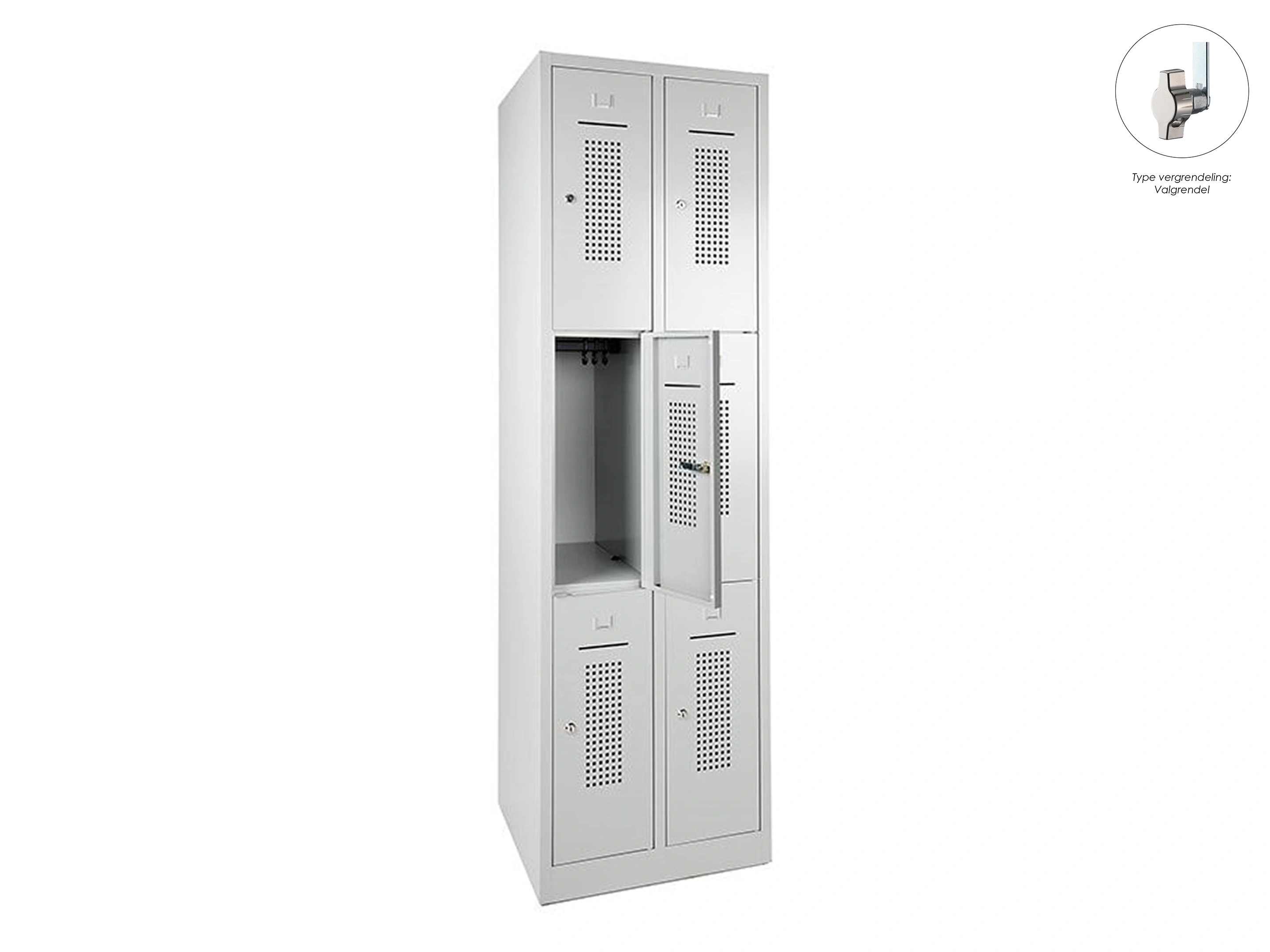 Lockerkast met 2 kolommen, en 6 deuren, elke locker is voorzien van een kledingstang met kledinghaken, afsluitbaar met een valvergrendeling