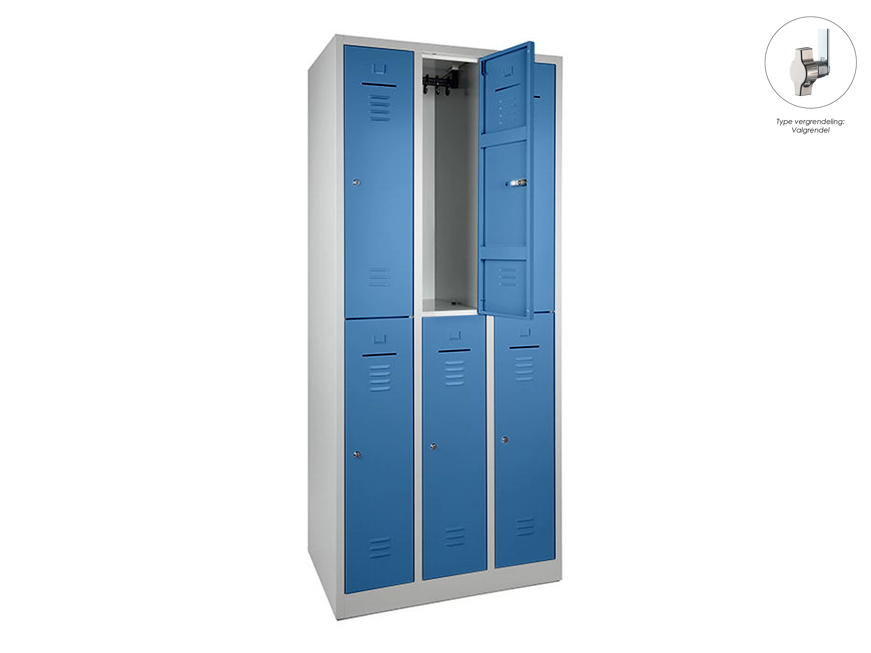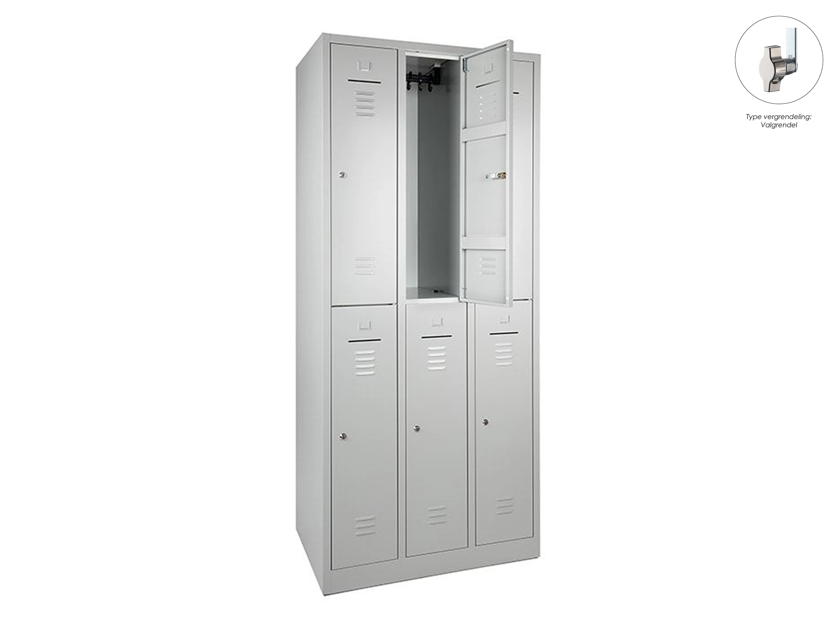 Lockerkast met 3 kolommen, en 6 deuren, elke locker is voorzien van een kledingstang met kledinghaken, afsluitbaar met een valvergrendeling