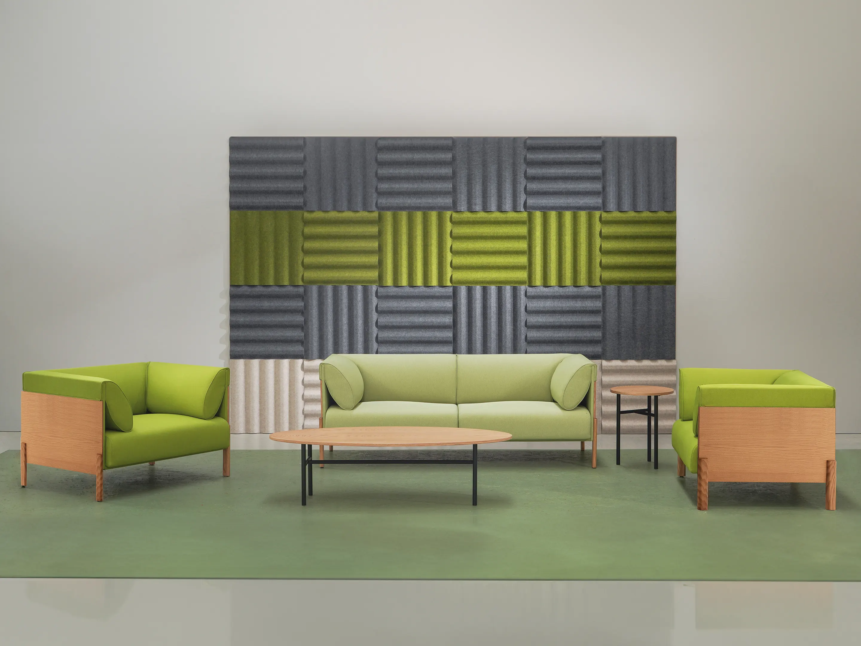 3-zits bank met zij en rugkussens. Lounge gedeelte is links geplaatst (vanuit zittende positie), achterzijde fineer. Afmeting: 267x150x69cm (BxDxH)