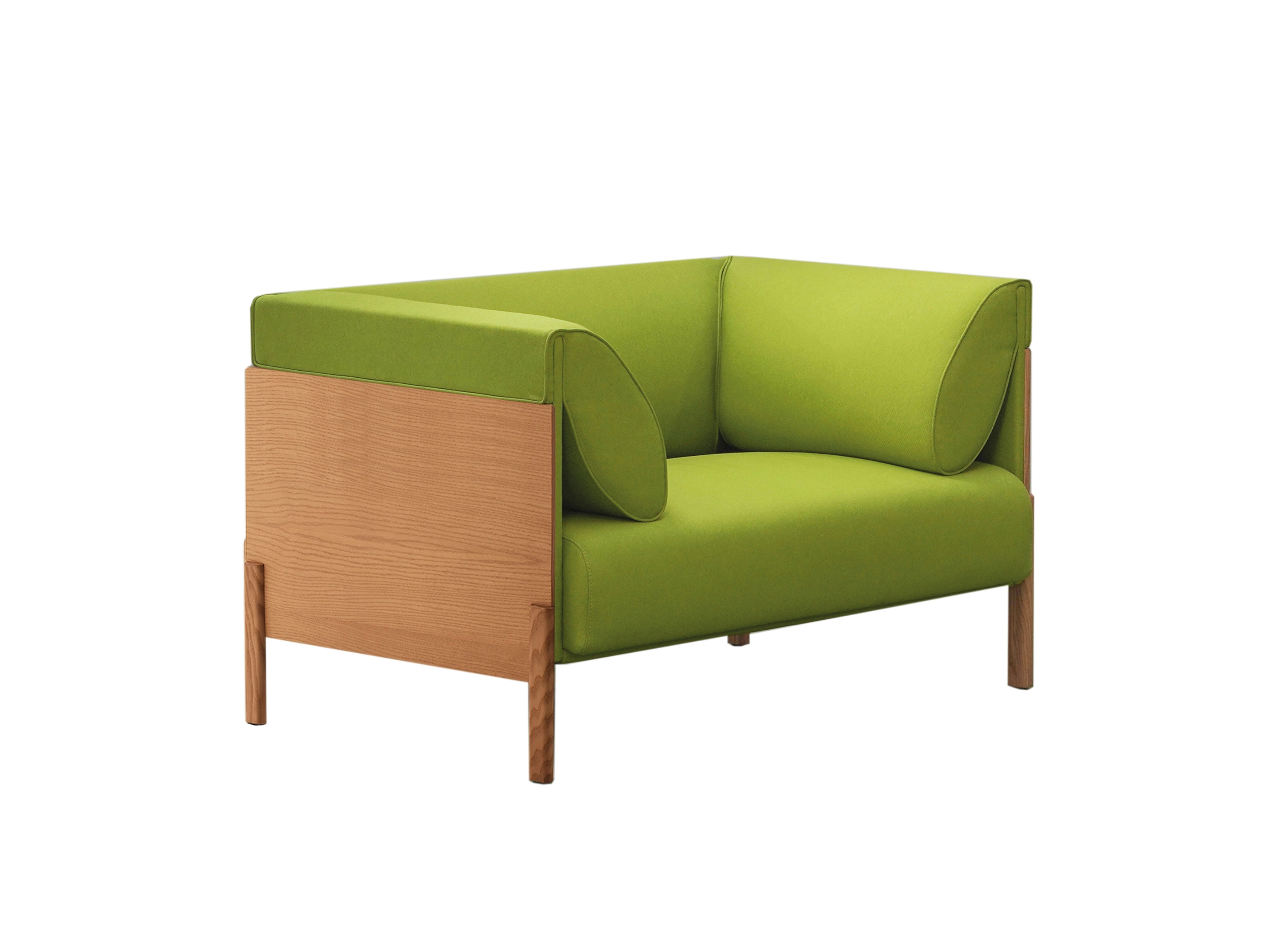 2-zits bank met zij en rugkussens. Achterzijde fineer. Afmeting: 180x80x69cm (BxDxH)