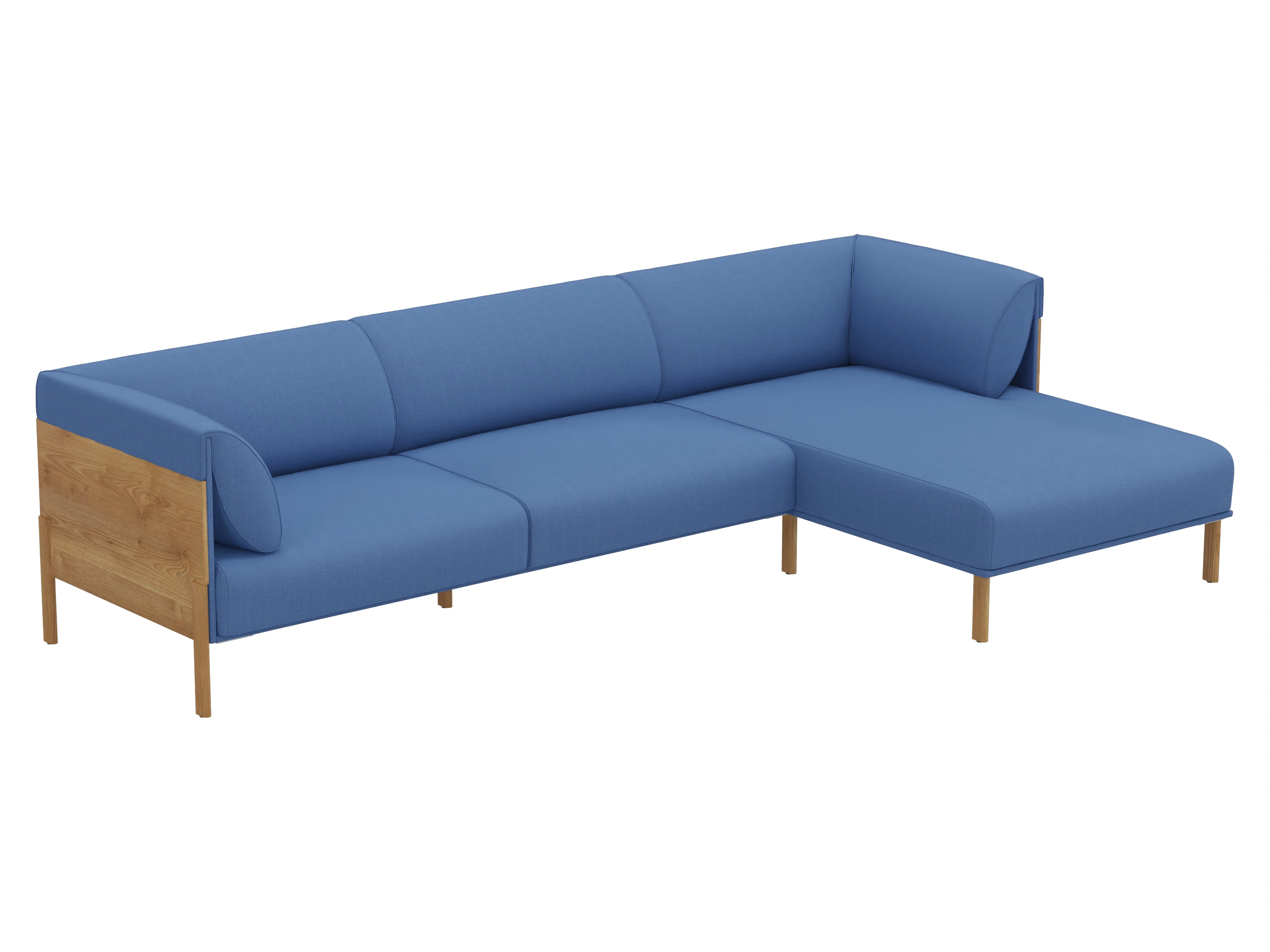 3-zits bank met zij en rugkussens. Lounge gedeelte is rechts geplaatst (vanuit zittende positie), achterzijde fineer. Afmeting: 267x150x69cm (BxDxH)