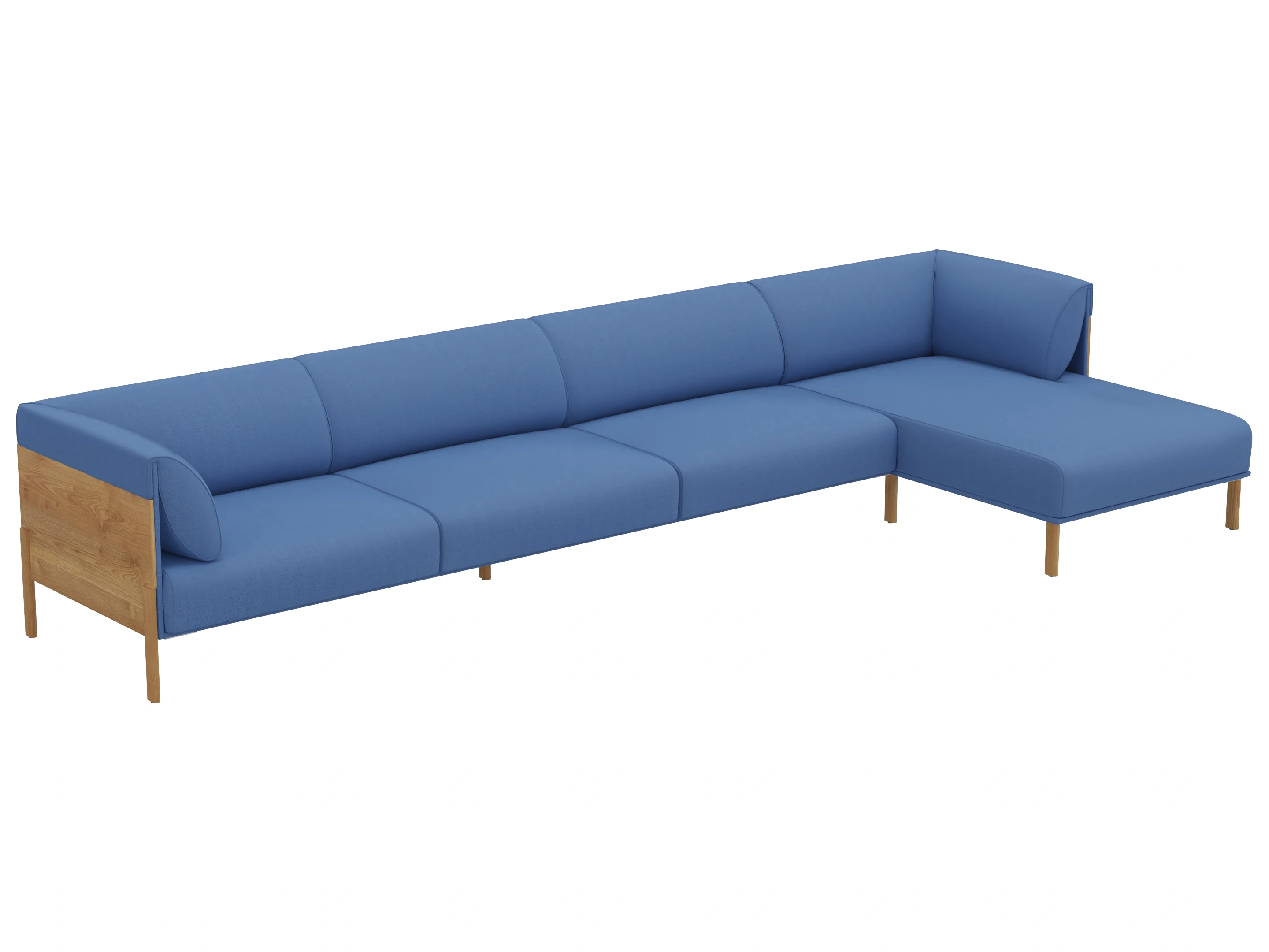 4-zits bank met zij en rugkussens. Lounge gedeelte is rechts geplaatst (vanuit zittende positie), achterzijde fineer. Afmeting: 357x150x69cm (BxDxH)