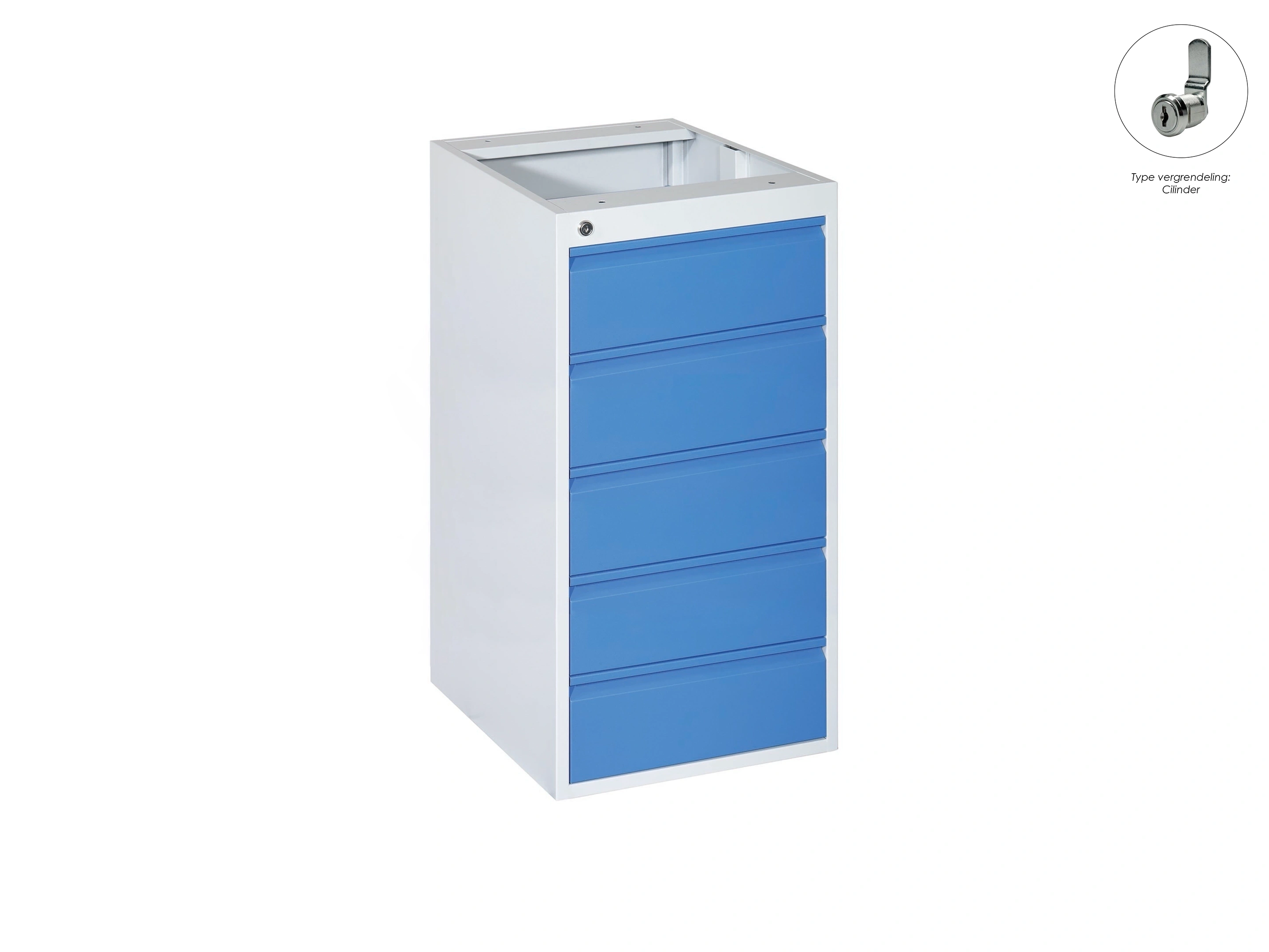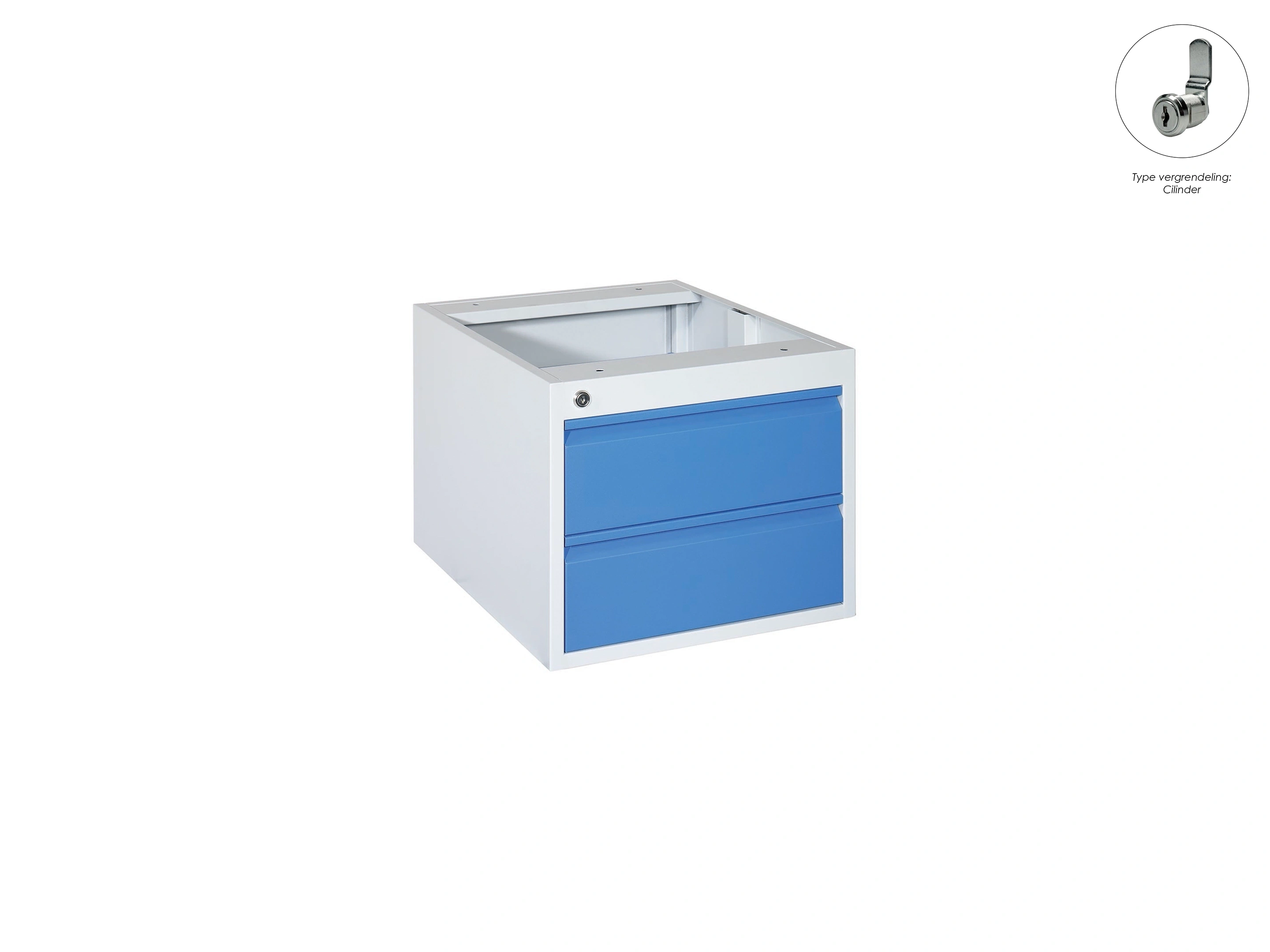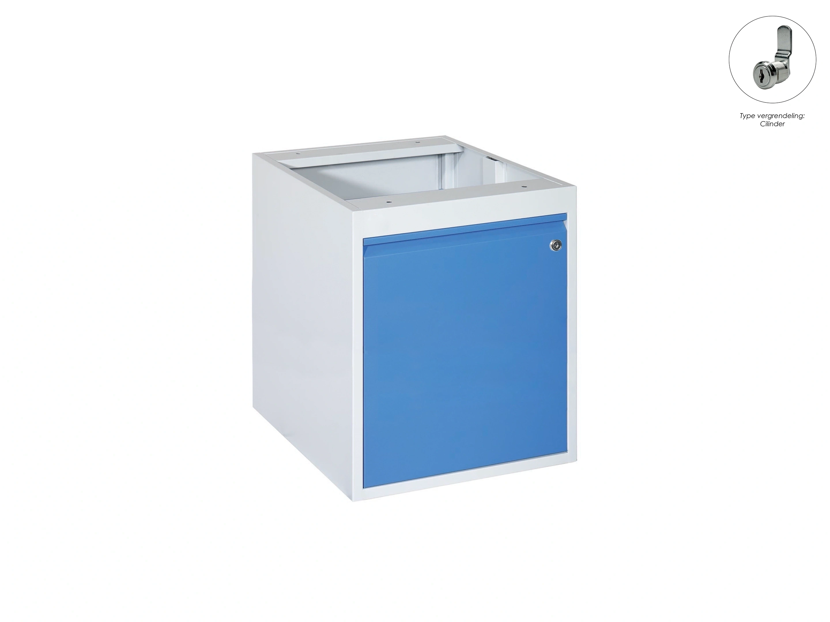Kleur romp: Grijs (RAL7035). Kleur lade: Blauw (RAL5010). Incl. cilinderslot