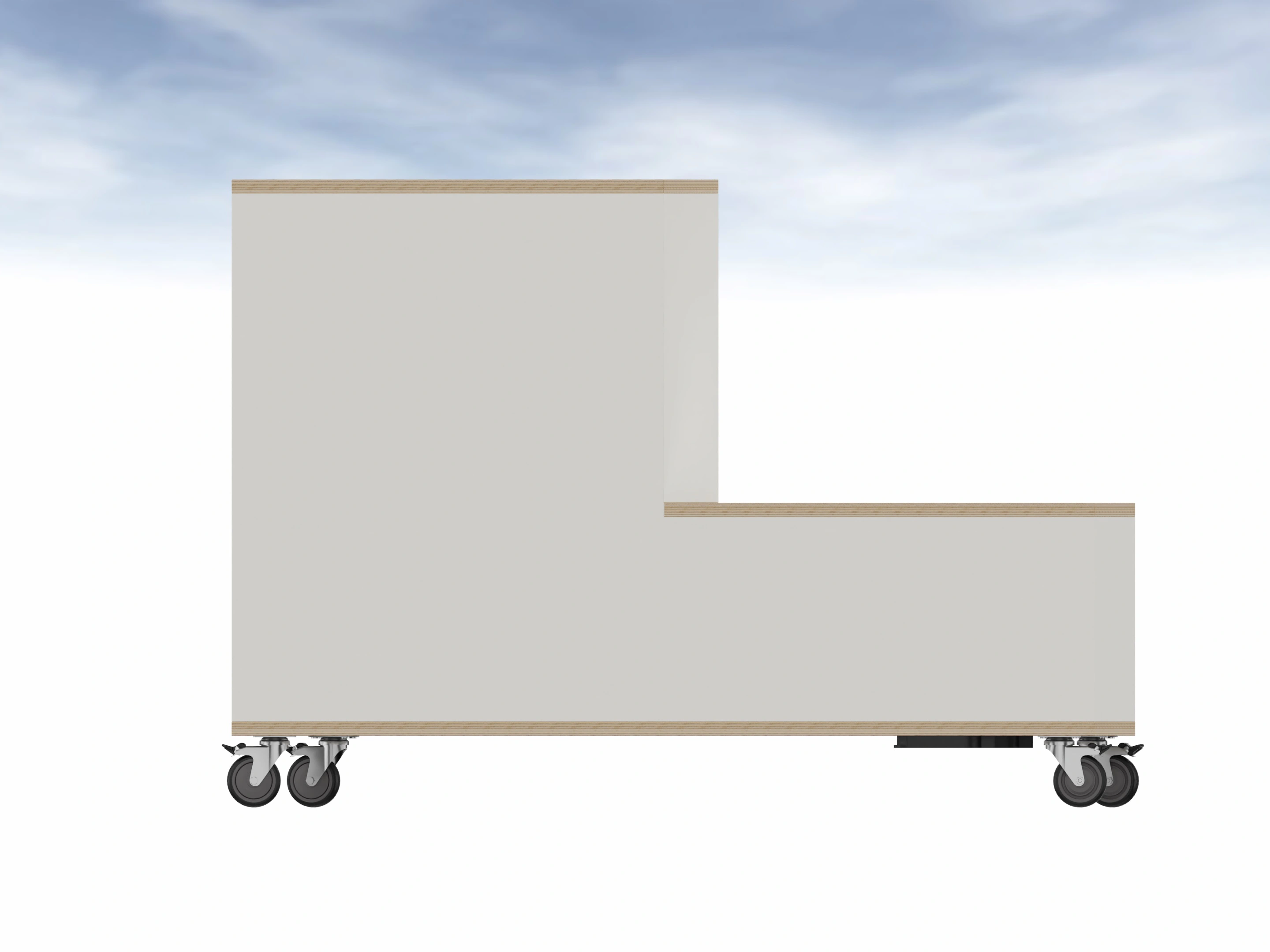 Verrijdbaar en koppebaar zitelement met twee niveaus. Uit MDF met melamine toplaag en berken multiplexrand. Afmeting: 850mmx735mmx1180mm (HxBXD). Flexibel toepasbaar, binnenruimte van de elementen kan helemaal naar wens als opbergruimte gebruikt worden.