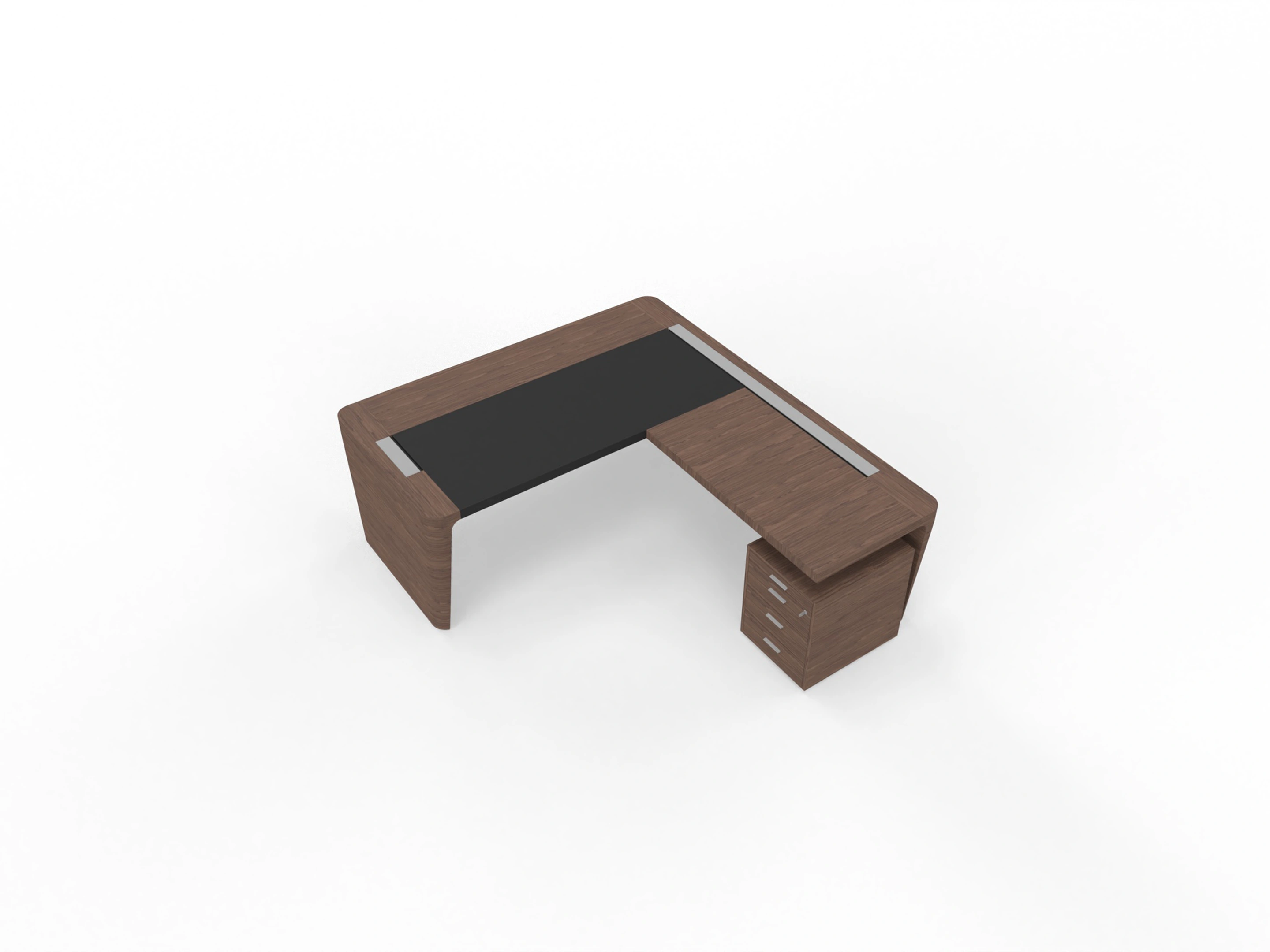 Hoekbureau met aanbouw rechts volledig vervaardigd uit fineer. Maatvoering: 210(B)x220(D)x76(H)cm. Standaard voorzien van slimme kabelmanagement, volledig verborgen.