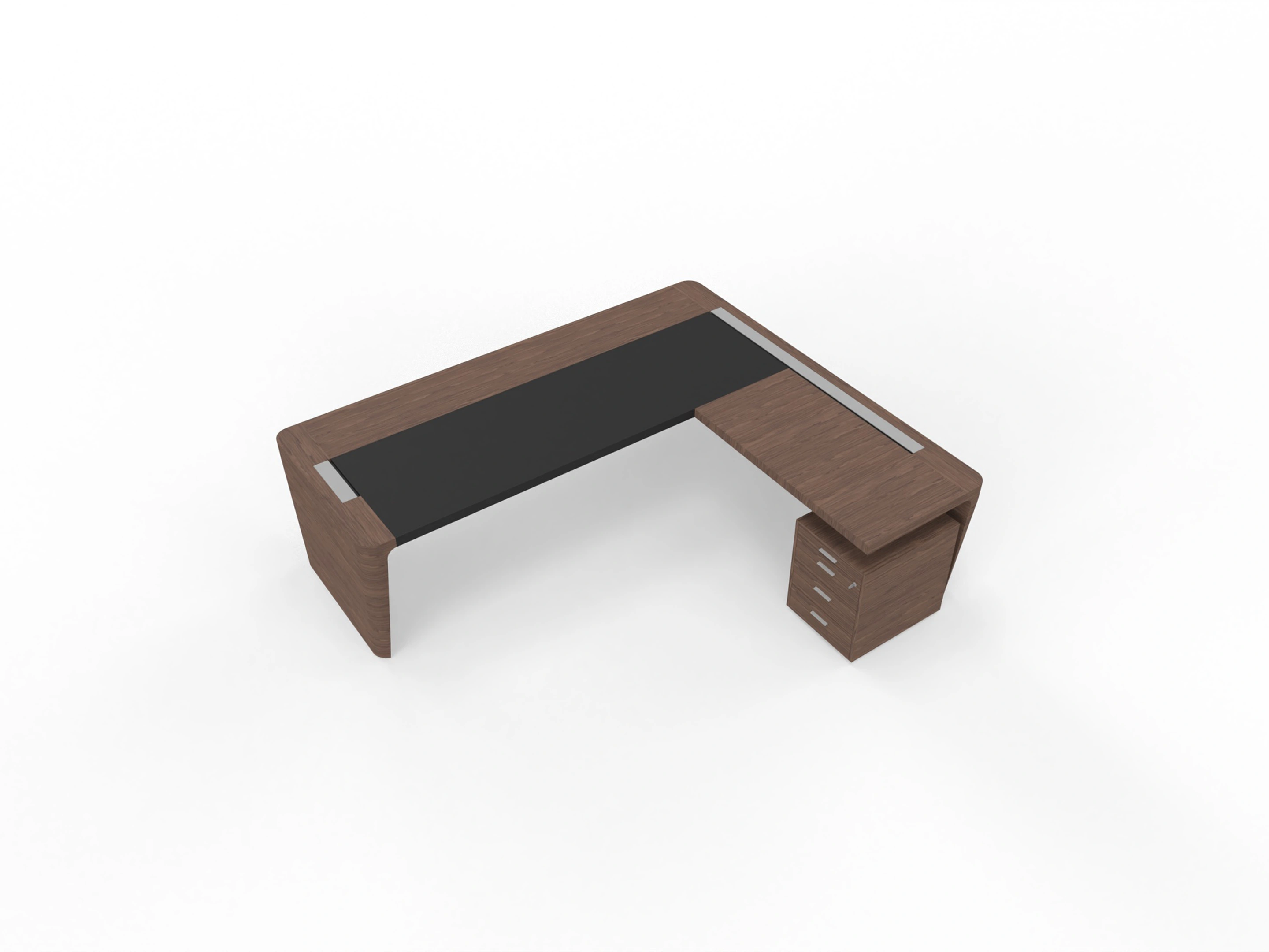 Hoekbureau met aanbouw links volledig vervaardigd uit fineer. Maatvoering: 190(B)x220(D)x76(H)cm. Standaard voorzien van slimme kabelmanagement, volledig verborgen.