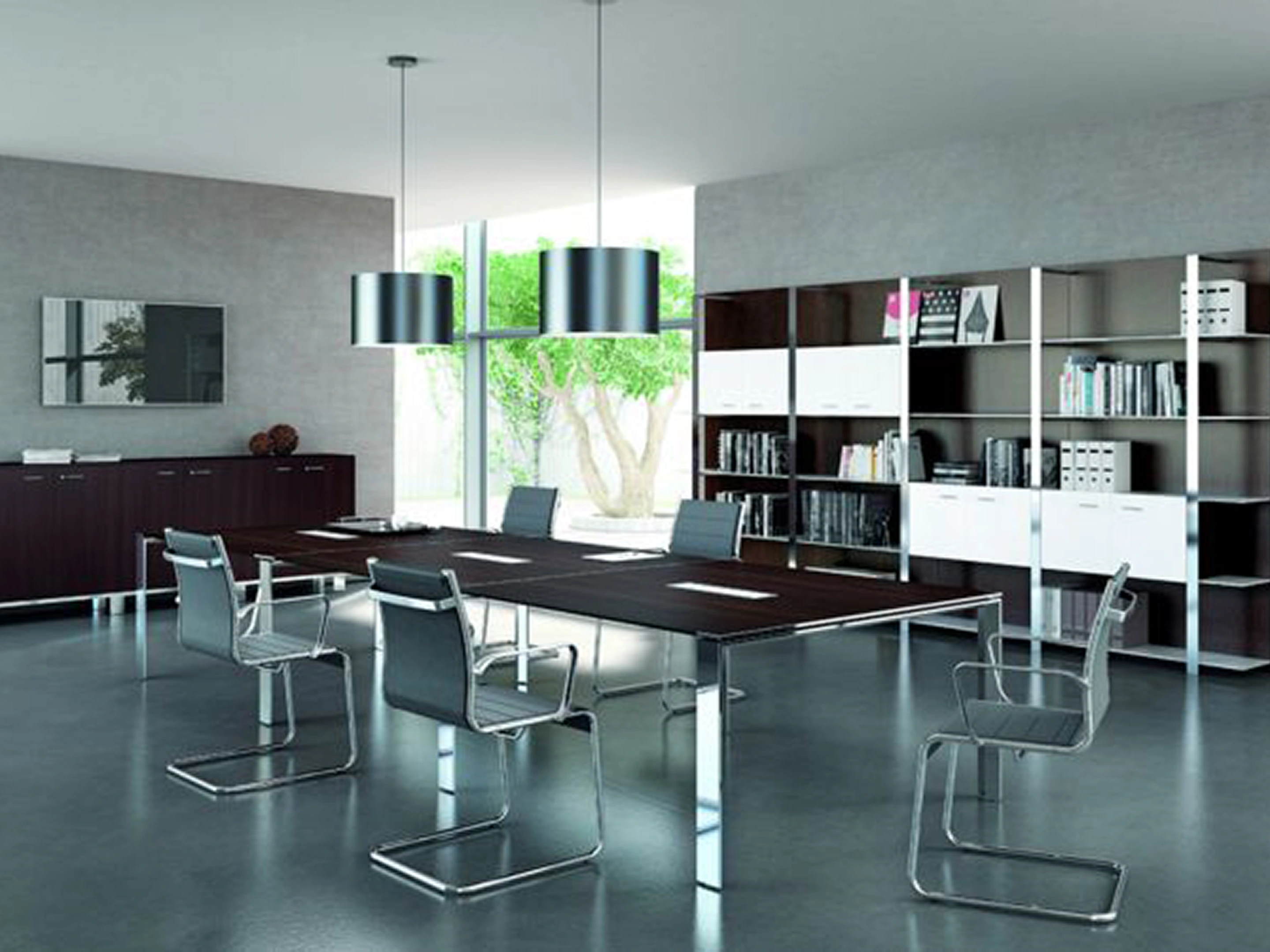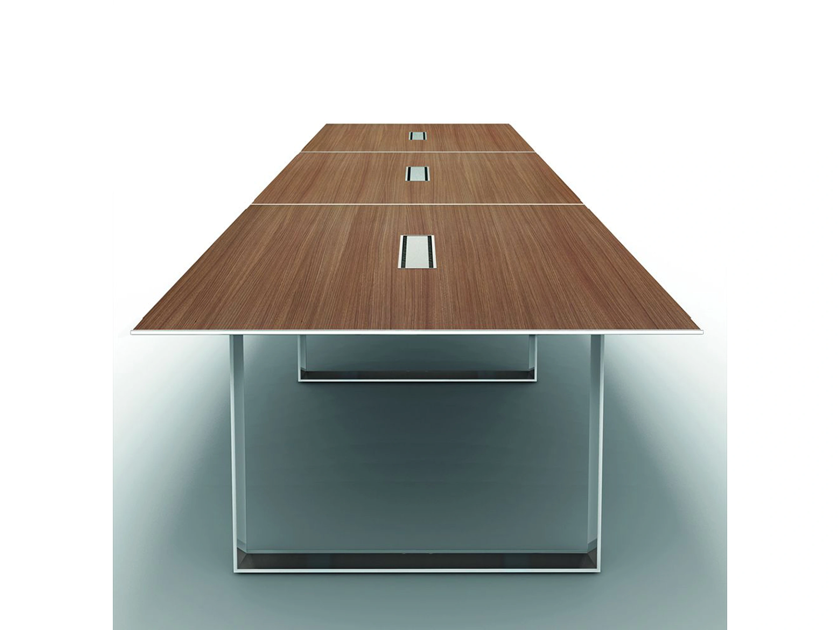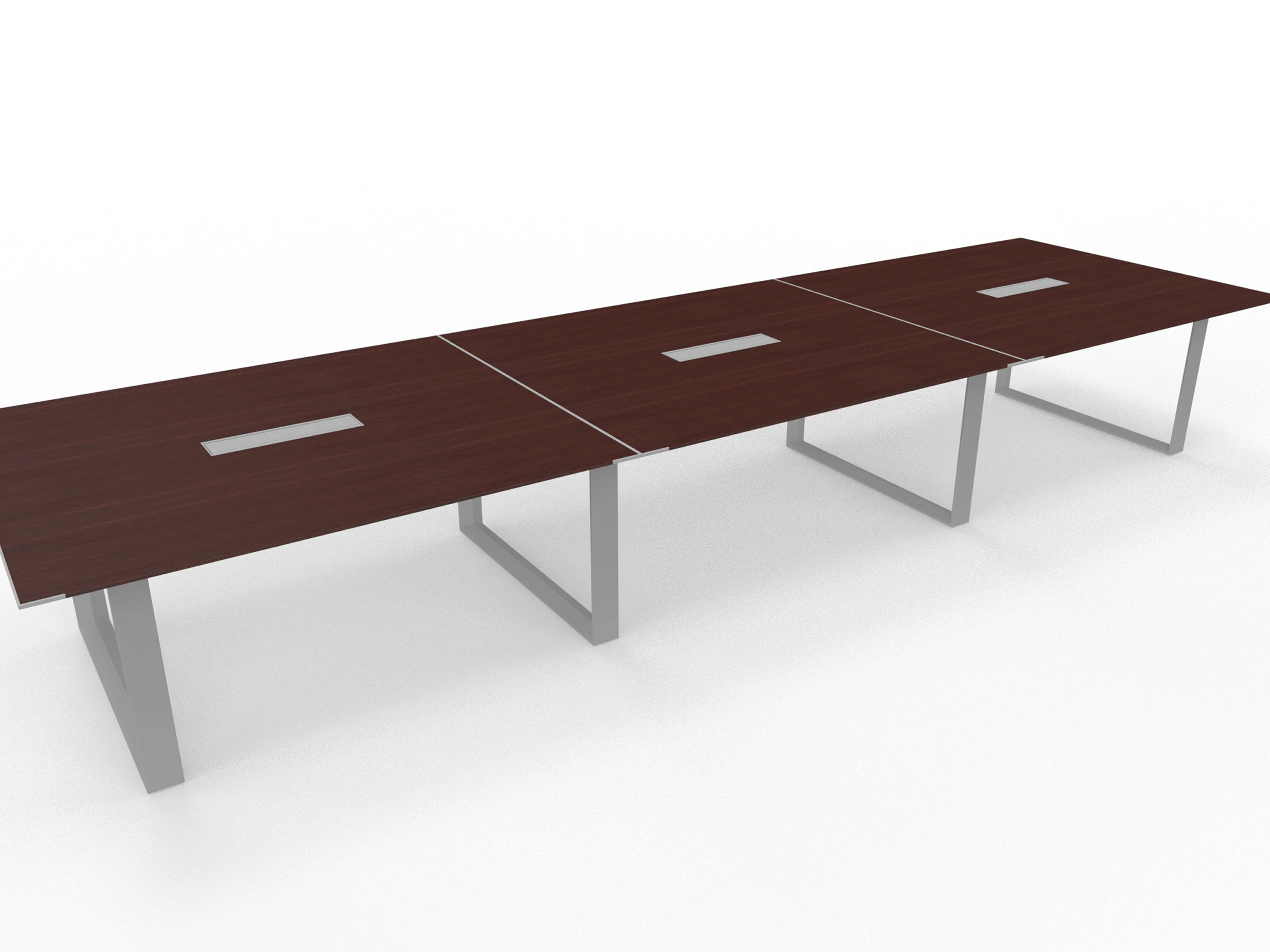 480x140cm vergadertafel van 75cm hoog op een chrome ringpoot frame met 3 melamine tafelbladen van 160x140cm voorzien van 3 kabelkleppen, een in het midden van elk blad.
