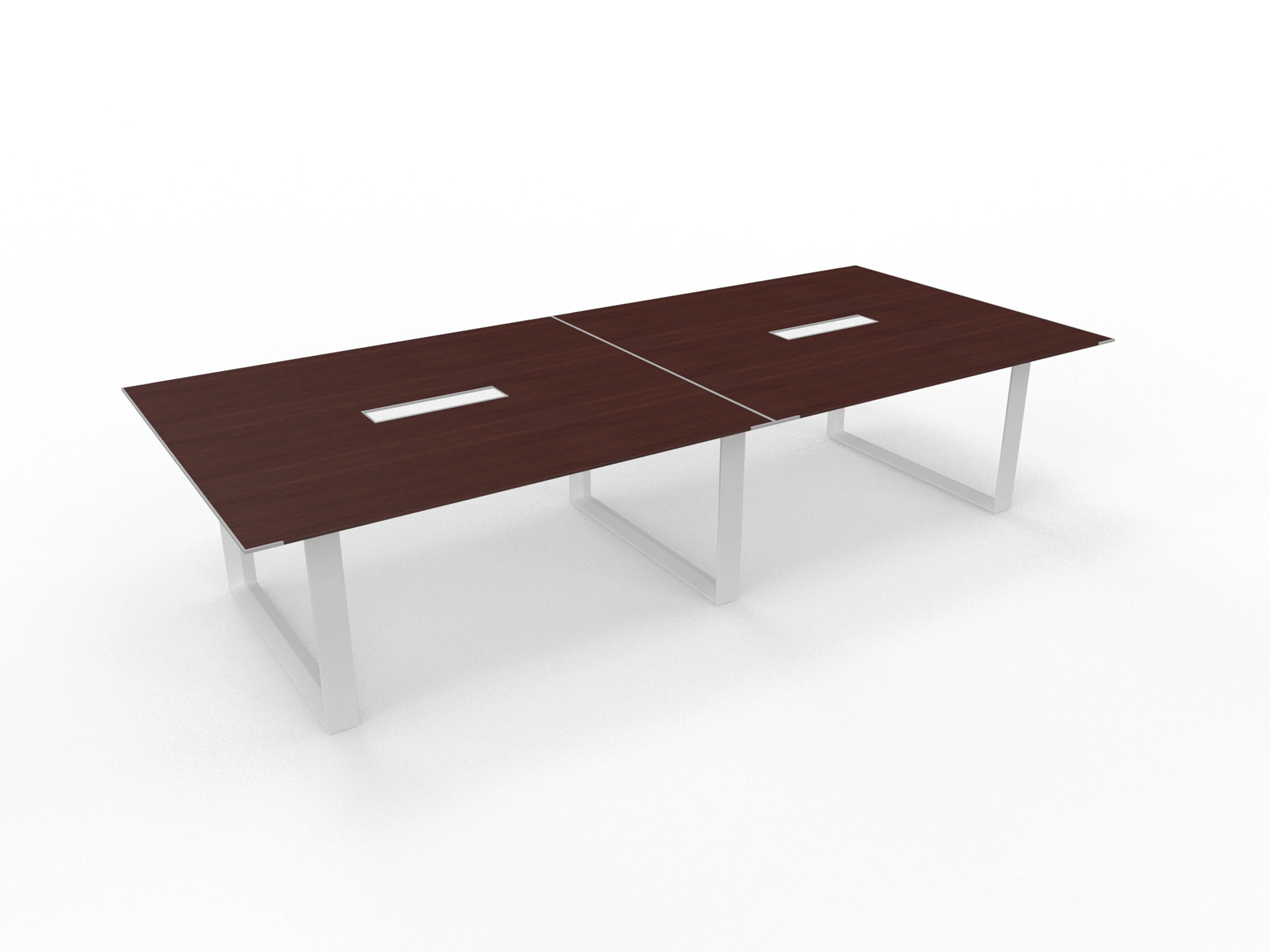280x140cm vergadertafel van 75cm hoog op een witte 6-poots frame met 2 melamine tafelbladen van 140x140cm voorzien van 2 kabelkleppen, een in het midden van elk blad.