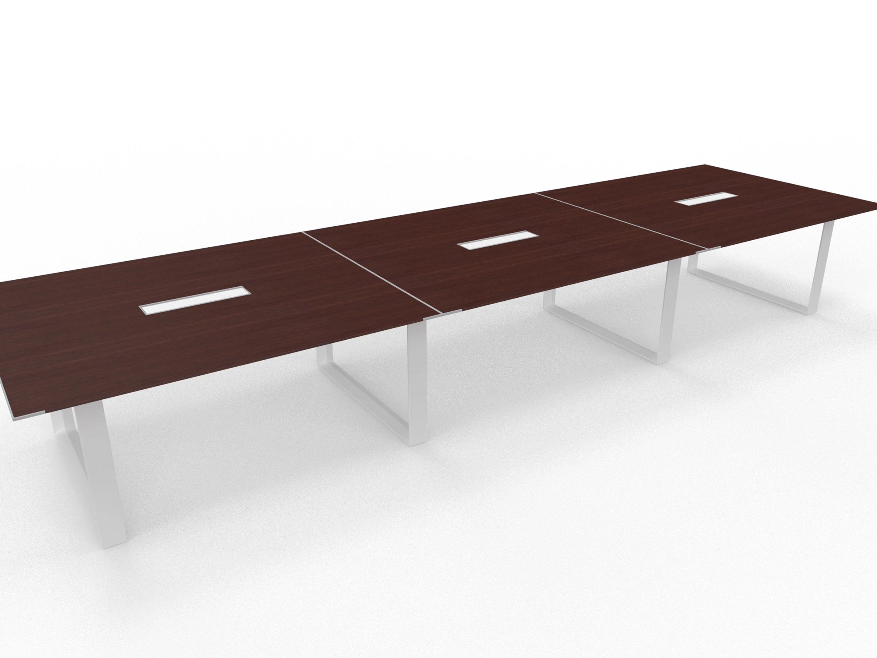 480x140cm vergadertafel van 75cm hoog op een witte ringpoot frame met 3 melamine tafelbladen van 160x140cm voorzien van 3 kabelkleppen, een in het midden van elk blad.