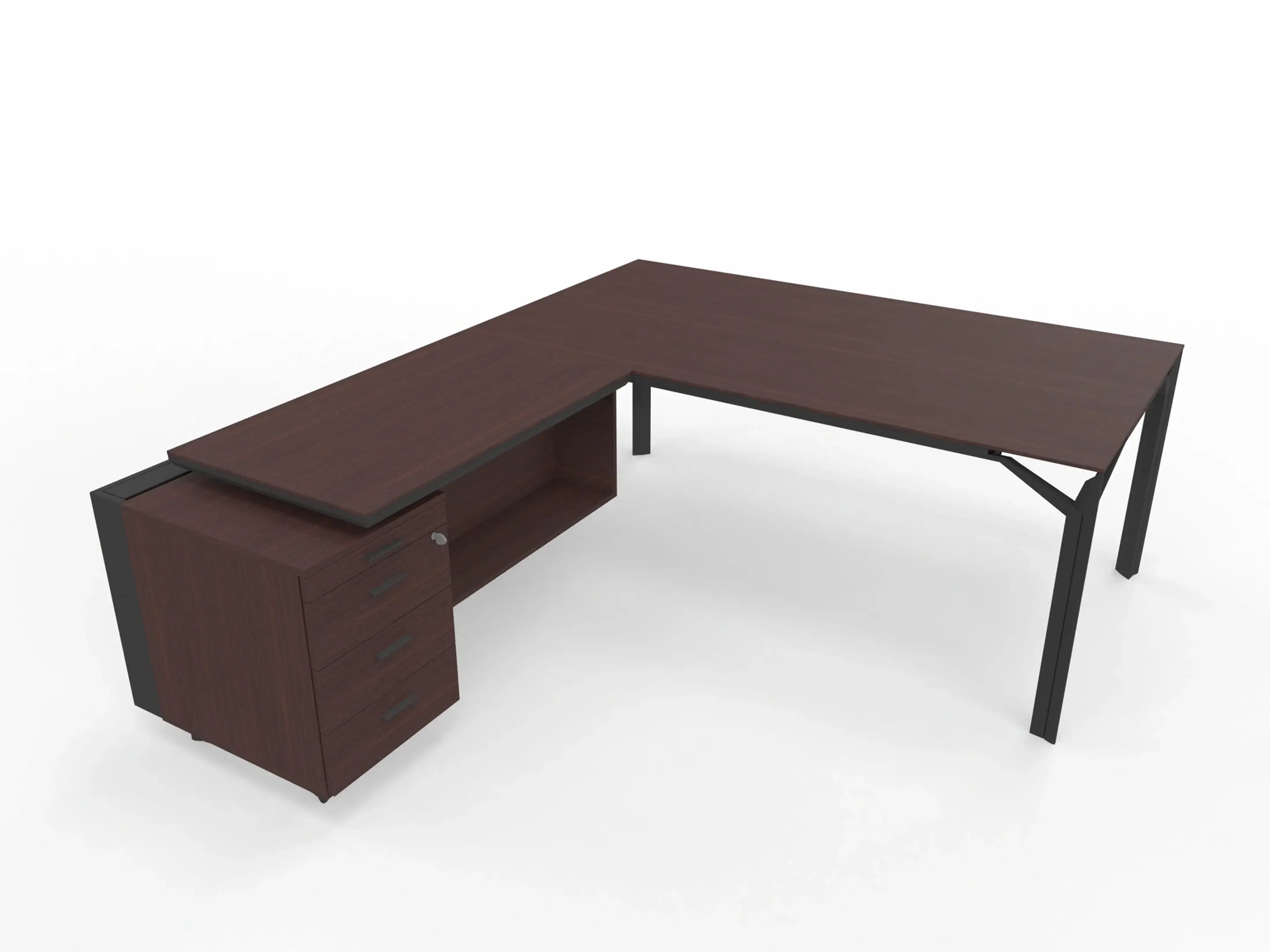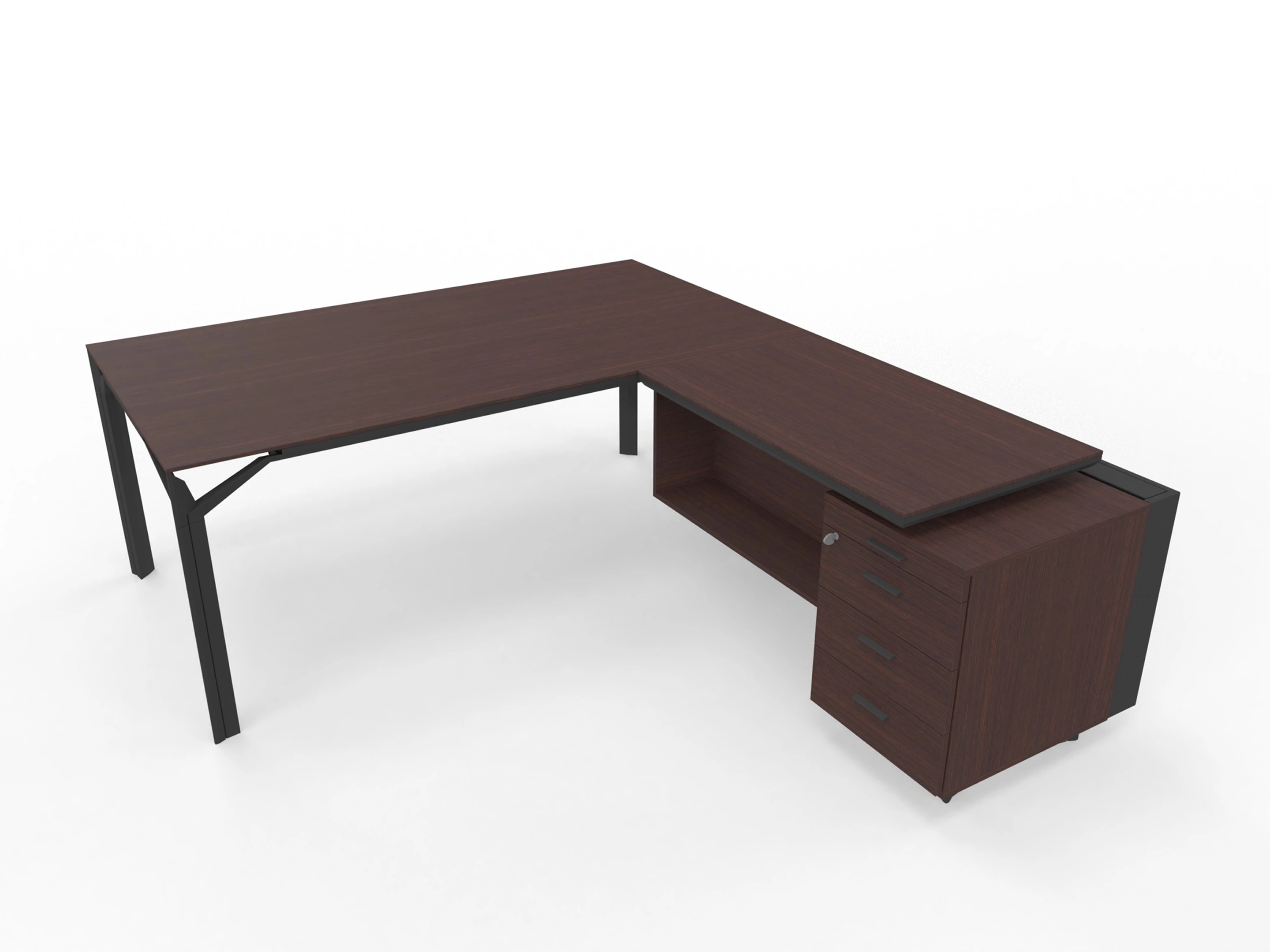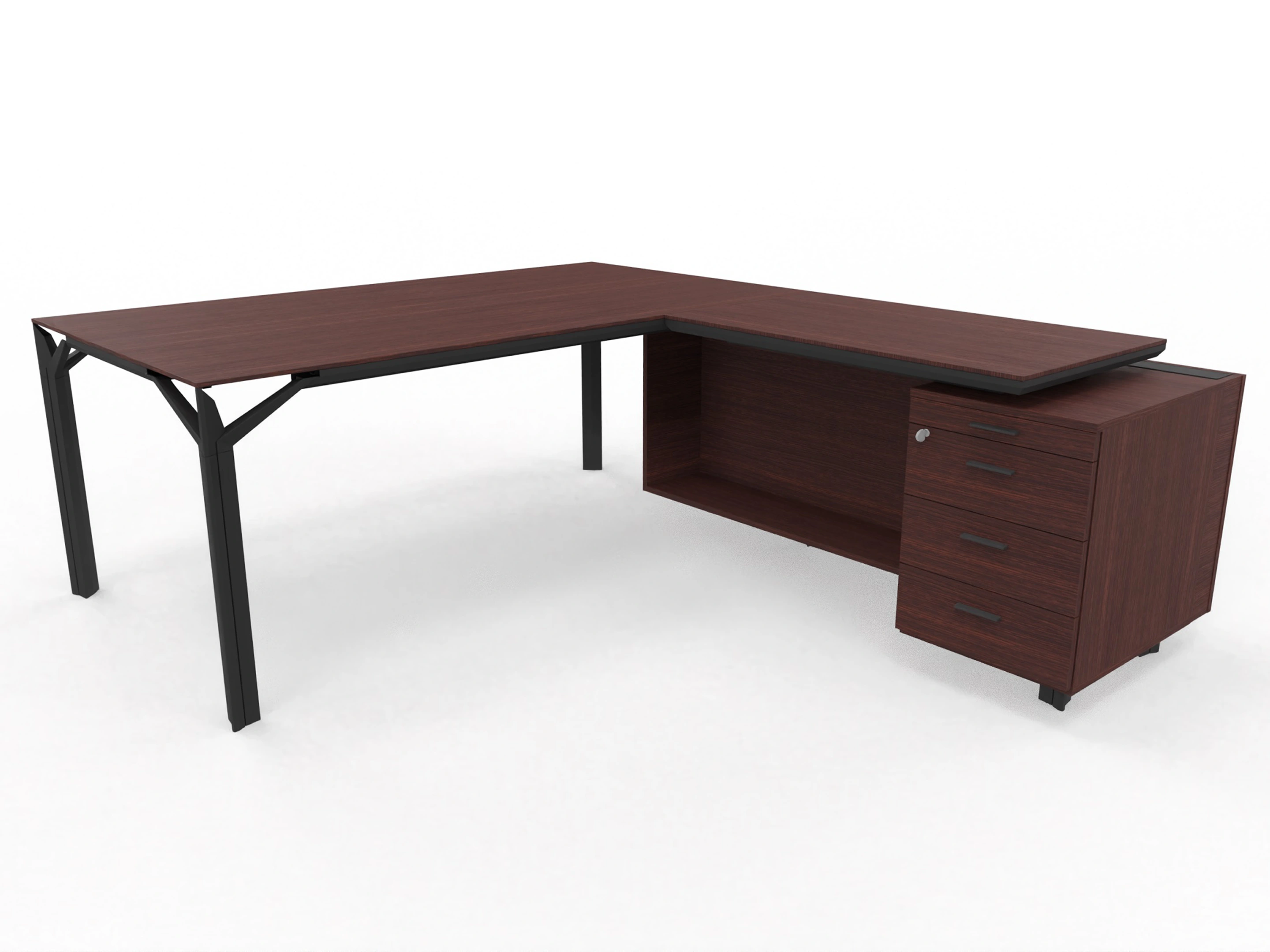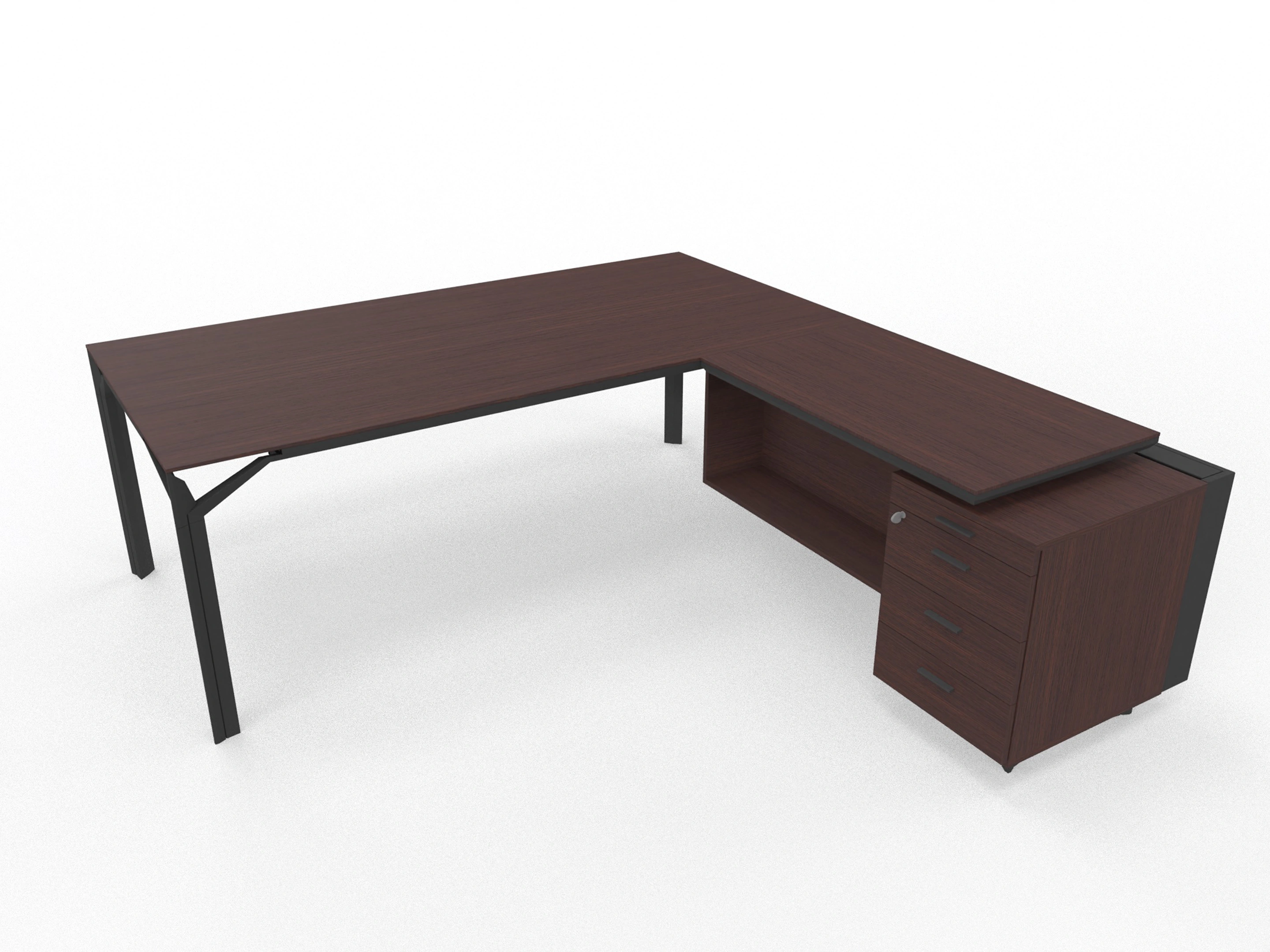 Bureau incl. aanbouw rechts, van 211x214cm (BxD) en 75cm hoog, met aanbouw kast met metalen designpaneel met 3+1 ladenblok en kabelklep met softclose, op een 4-poots frame met een melamine blad.