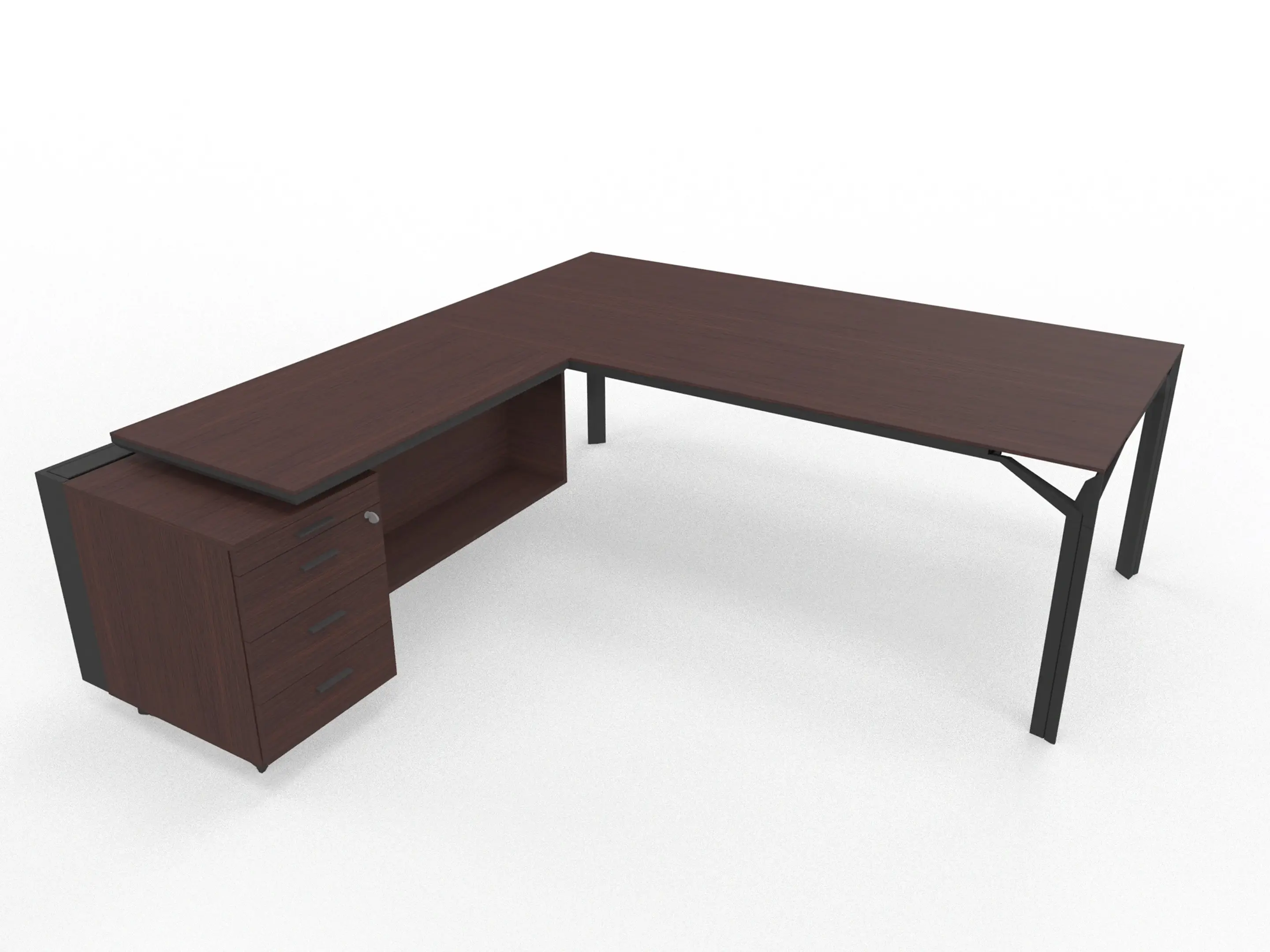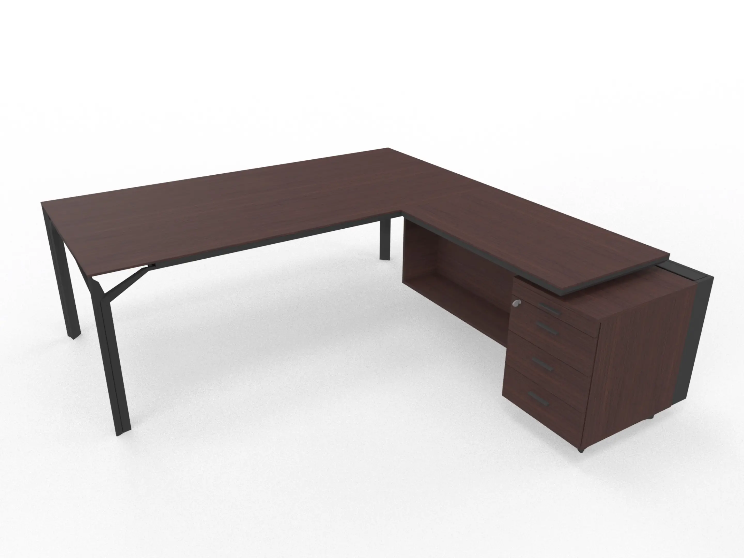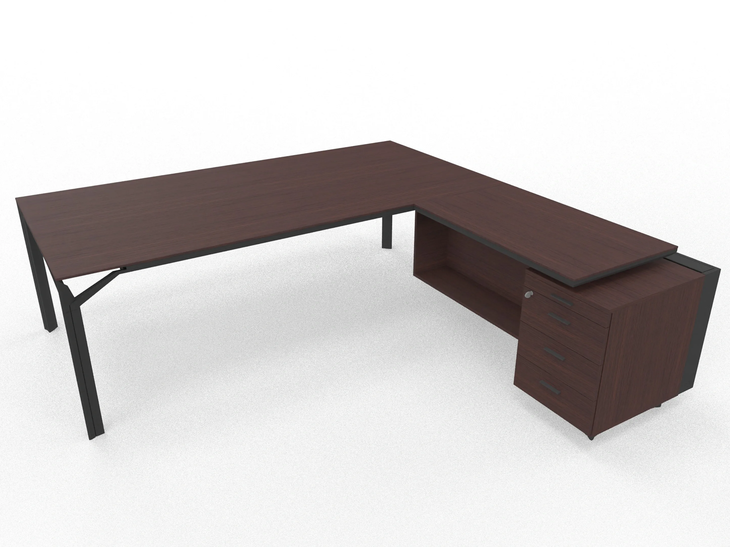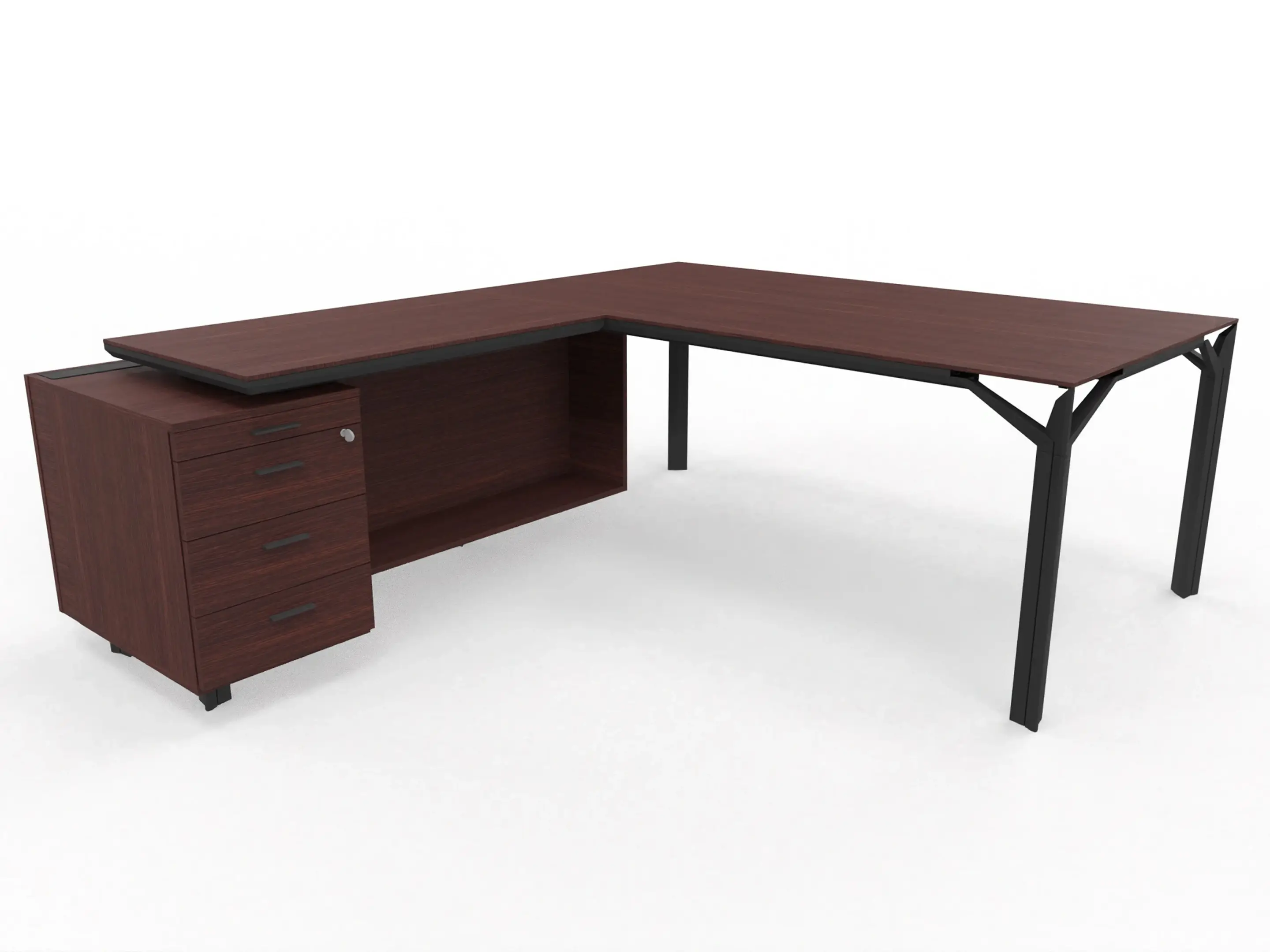 Bureau incl. aanbouw rechts, van 211x214cm (BxD) en 75cm hoog, met aanbouw kast met metalen designpaneel met 3+1 ladenblok en kabelklep met softclose, op een 4-poots frame met een melamine blad.